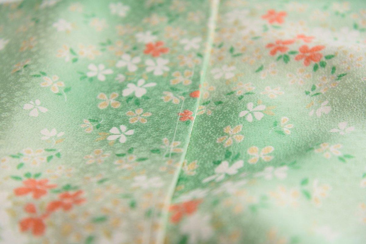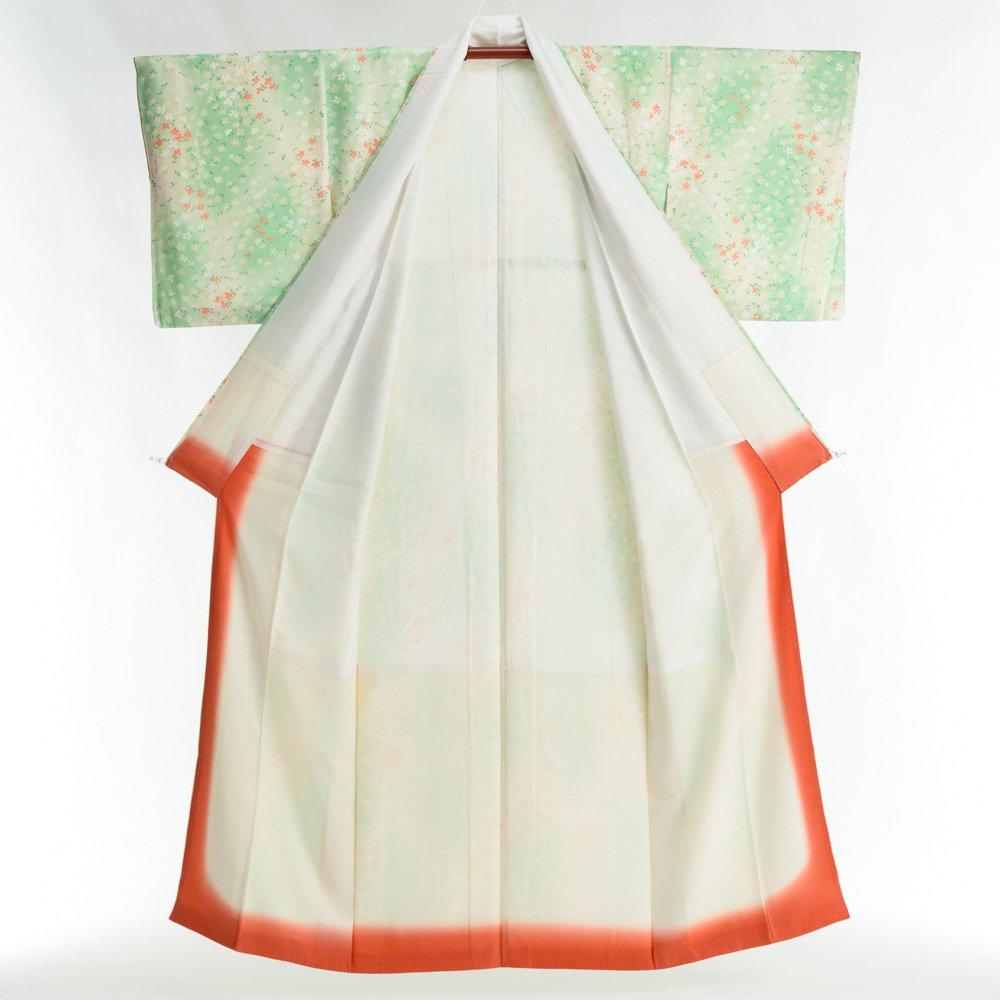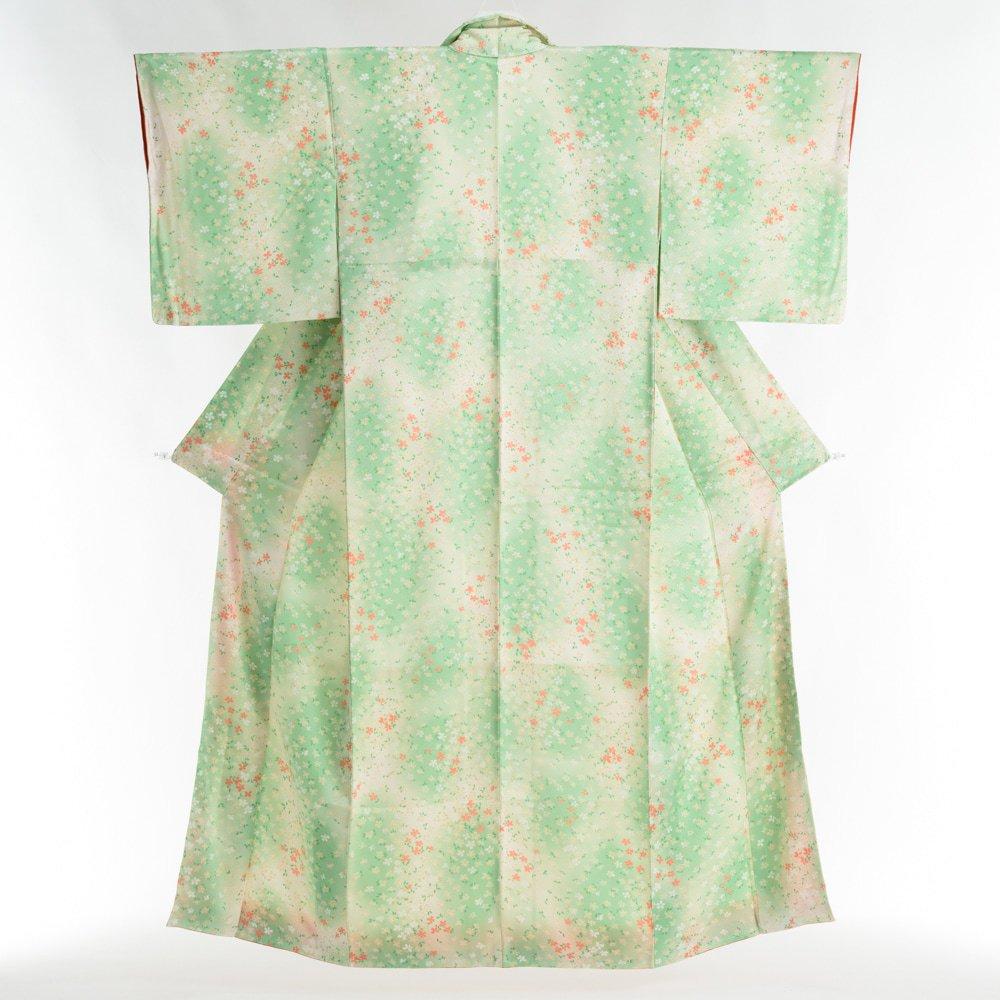 白と黄緑の暈し地に小さな小花を散らした小紋の着物です。