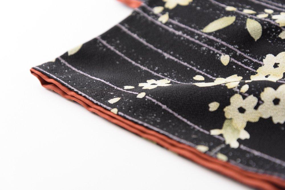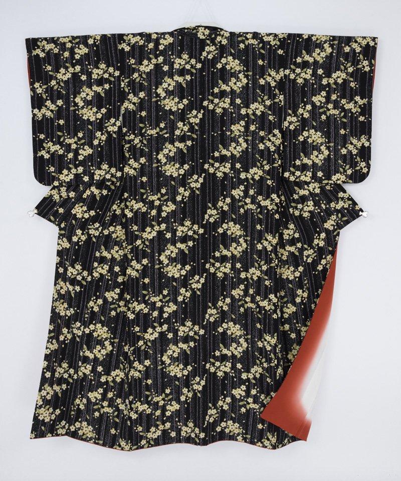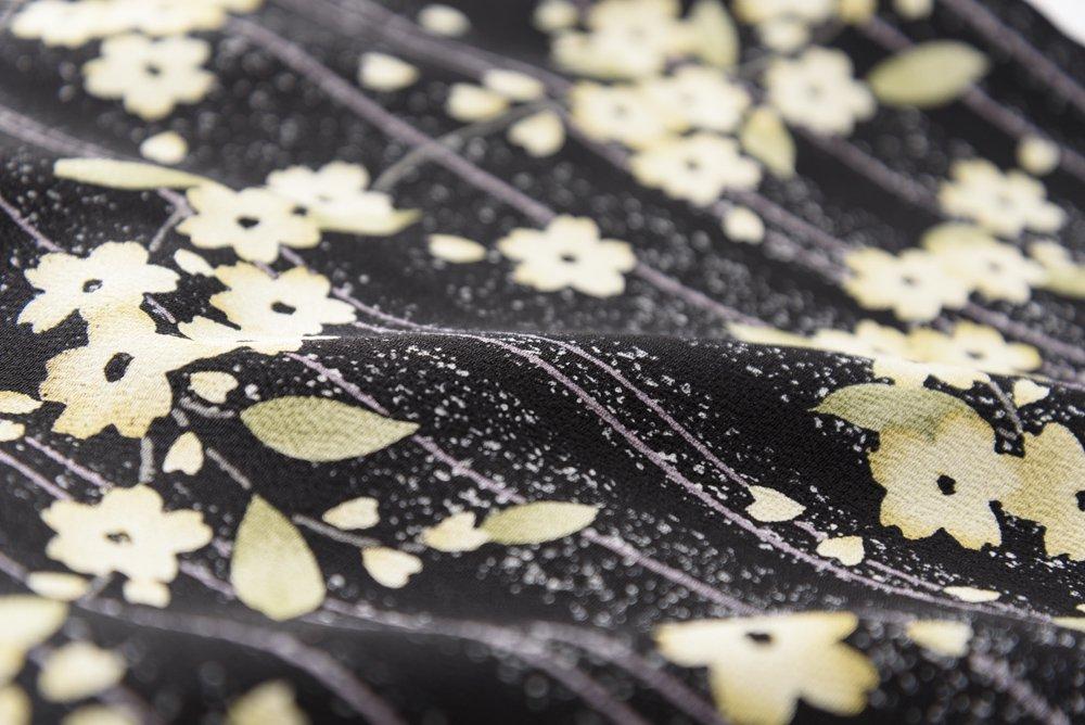 黒地に細い縞と黄色い桜を染めた小紋の着物です。
