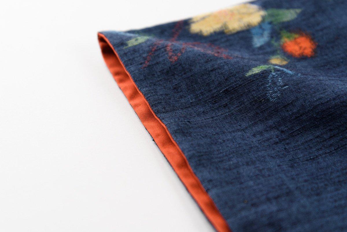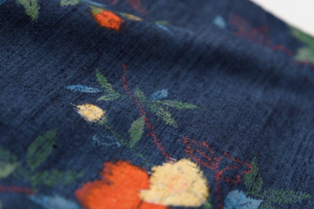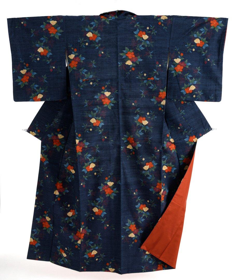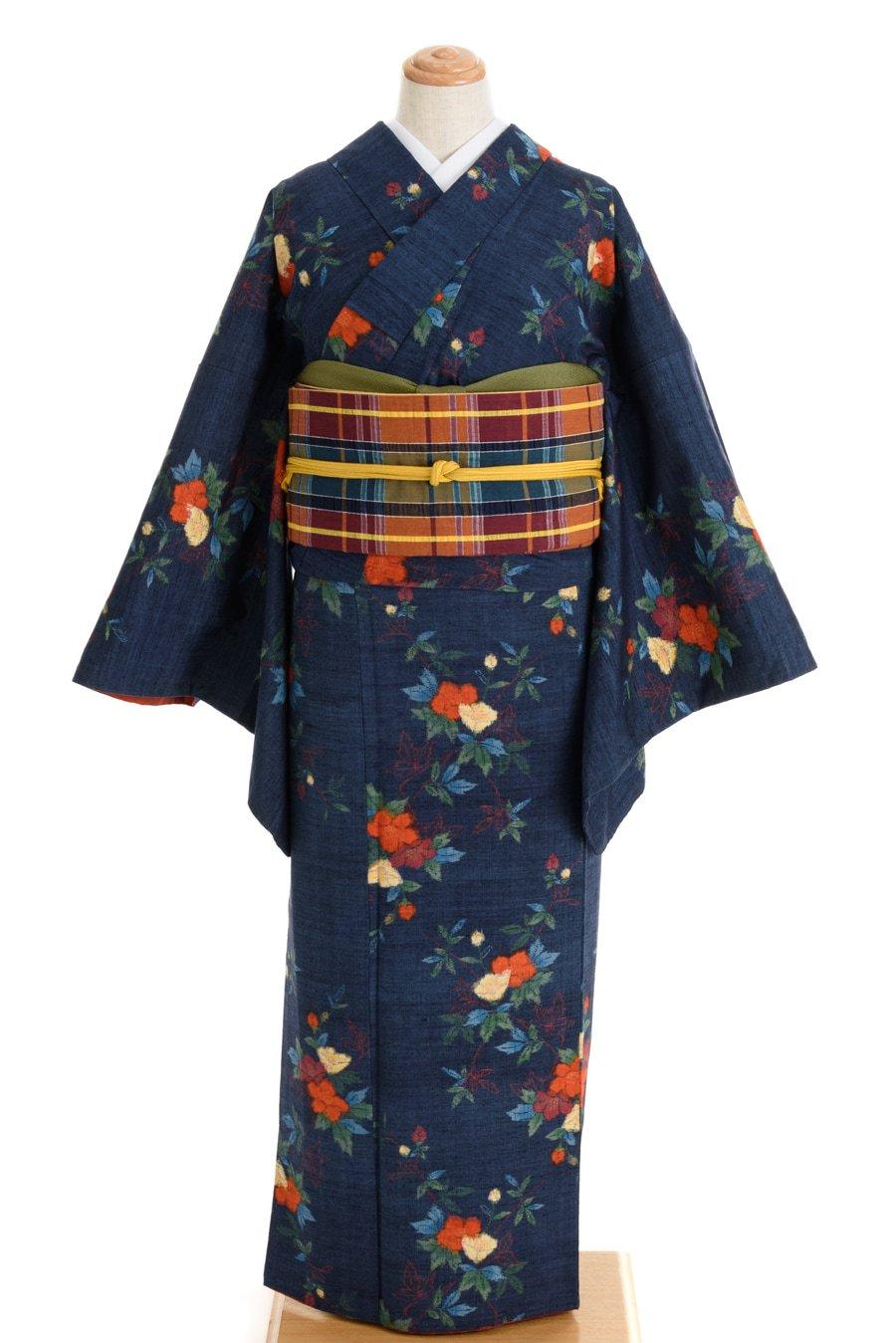 紺地にクリーム色、朱色、濃赤色の花を織り出した紬の着物です。