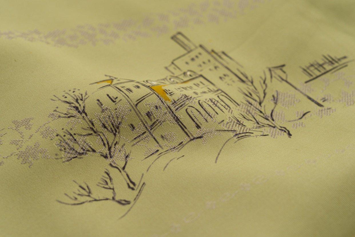 長い煙突の伸びる建物や街路樹などが緻密に描かれた珍しい着物ですよ。
