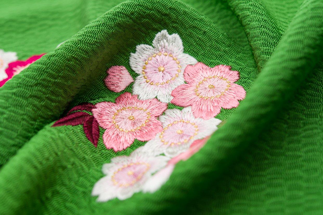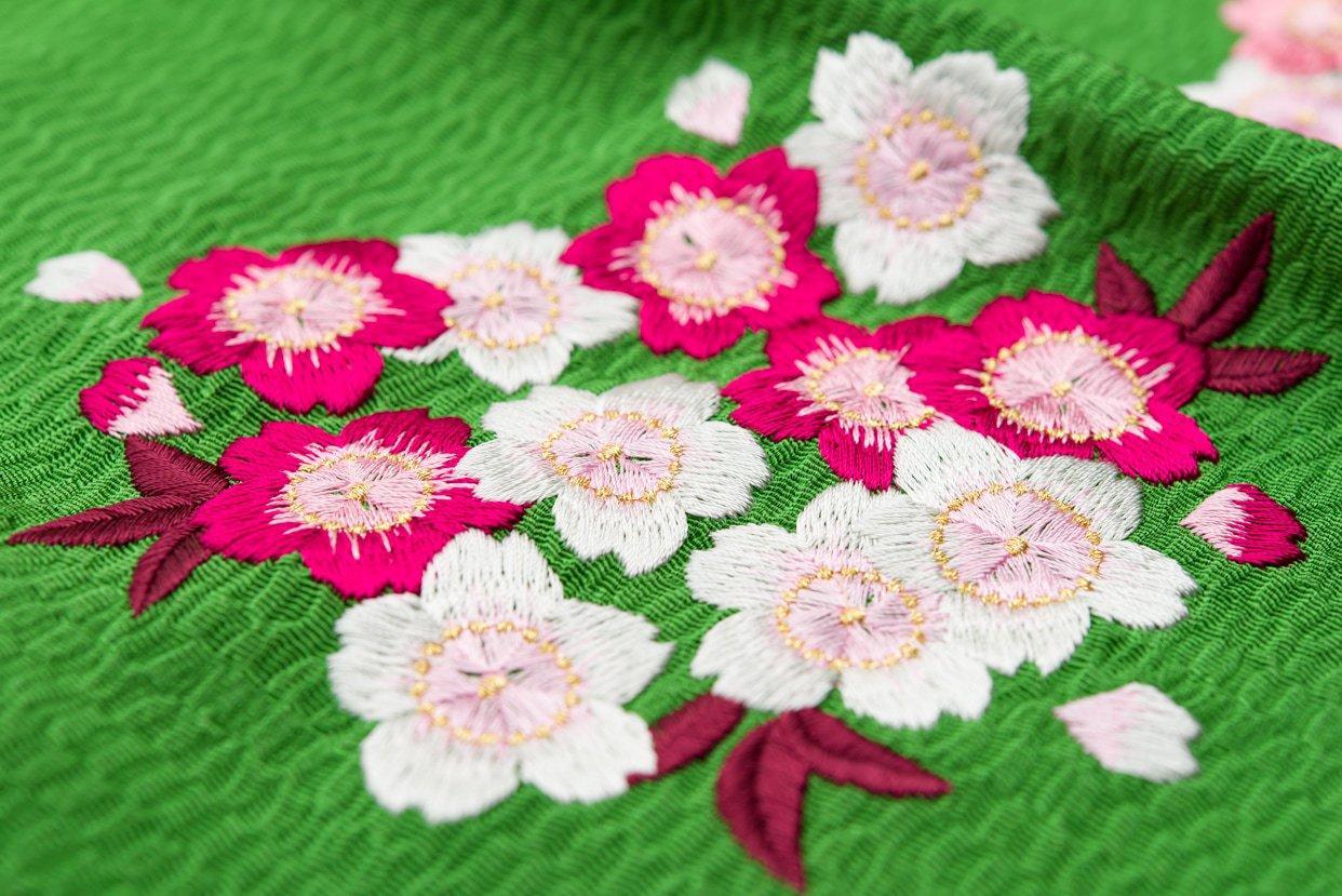 こっくりとしたグリーンの地に小ぶりの桜を刺繍した正絹帯揚げです。ブーケみたいにぎゅっと集まった桜が愛らしいですね。振袖に合わせてお使いいただくのがおすすめです。---------≪詳細≫素材:正絹状態:新品----------