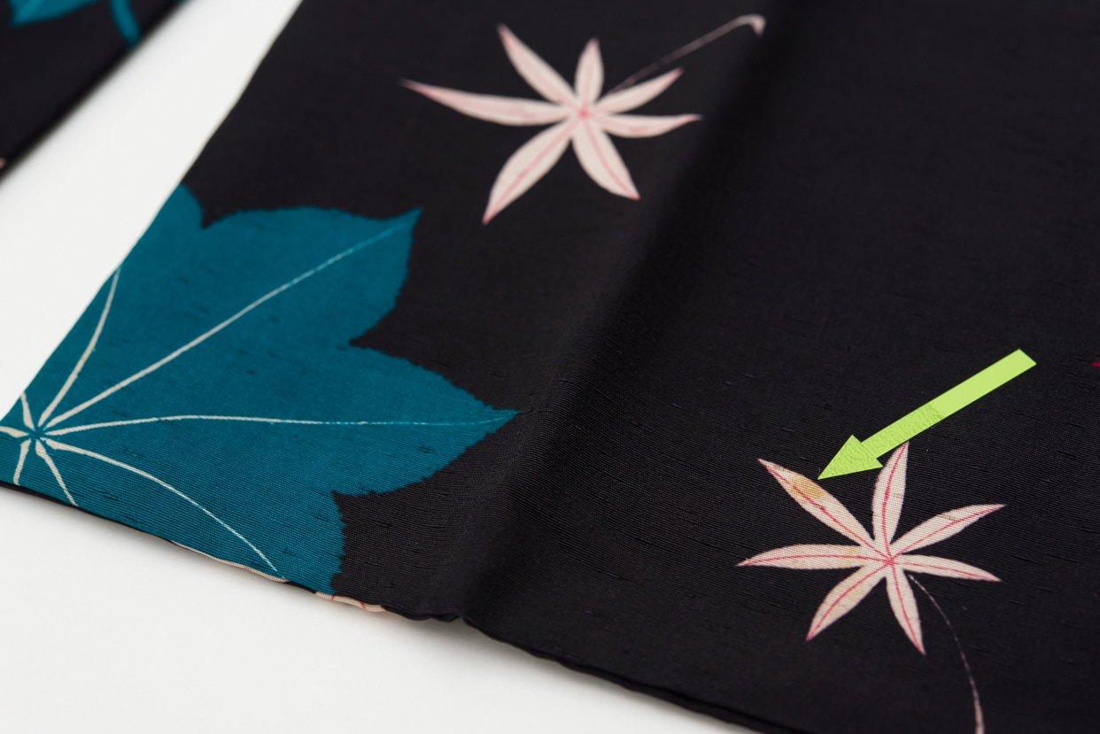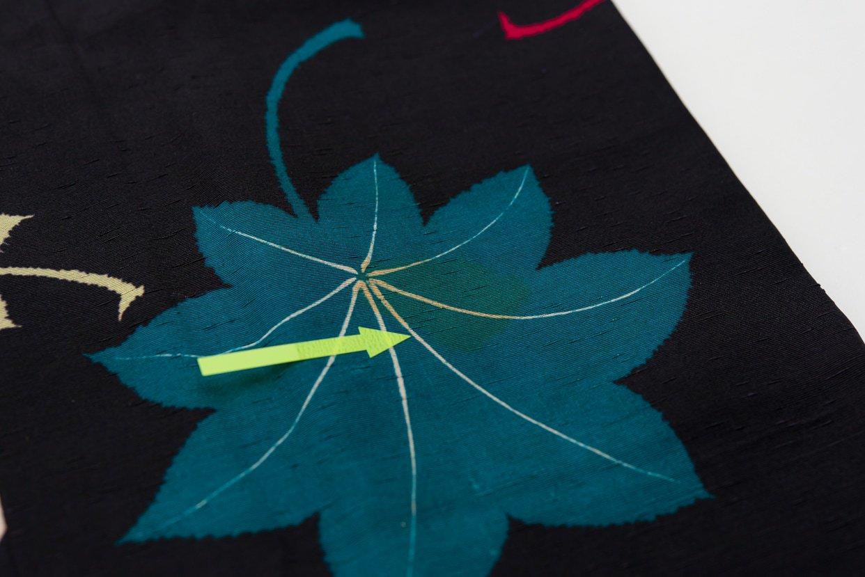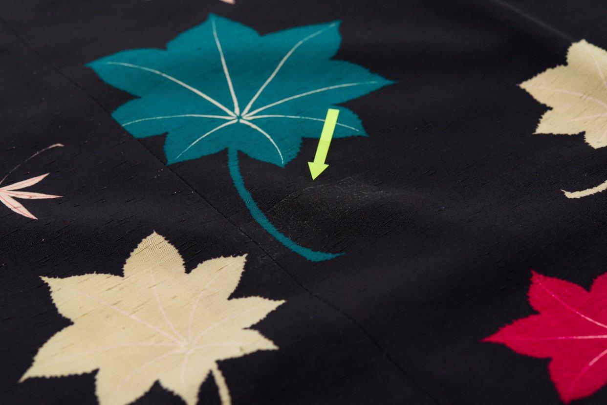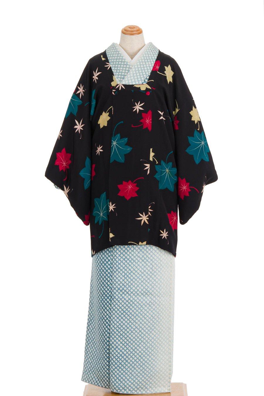 黒地にカラフルな色彩で大小のもみじを染めたアンティークの道行コートです。
