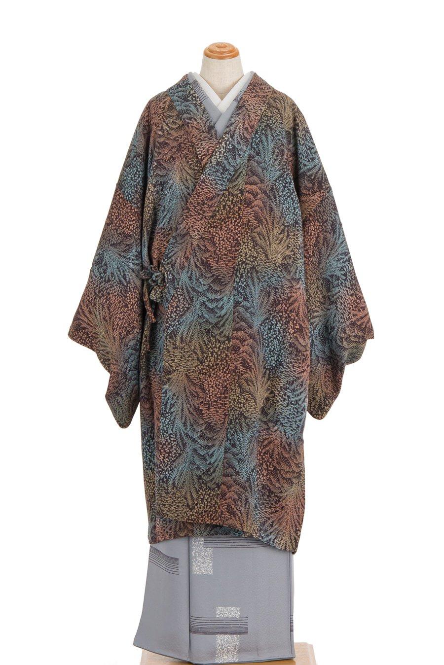 焦げ茶地に梅、柳、竹などの柄を細かく染めたロング丈の道中着です。