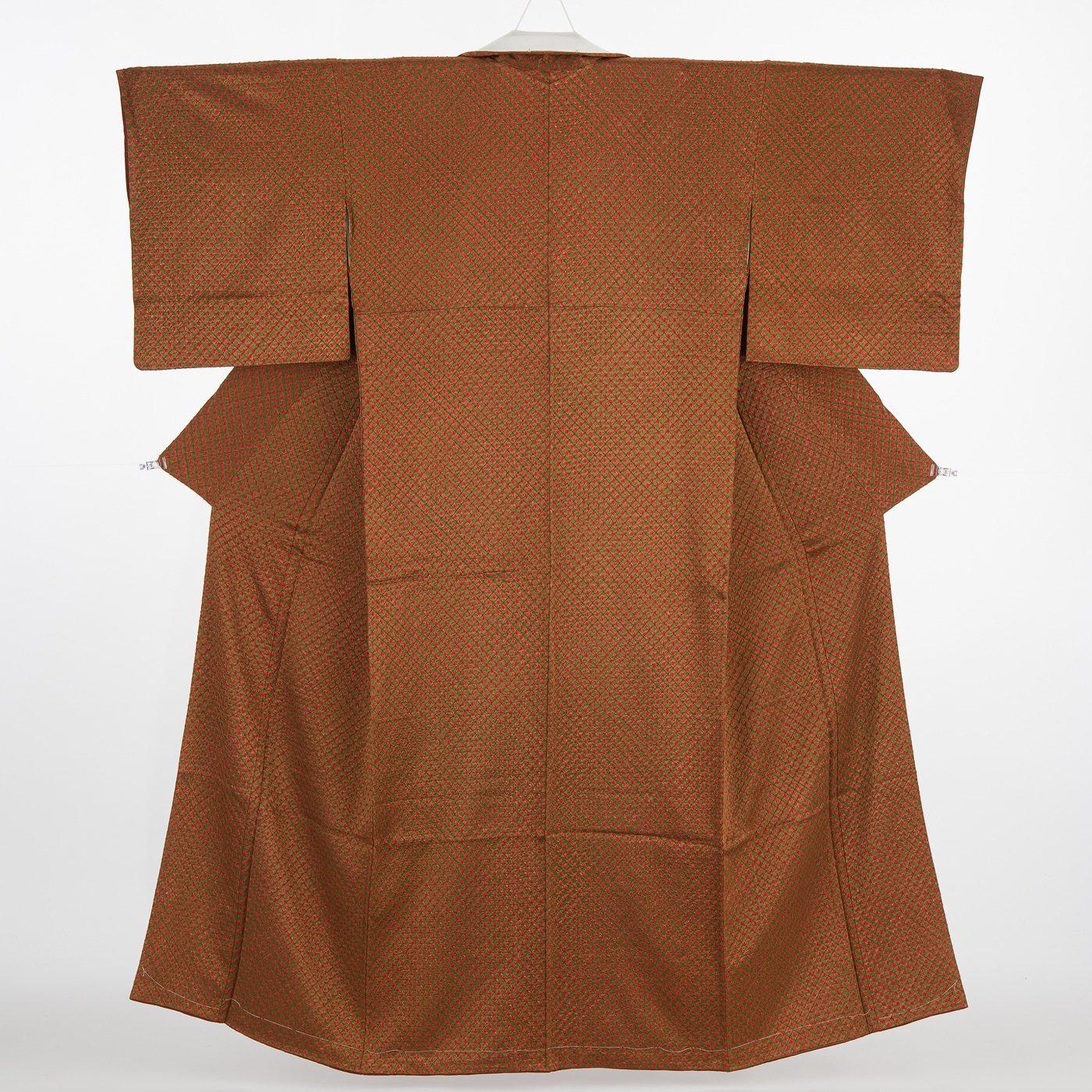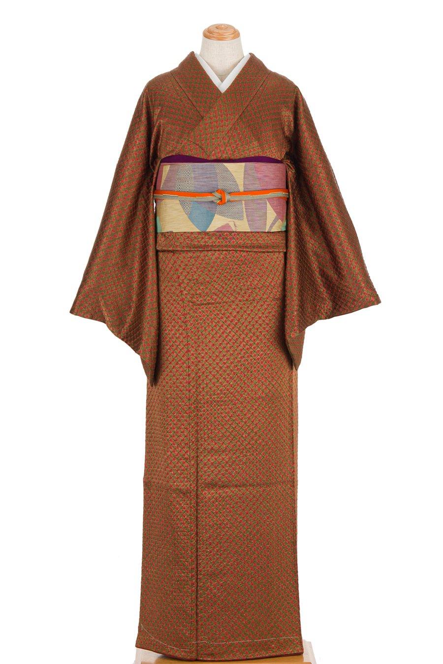 鶯茶の地に赤で丸い絞り染めを施した小紋の着物です。
