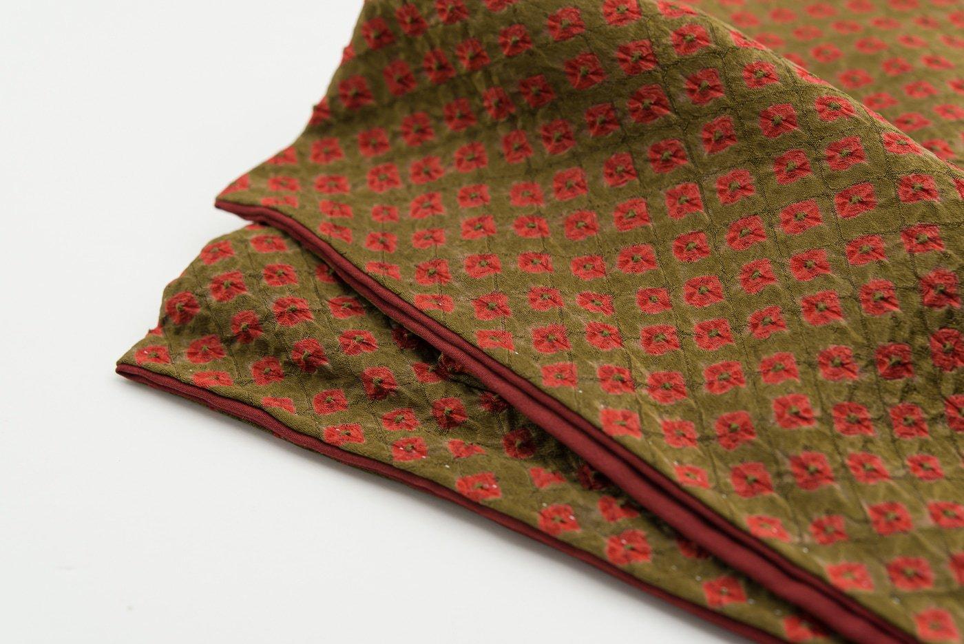 絞り 鶯茶の地に赤いドット