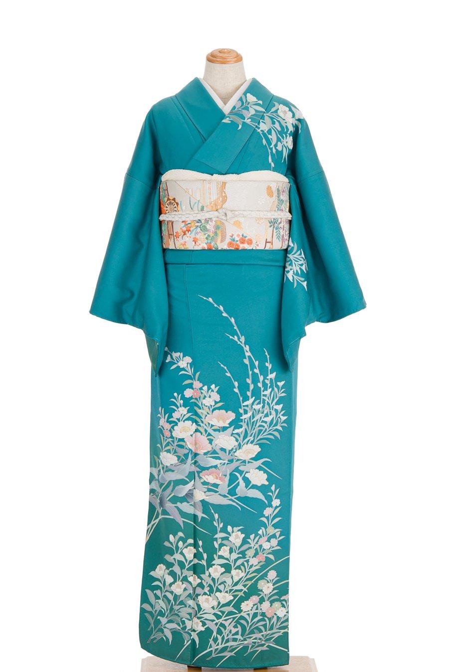 花緑青色の地にひなげしや菊などを描いた訪問着です。
