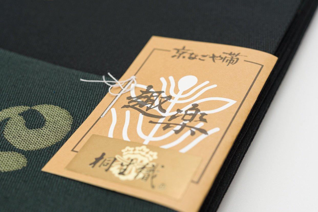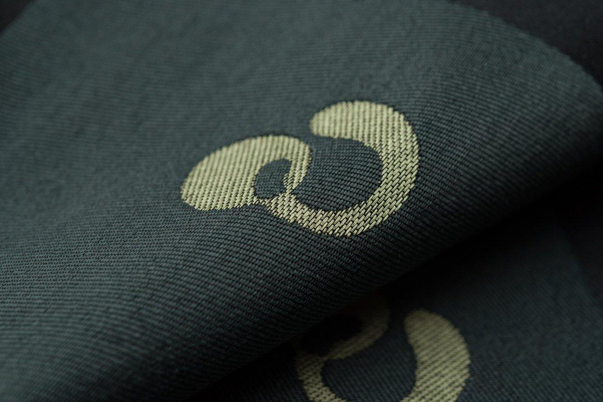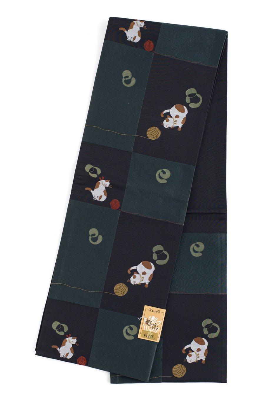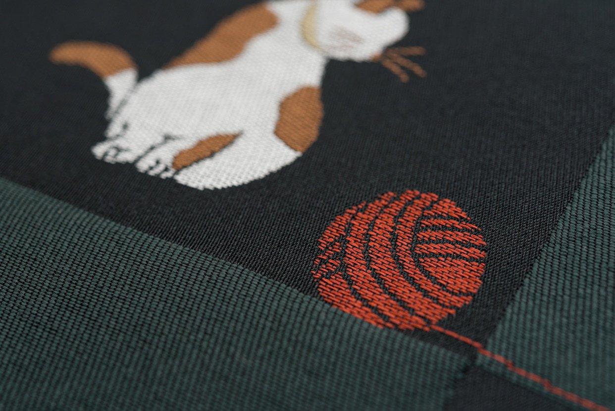 青緑と黒の市松に三毛猫を織り出した京袋帯です。