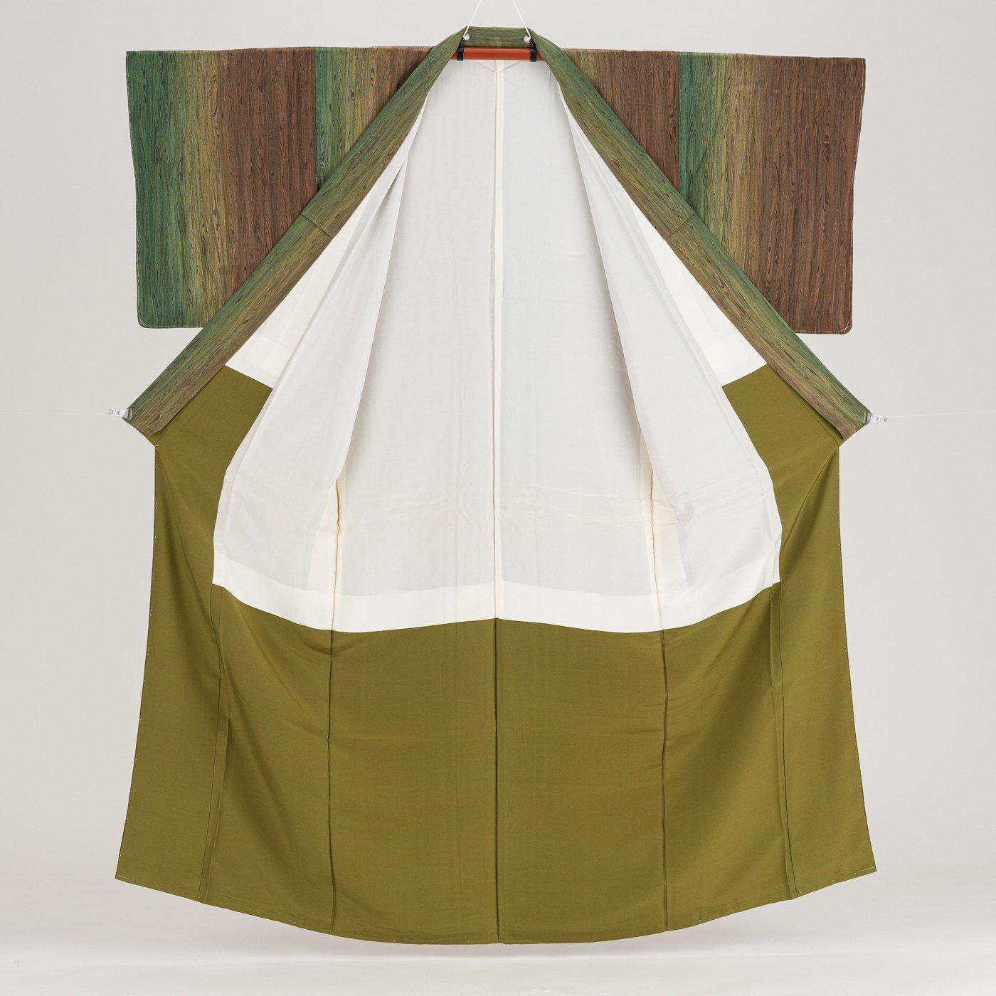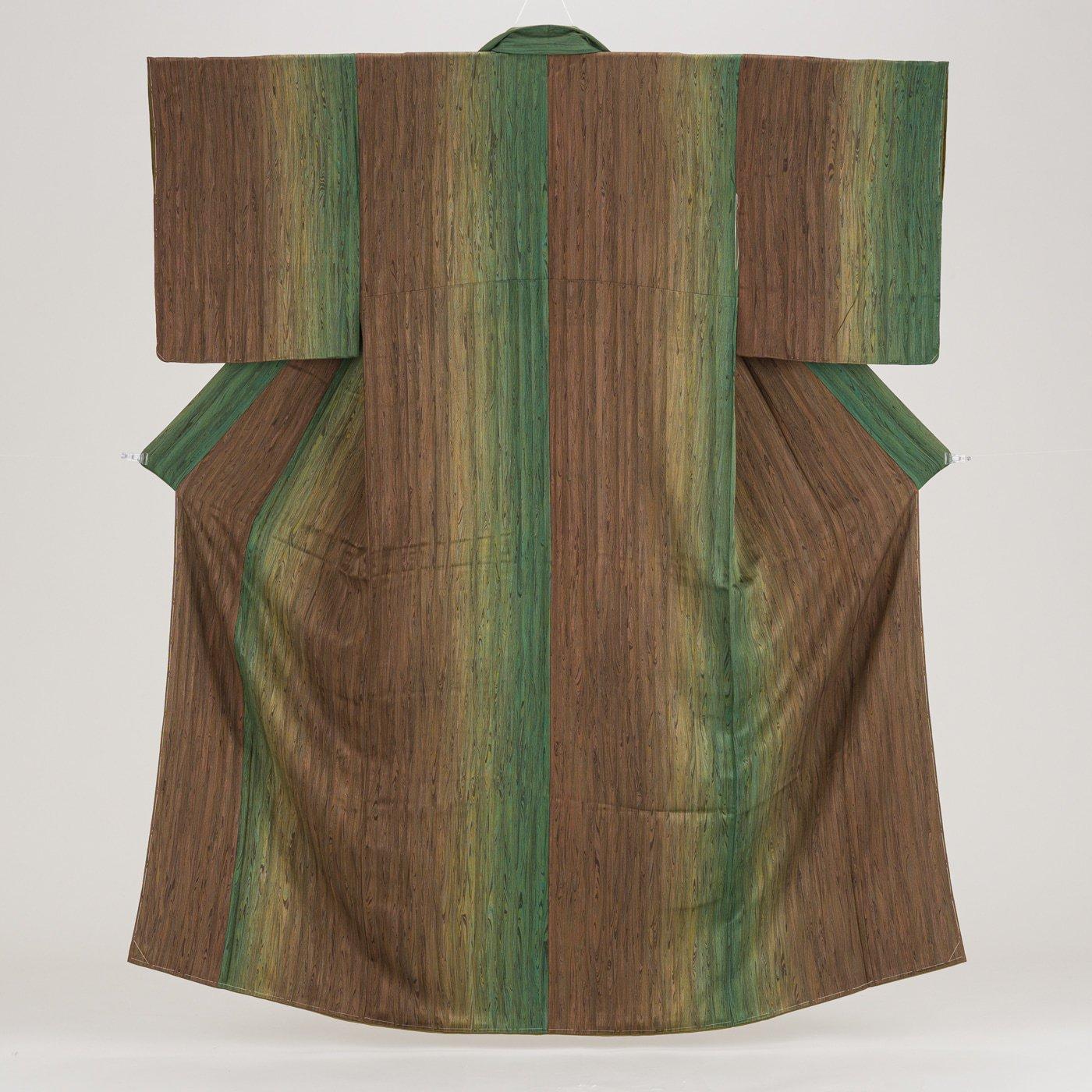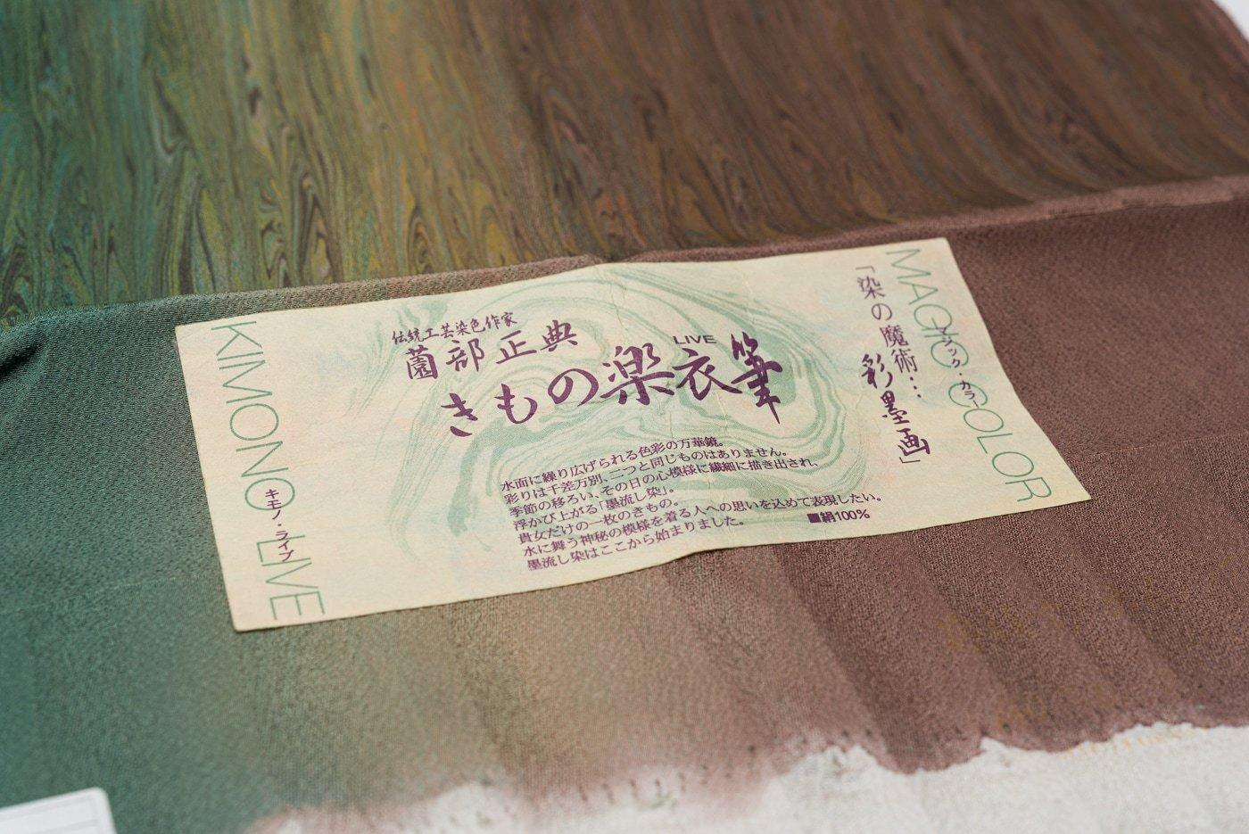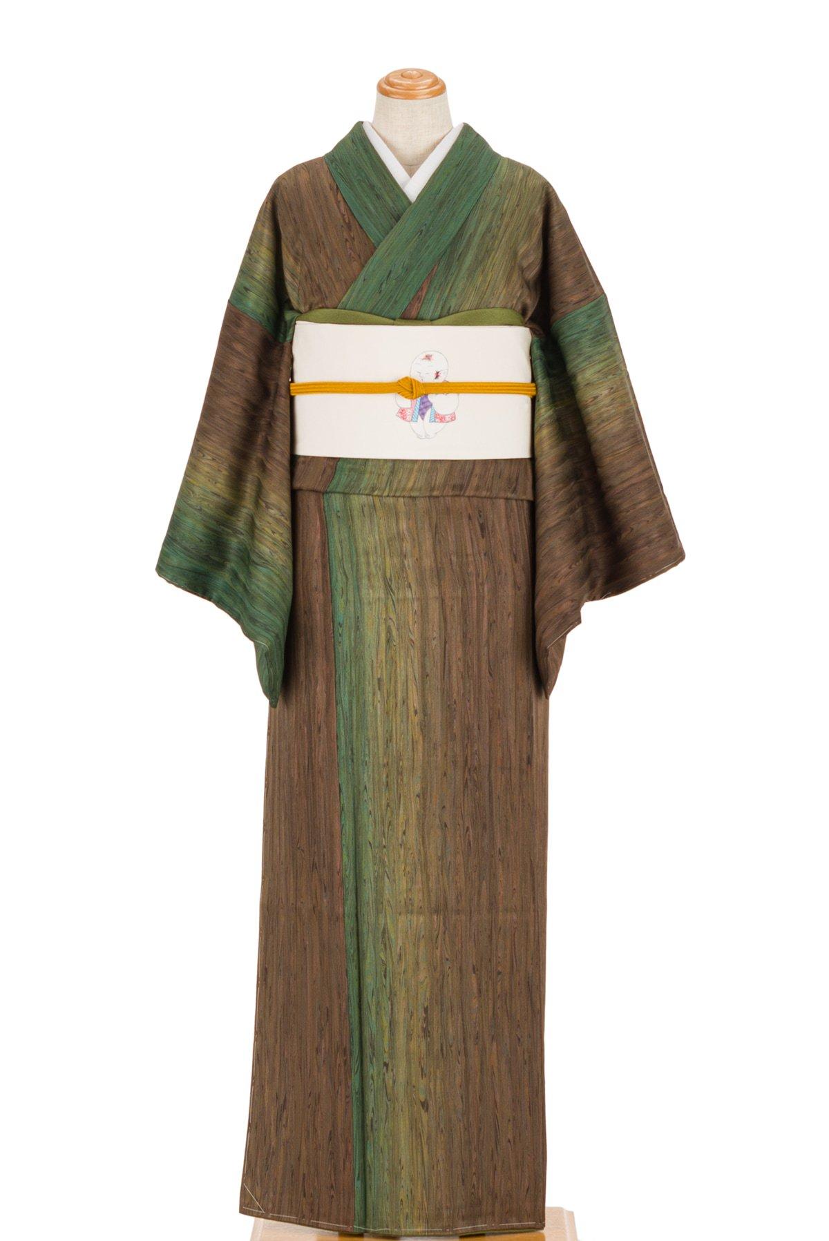 緑から茶へと変化する縦暈しに墨流しが広がる小紋の着物です。