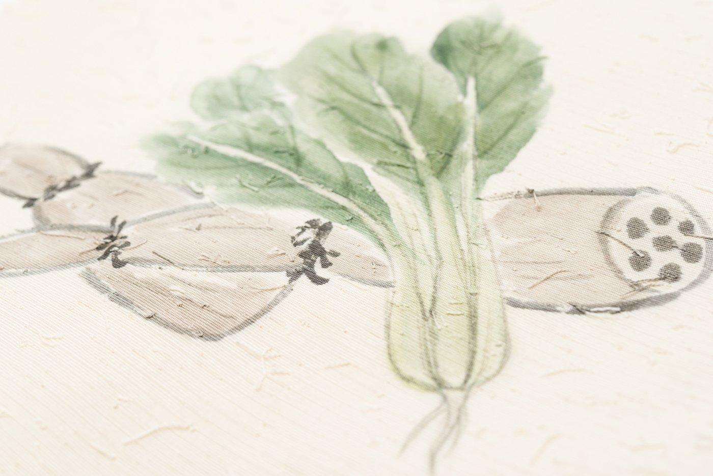 白地に野菜の柄を手描きした九寸名古屋帯です。