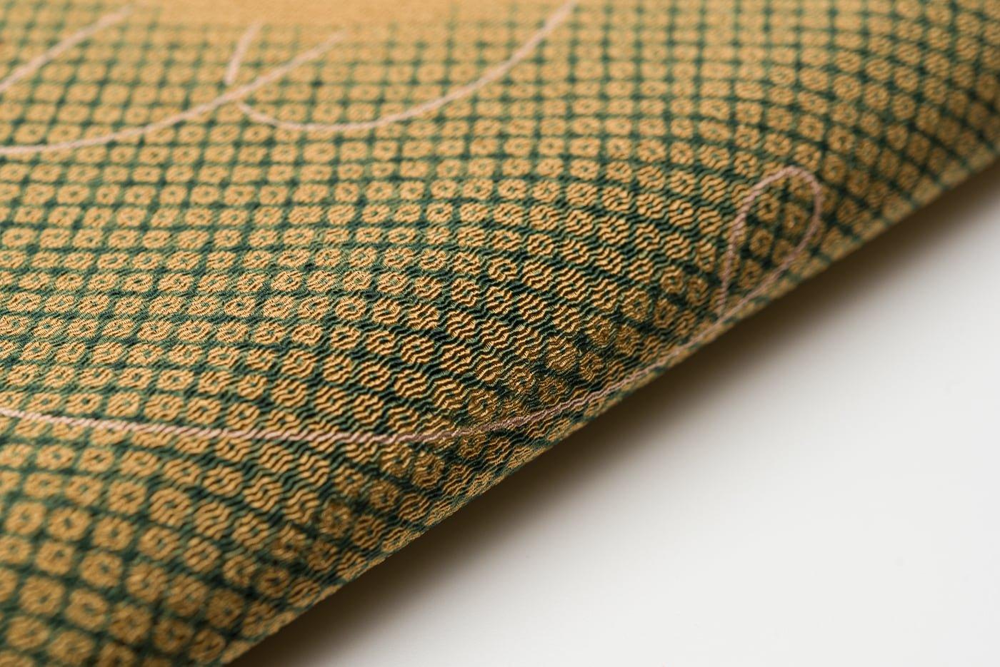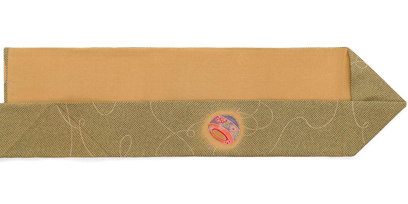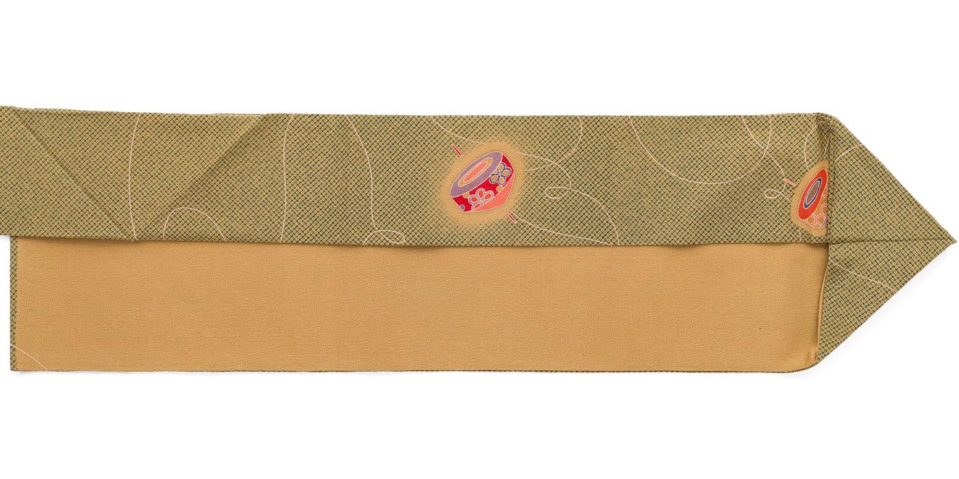 鹿の子柄を染めた縮緬地にくるくると独楽が回る楽しい九寸名古屋帯です。