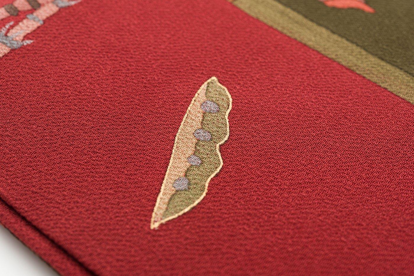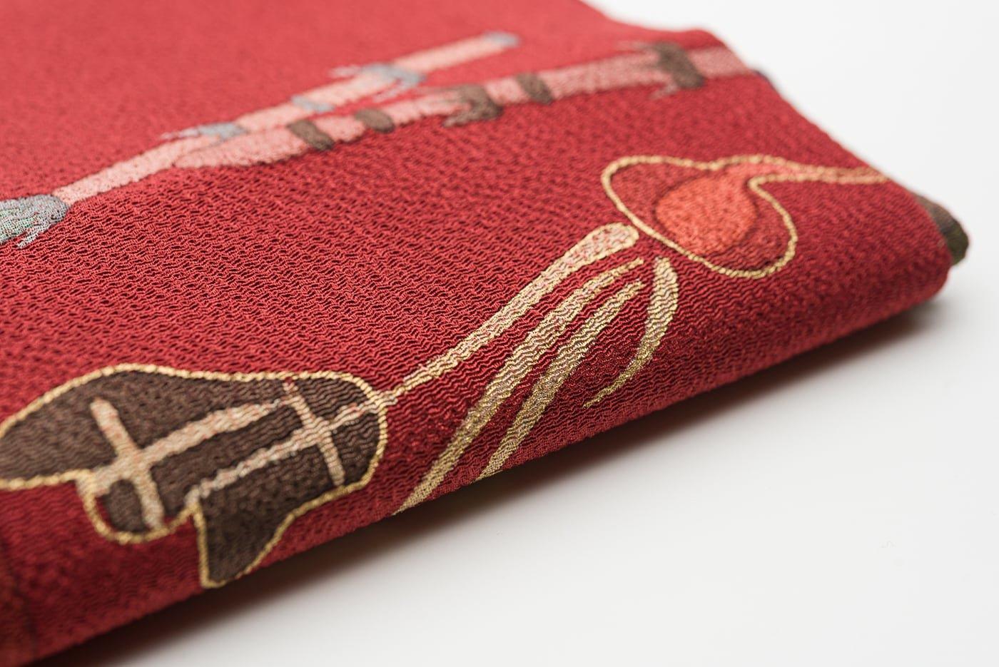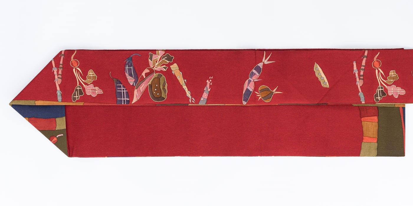茄子、南瓜、大根、たけのこ、葱などなど、たくさんの種類の野菜を染めた九寸名古屋帯です。