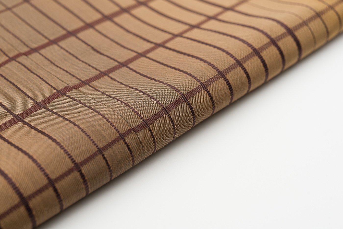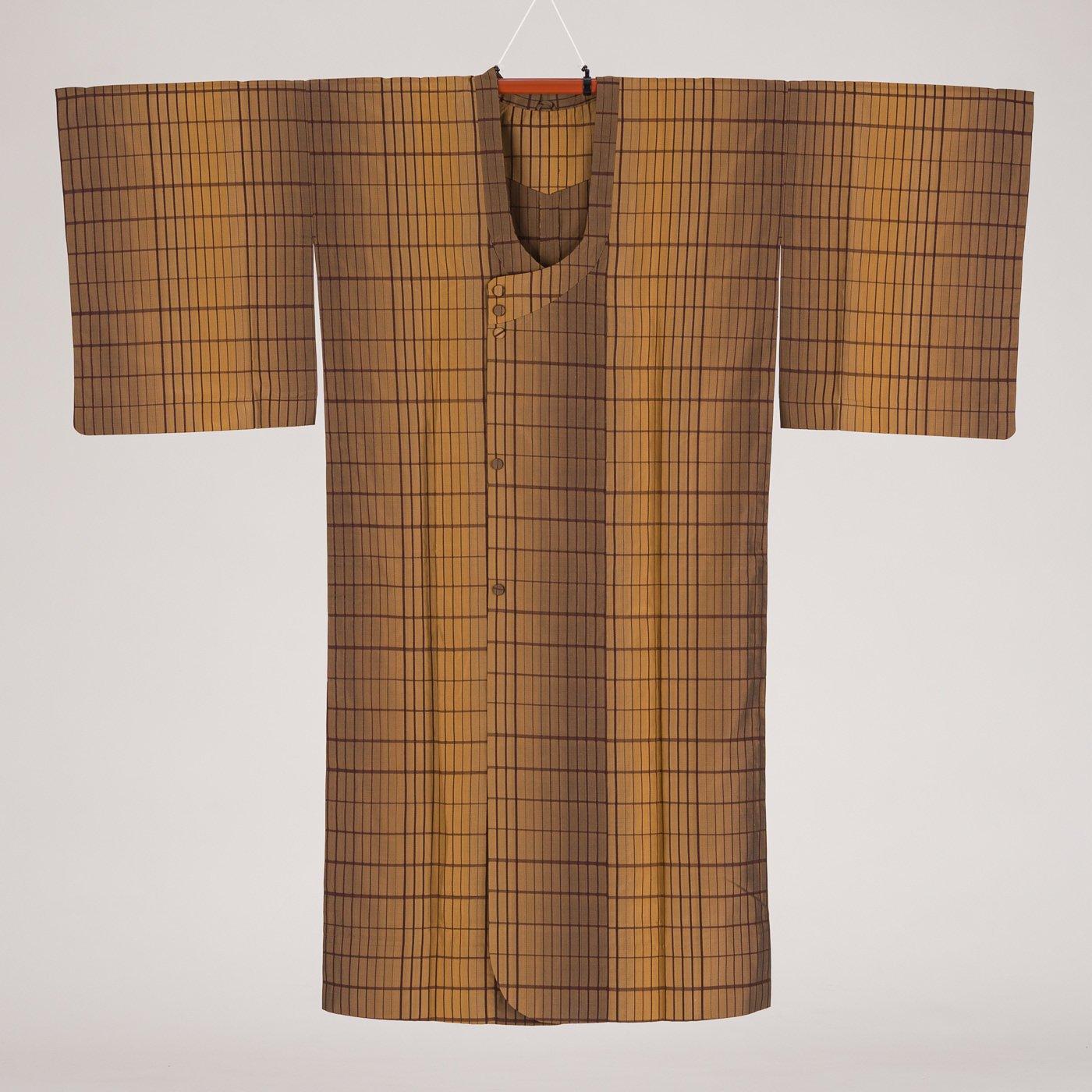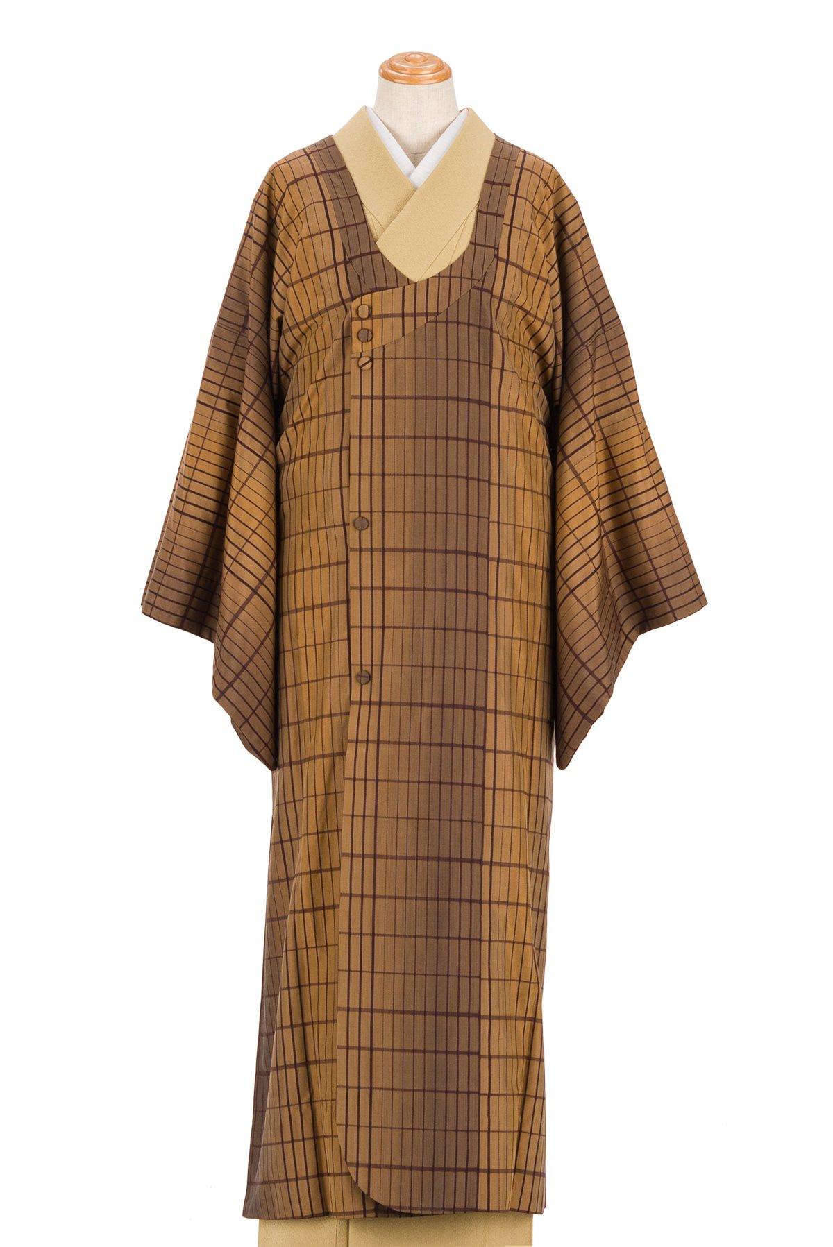 黄土色と茶の暈し地に格子模様を織り出した道行コートです。
