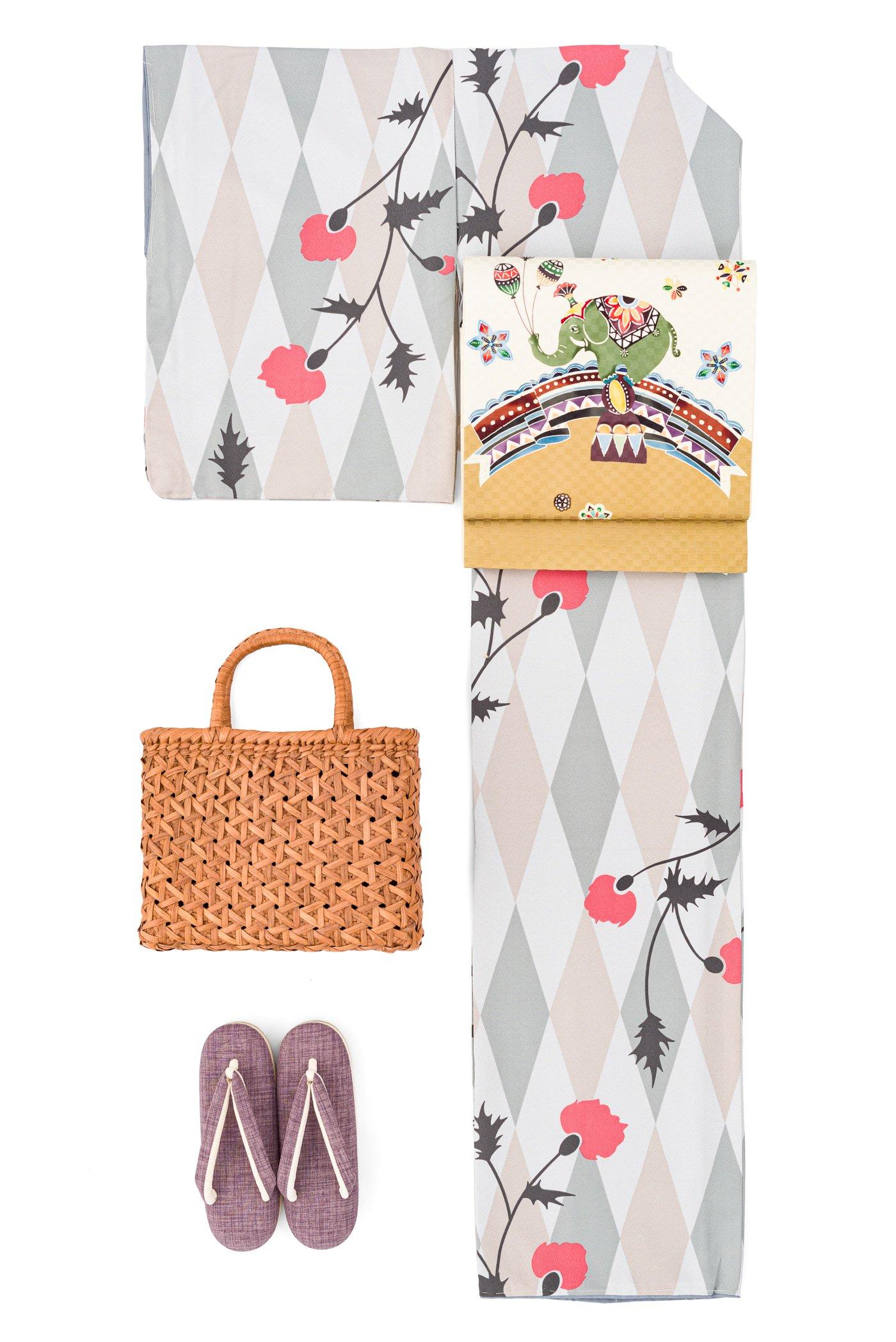 【M】新品 洗える着物 ダイヤと花 Pink