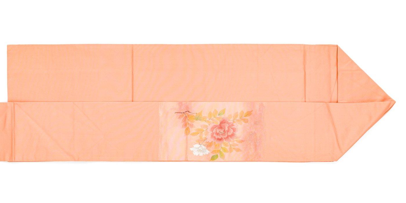 白とピンクの花を描いた九寸名古屋帯です。
