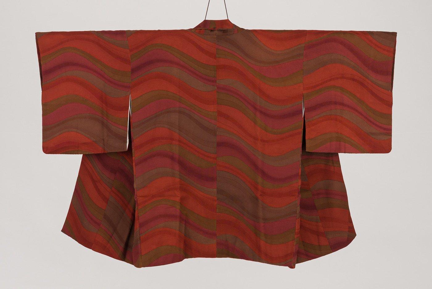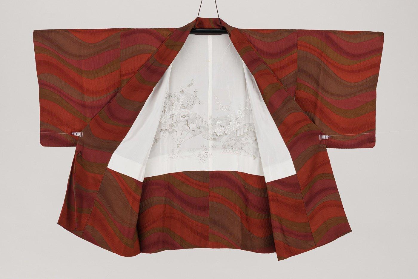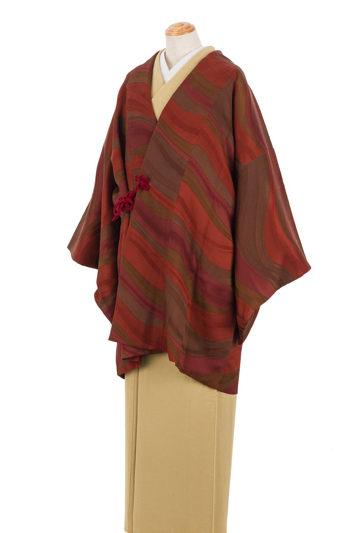 茶や赤茶などを基調に曲線柄を染めた道中着です。