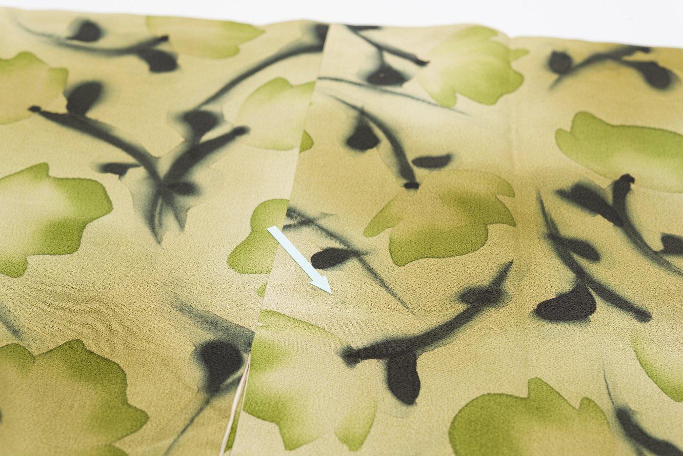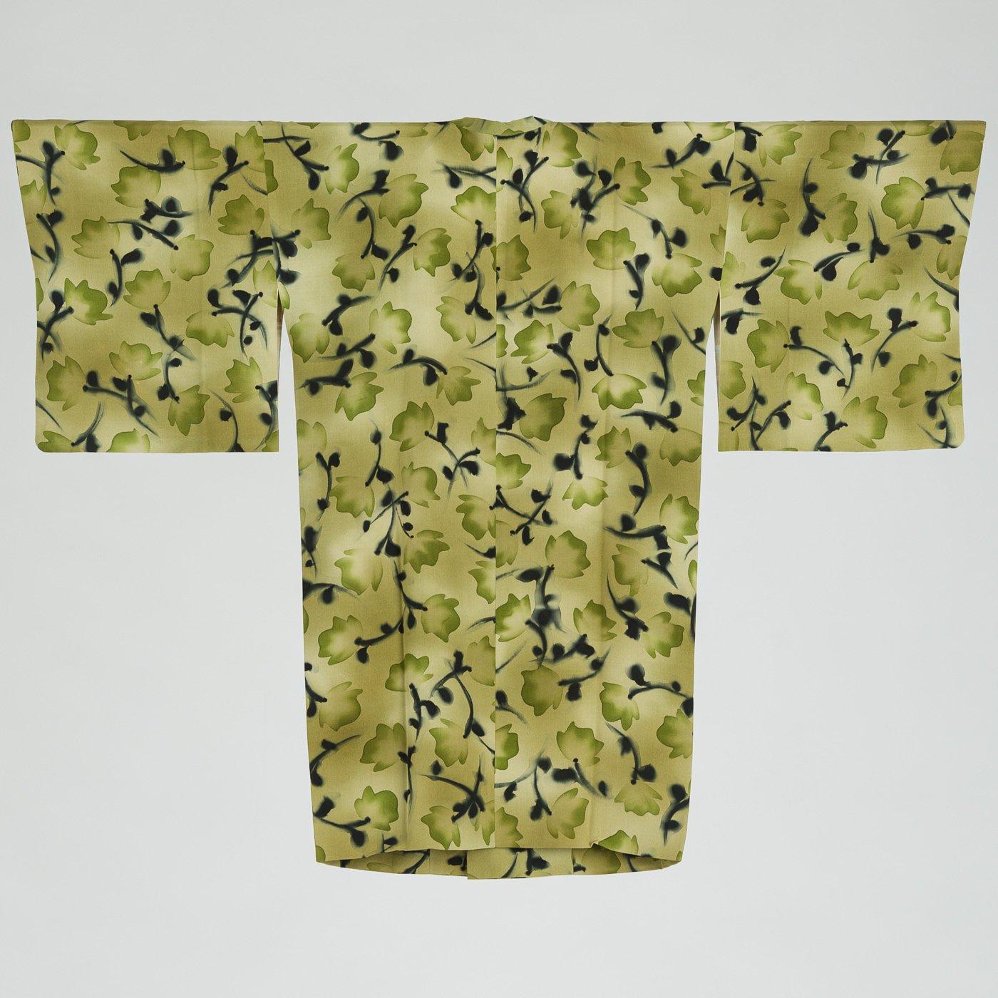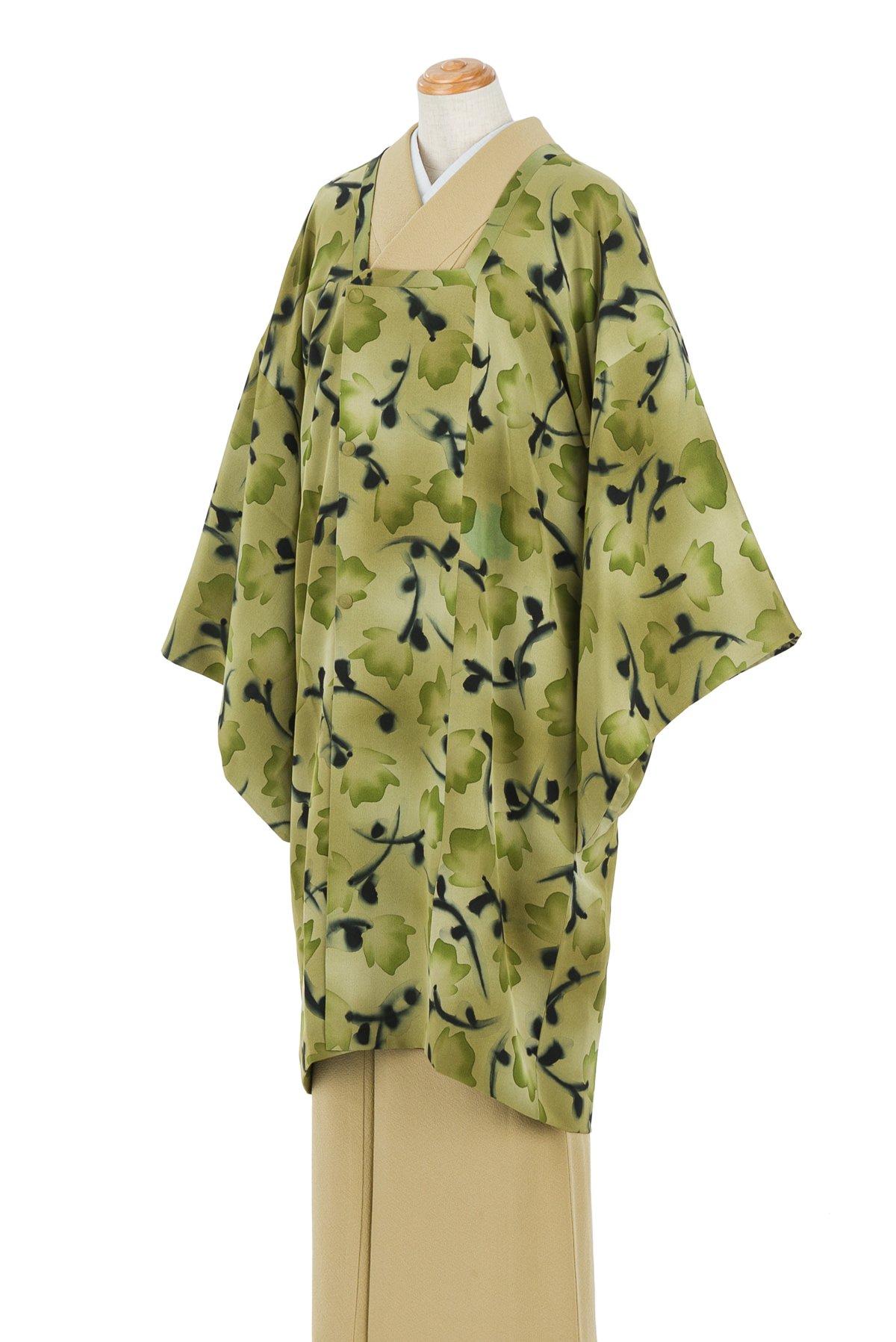 ふんわり緑に色付く可愛らしい花が染められたロング丈の道行コートです。