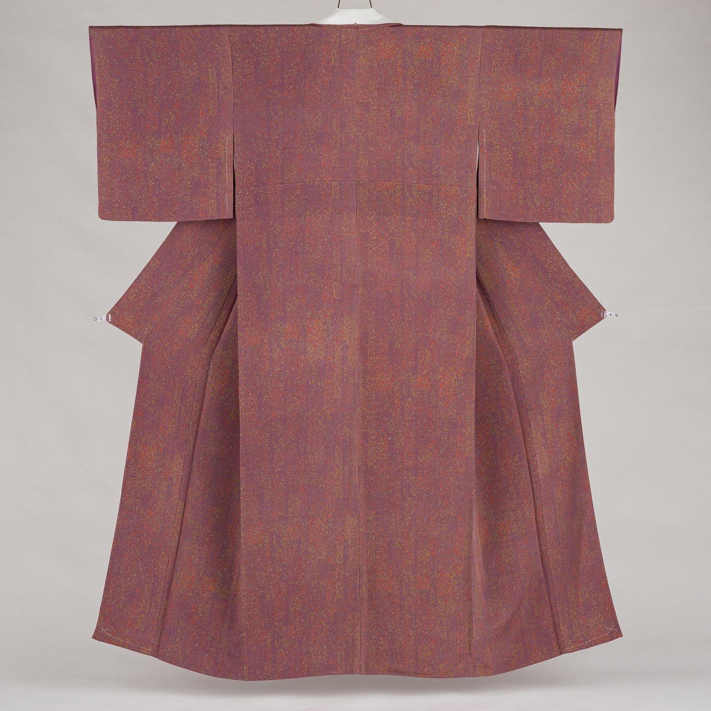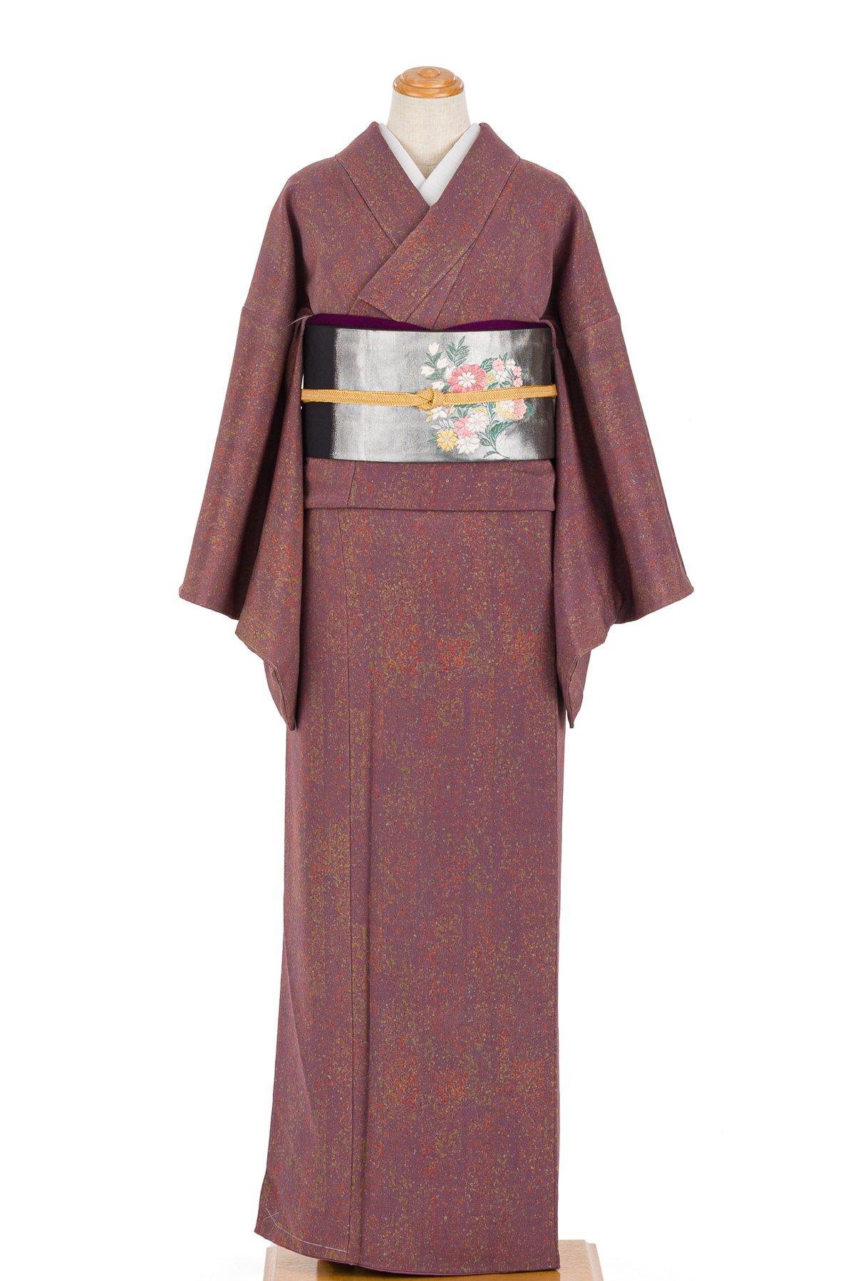小豆色の縮緬地に叩き風の抽象模様を染めた着物です。