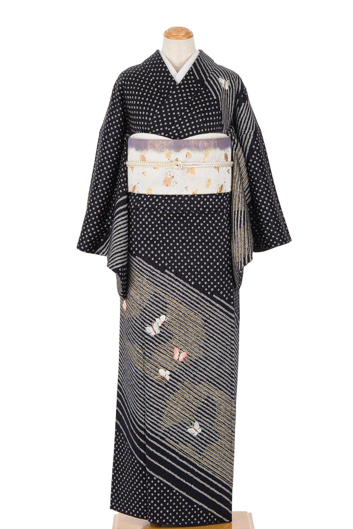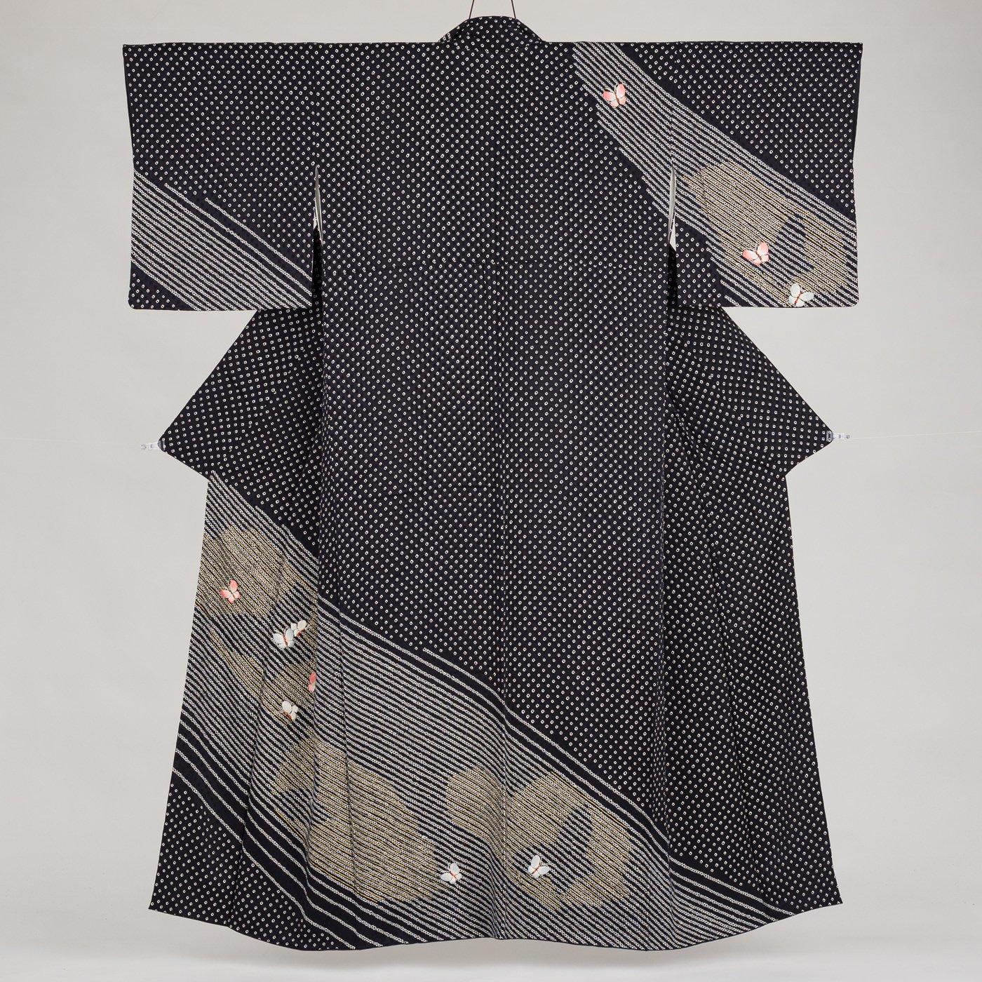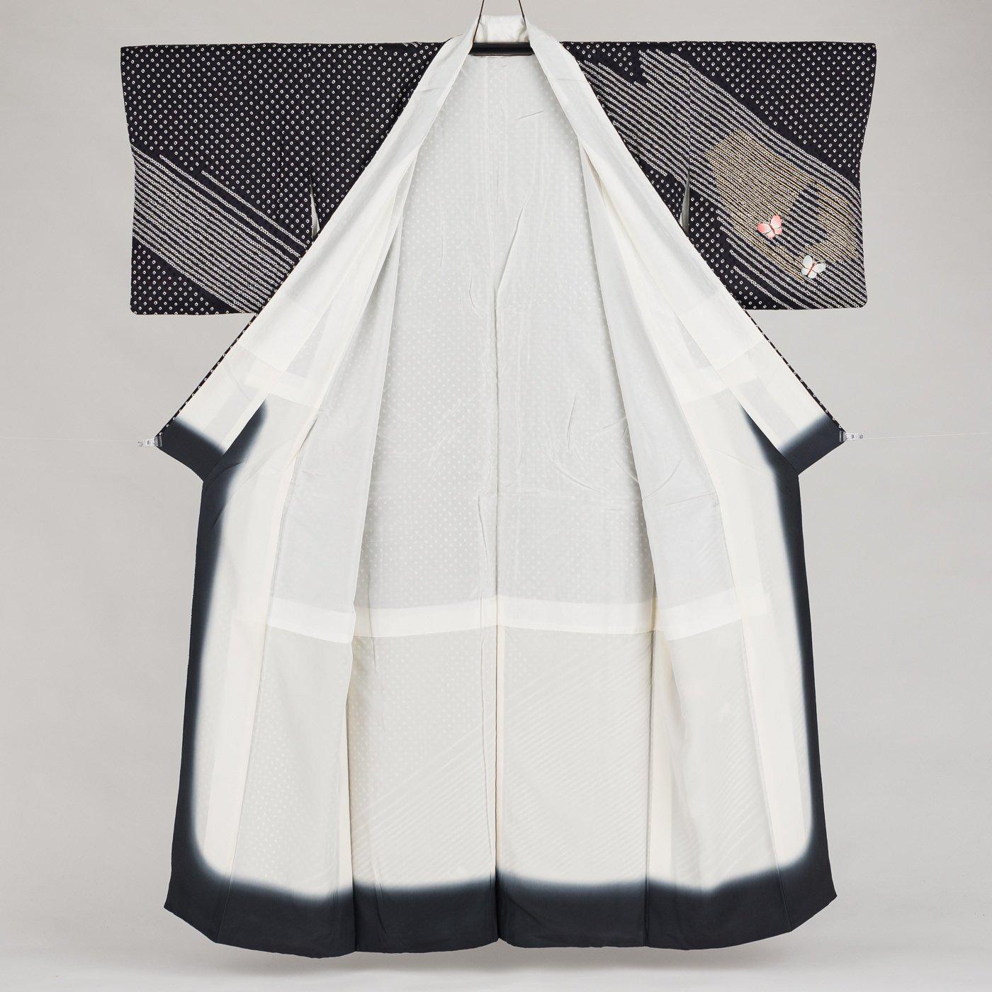 モノトーンの絞りの上に愛らしい蝶々を刺繍した訪問着です。