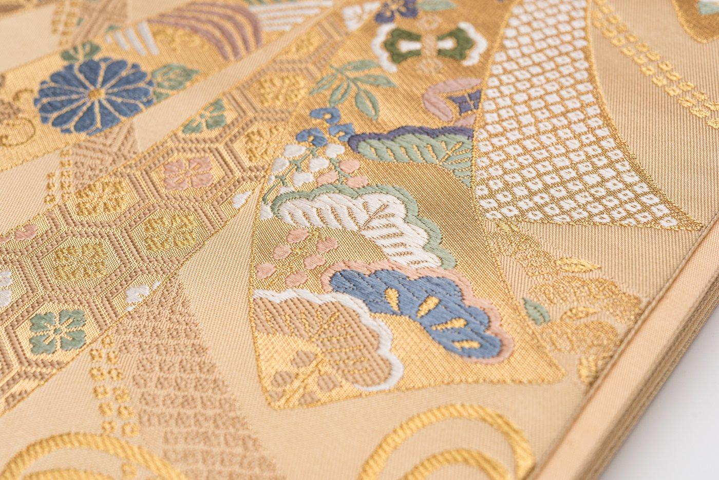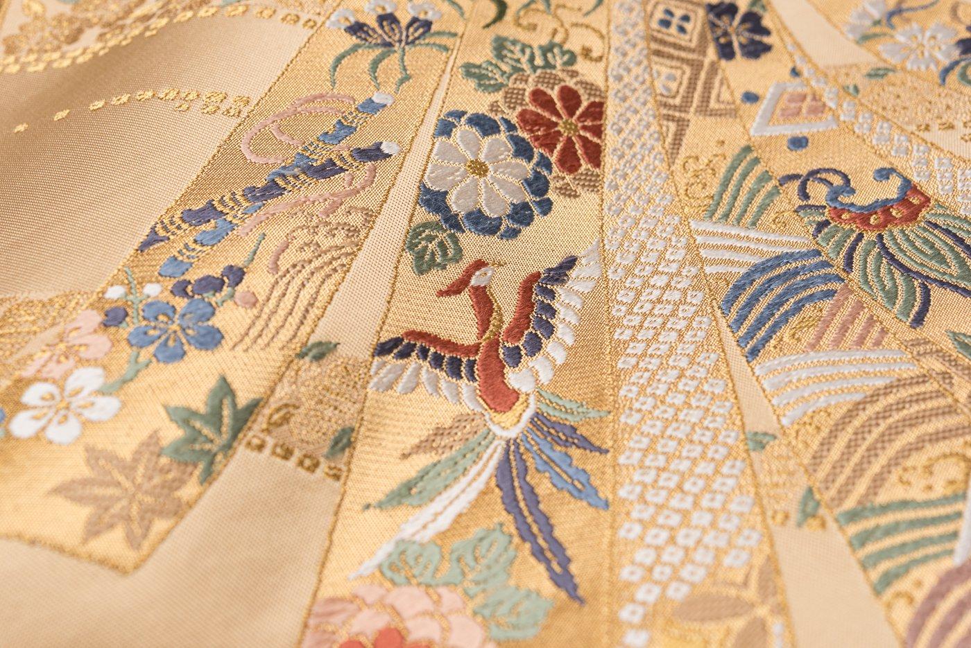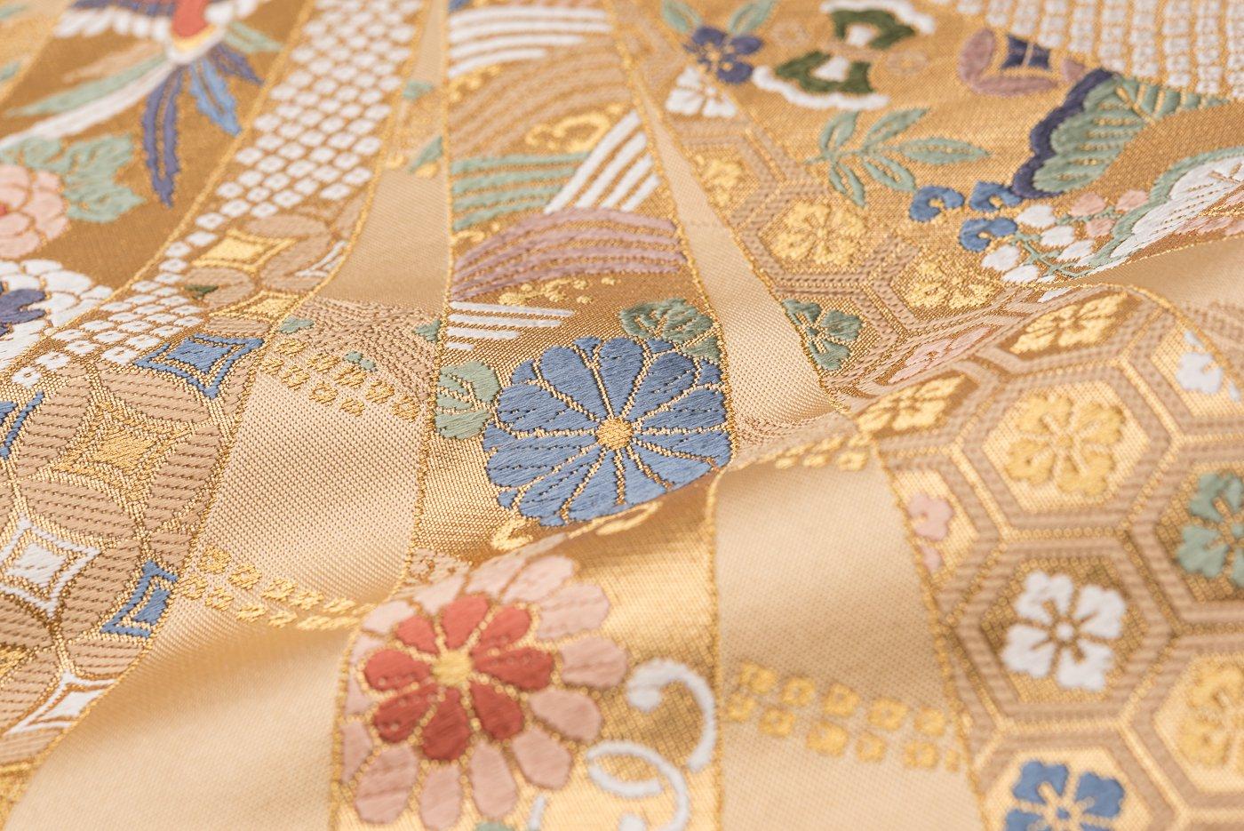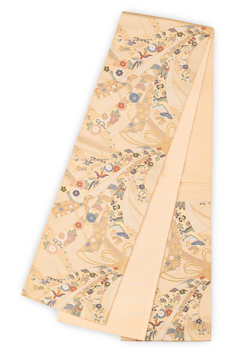 大きな束ね熨斗に宝尽くし、花、鳳凰などの模様を織り出した袋帯です。