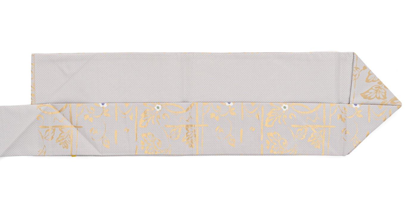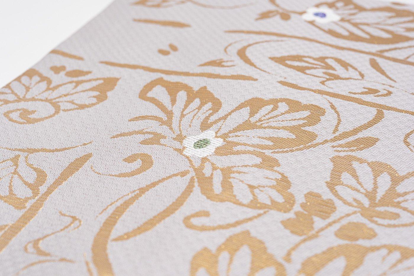 牡丹鼠色の地に金の葉模様を織り出した九寸名古屋帯です。