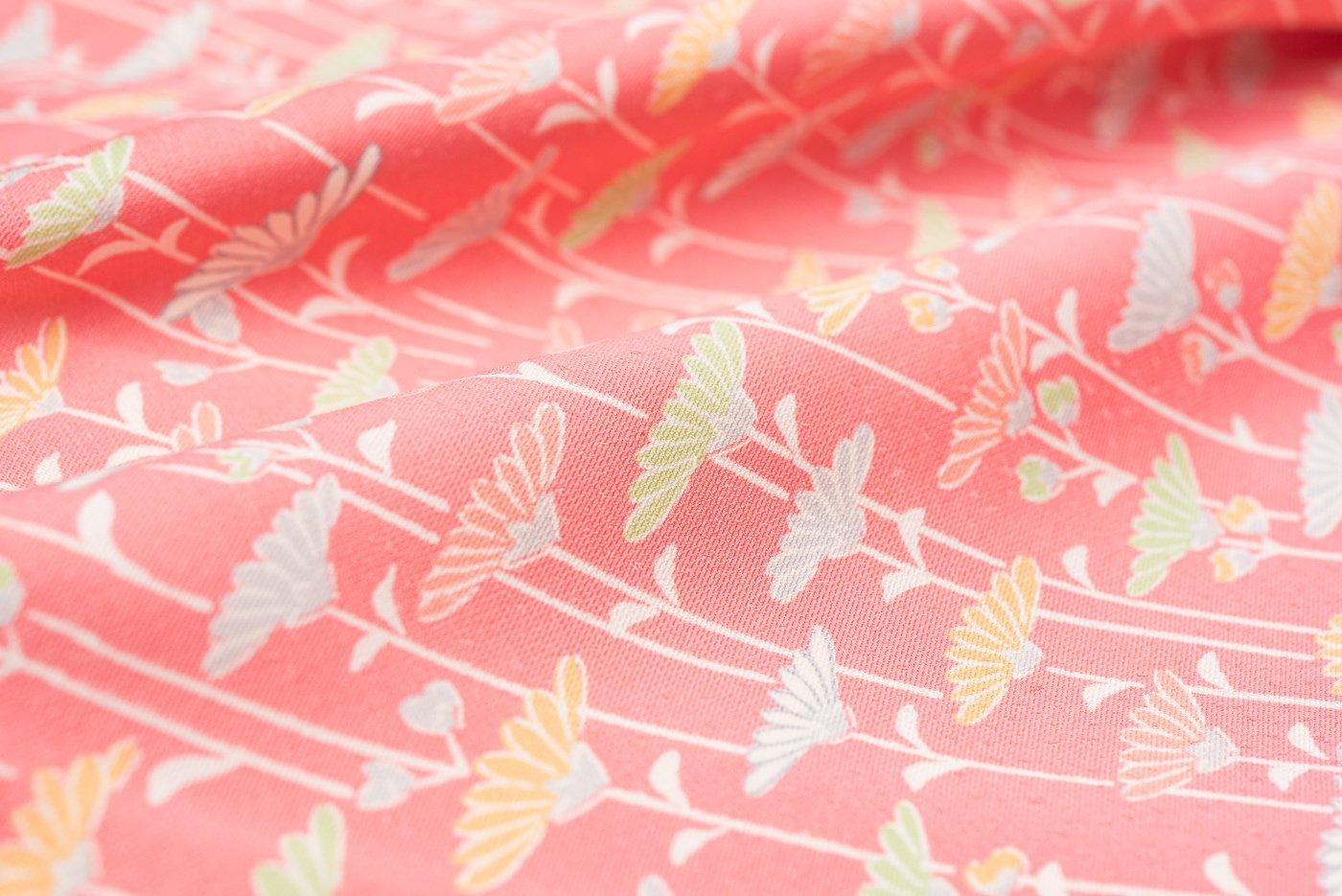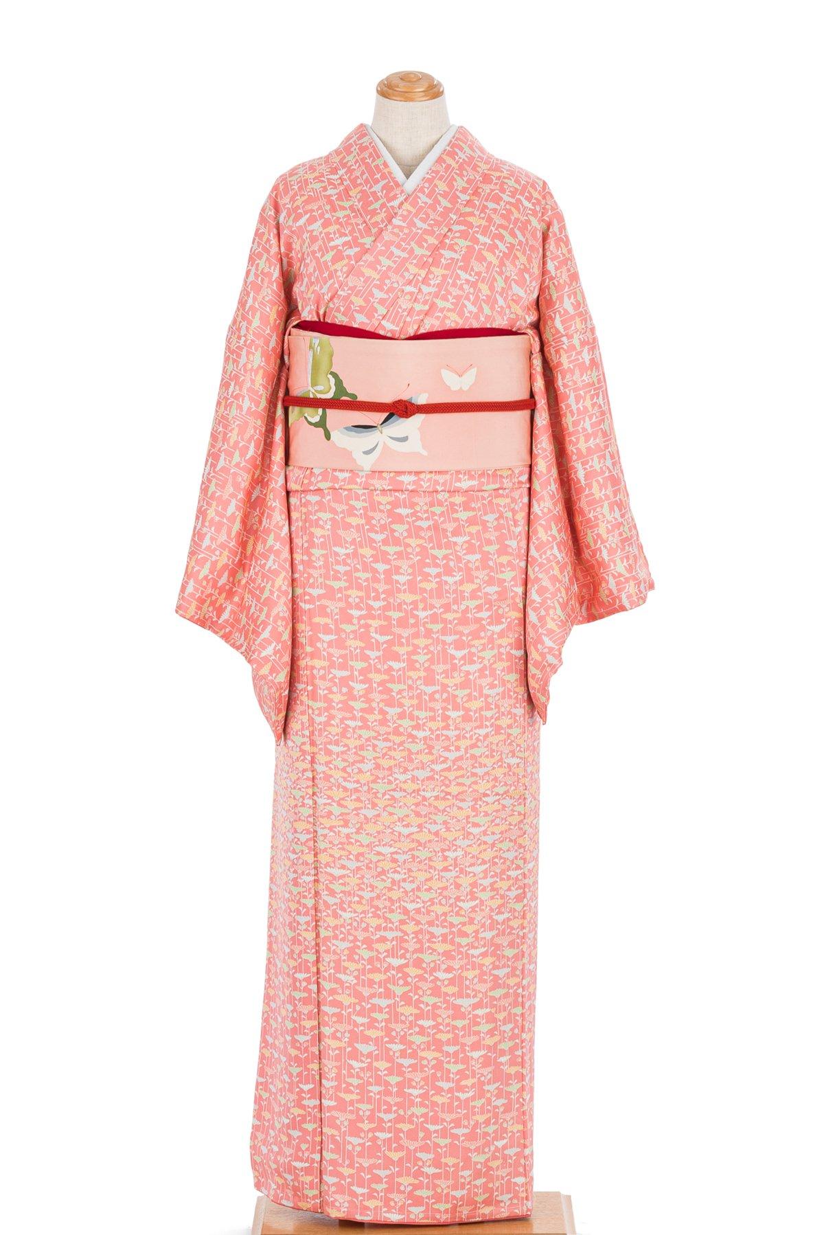 ピンク色の地に菊花を染めた一方付けの着物です。