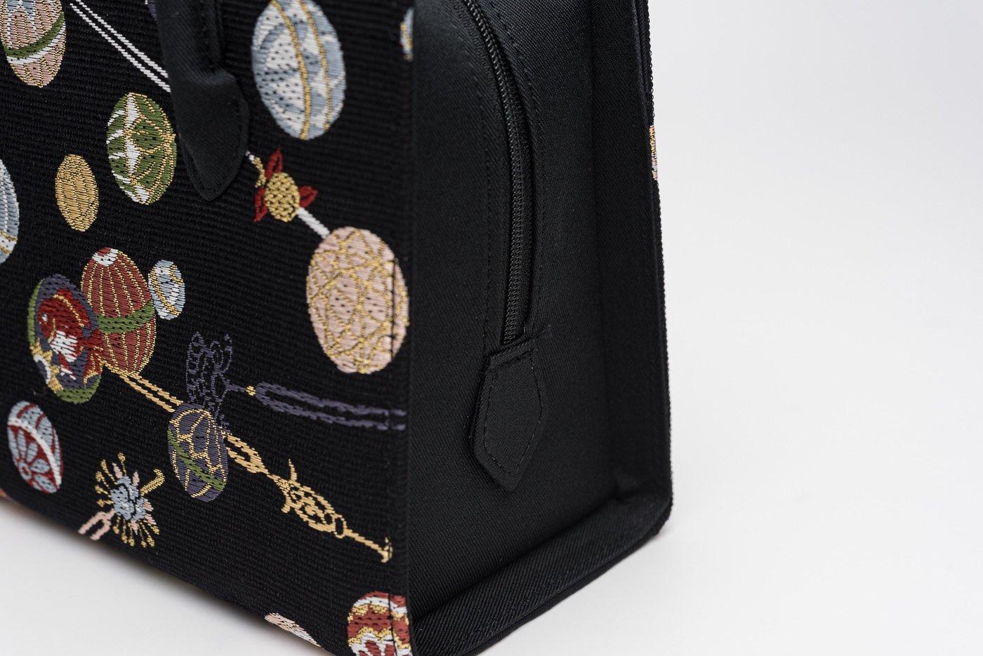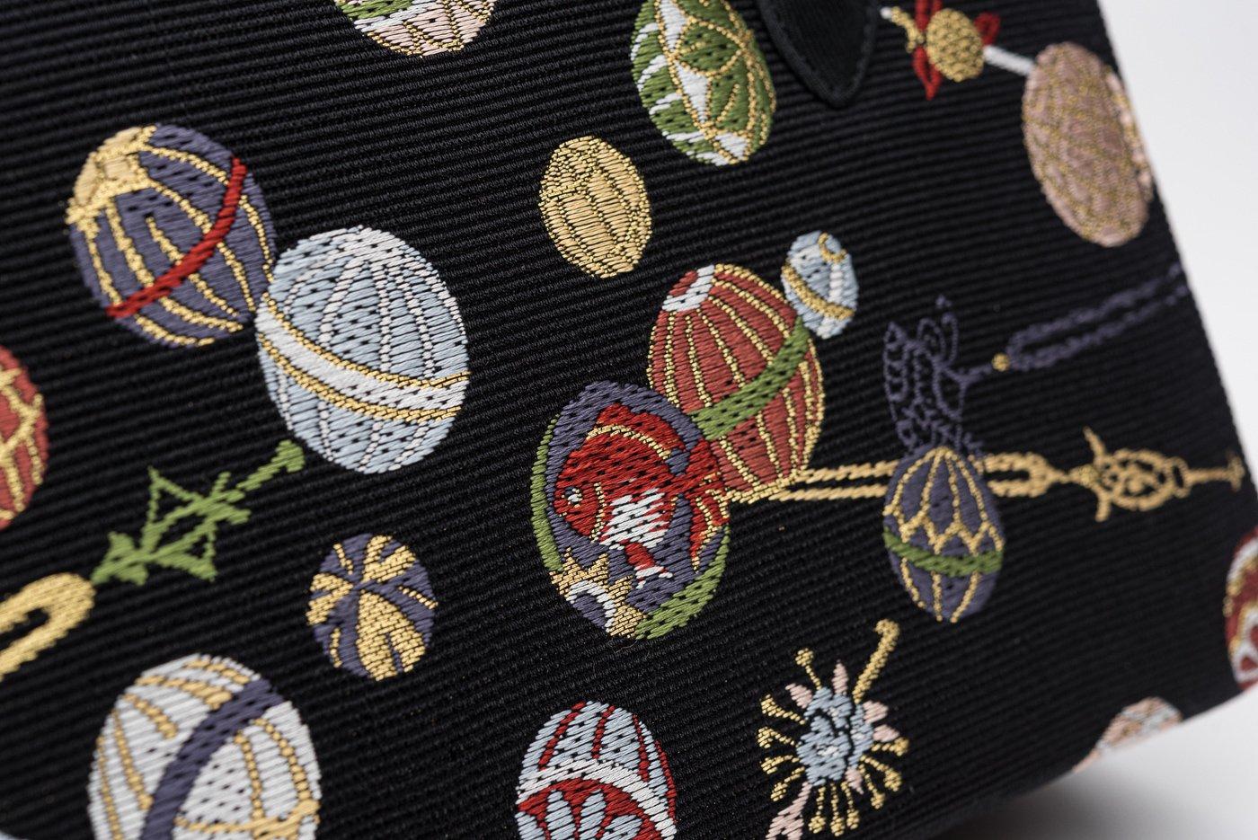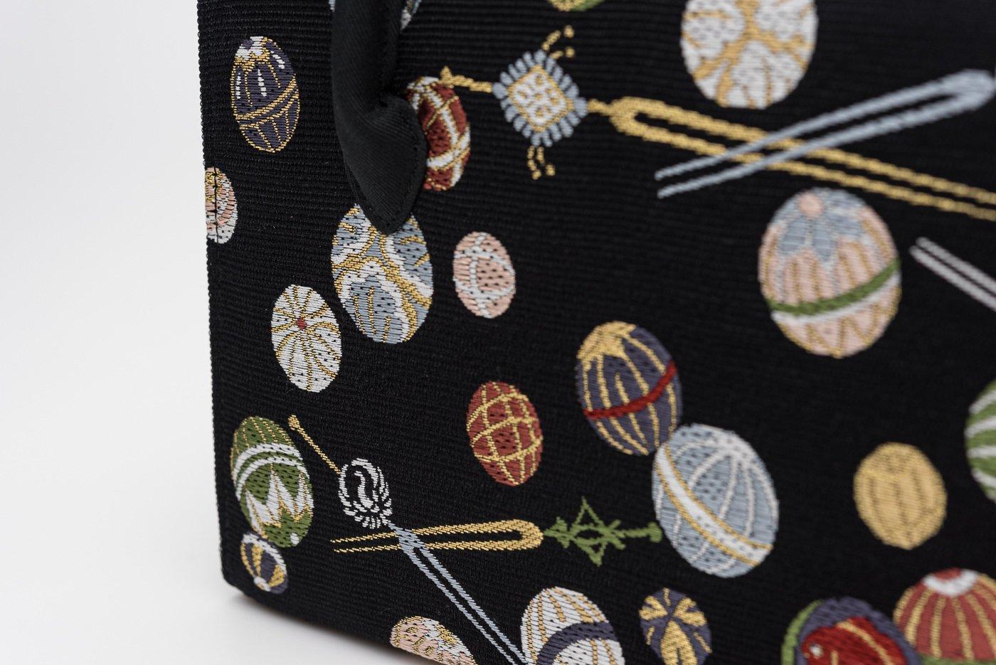 色とりどりの鞠や簪を織り出した、可愛らしいデザインの利休バッグです。