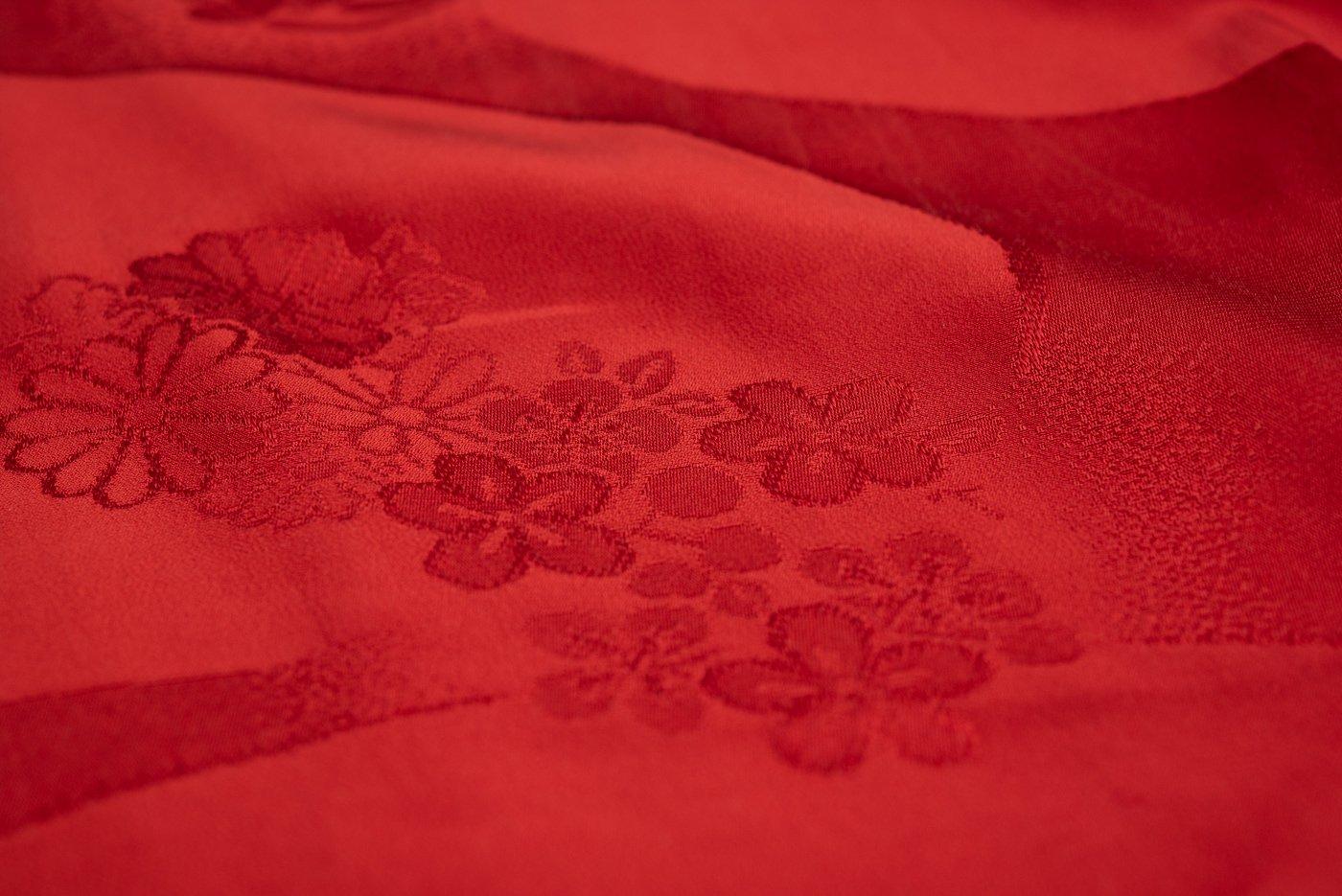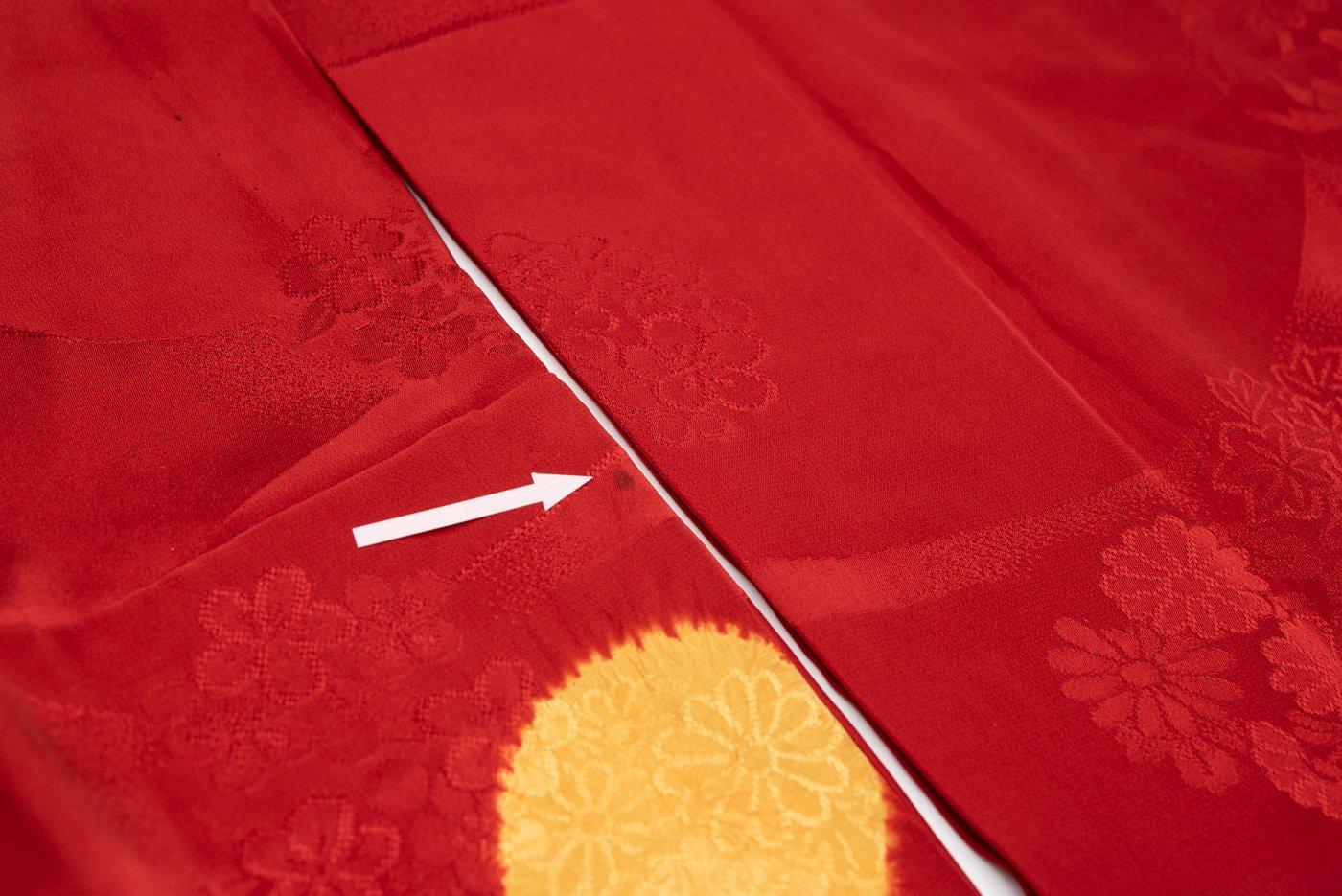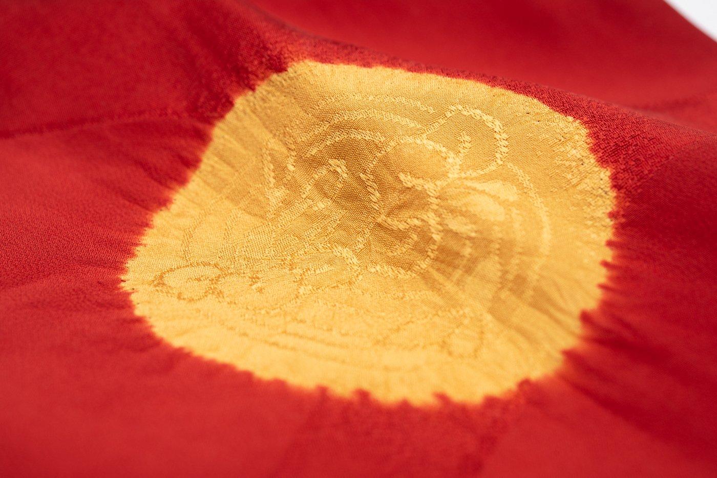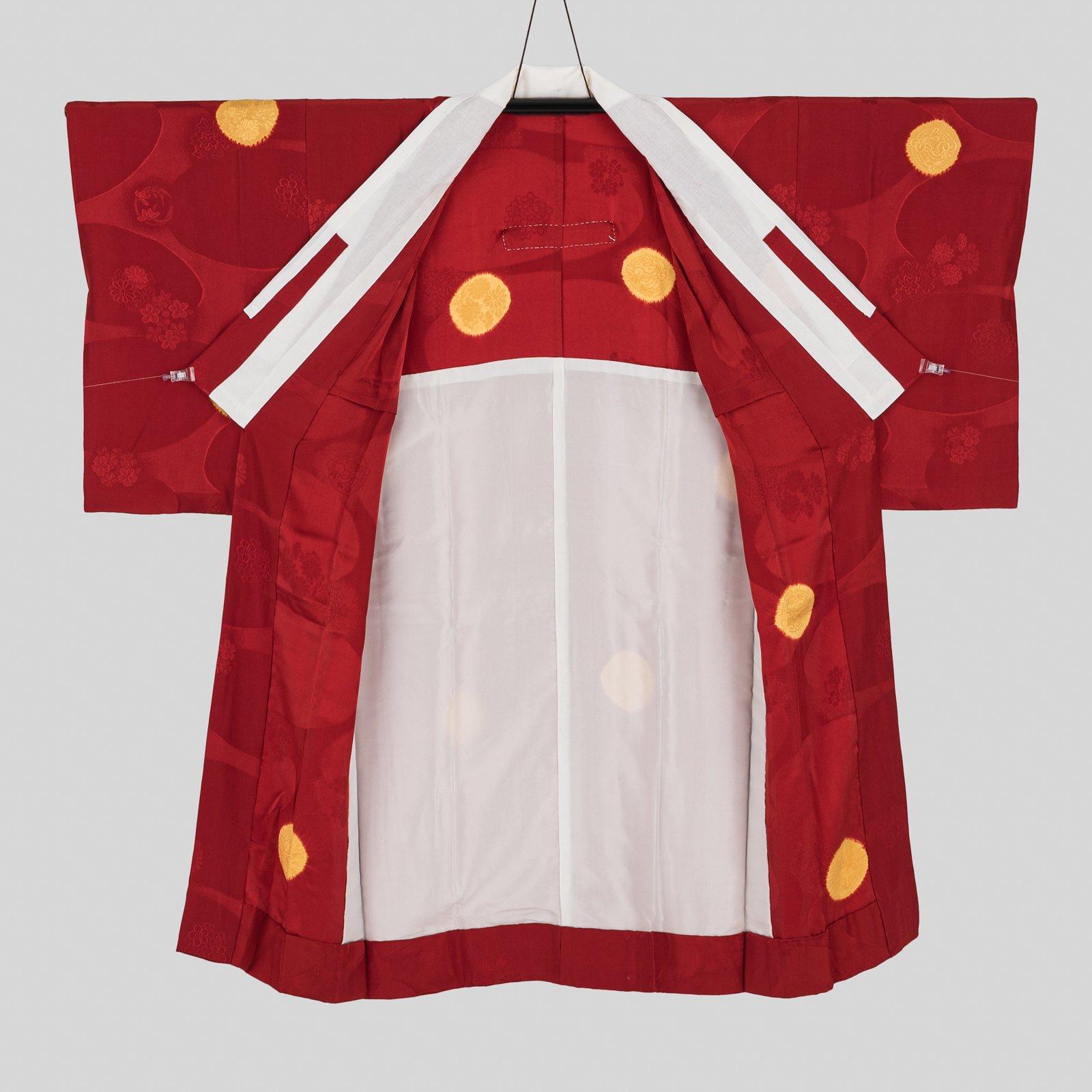 こっくり深い赤の地に黄色い水玉模様が浮かぶ単衣仕立ての長襦袢です。絞りで染めた水玉は夜空に輝く満月のようにも見えますね。右前身頃、肩山下48cmの付近に小染みが1つあります。その他は状態良好です。---------≪詳細≫身丈:120cm裄:64cm袖幅:32cm袖丈:57cm衿:広衿状態:AA素材:正絹----------