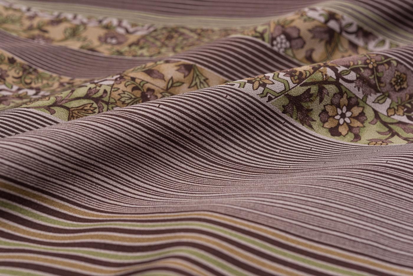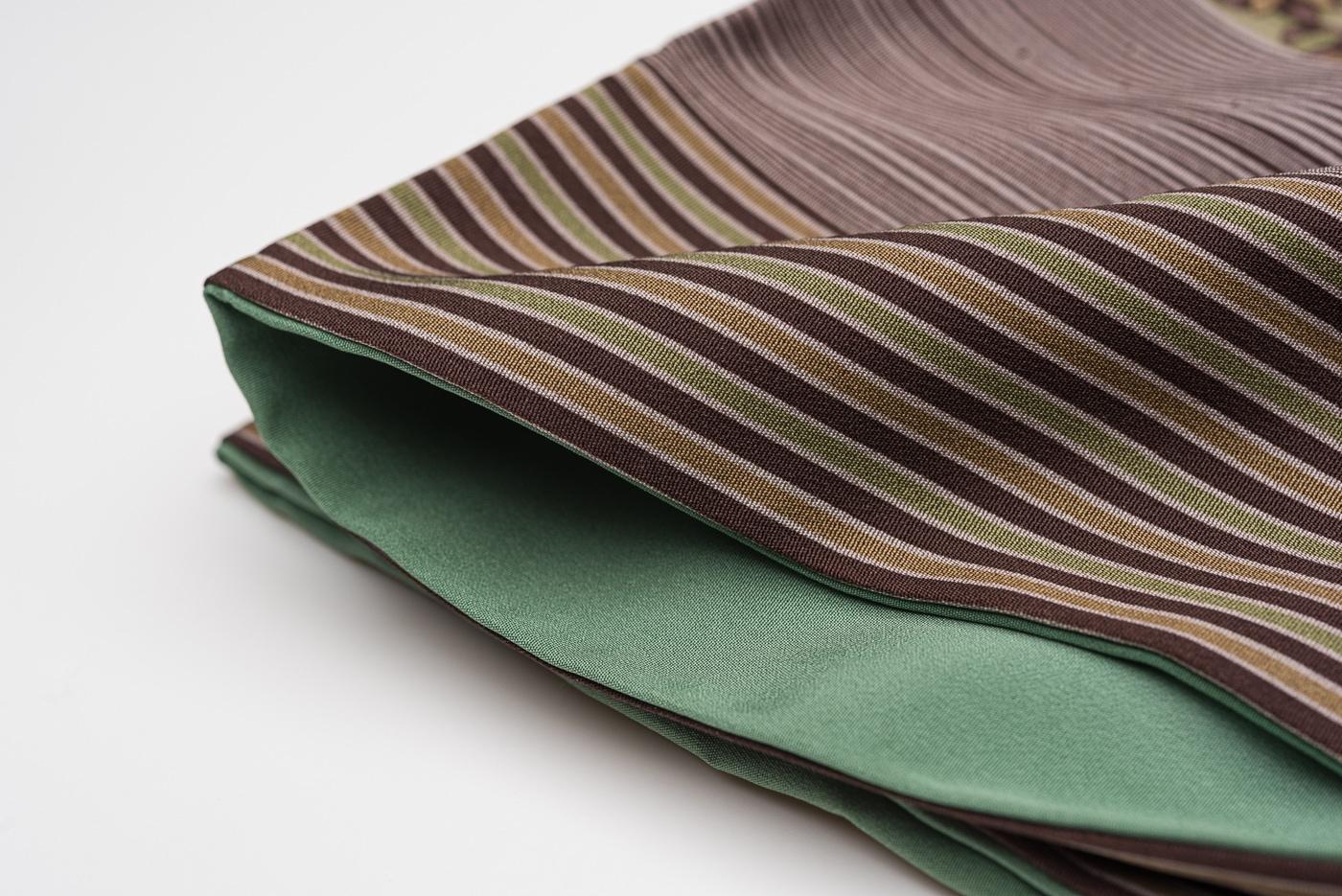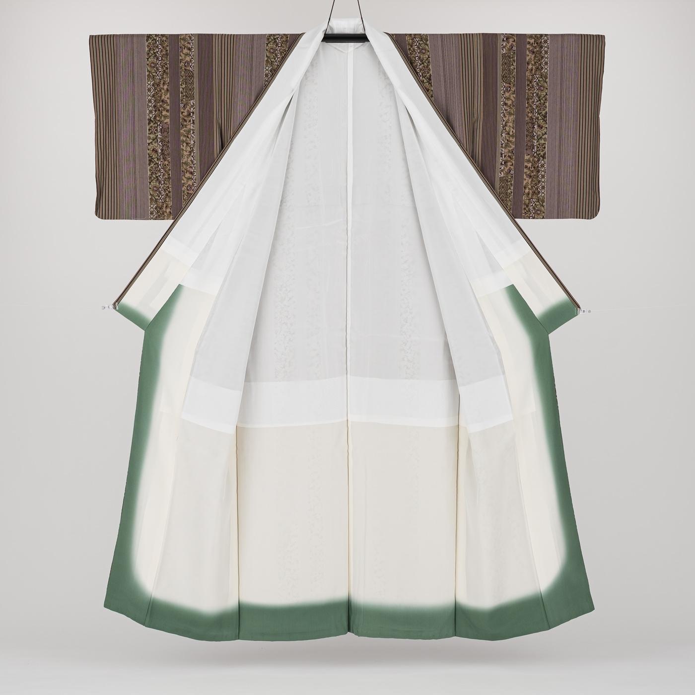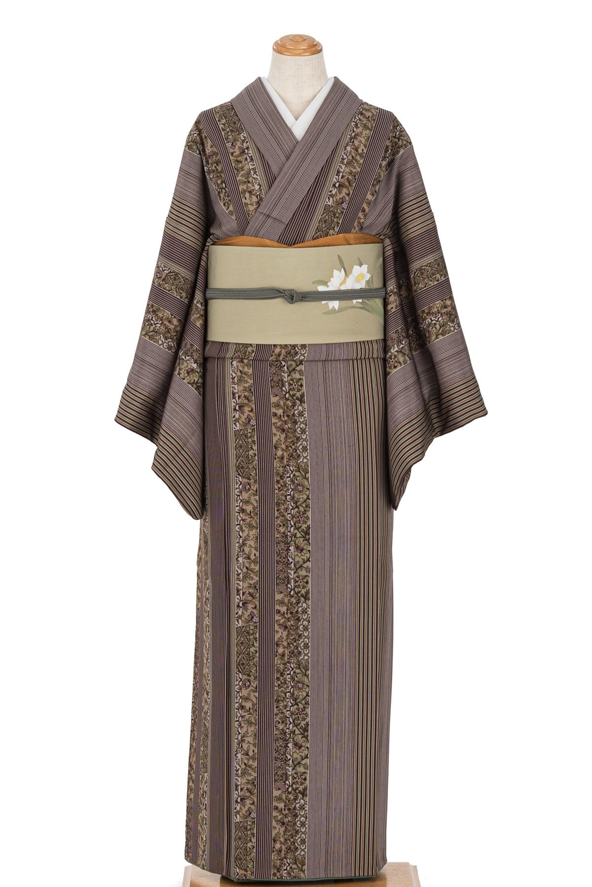 小豆茶や山葵色を基調に細い縞模様を染めた小紋の着物です。