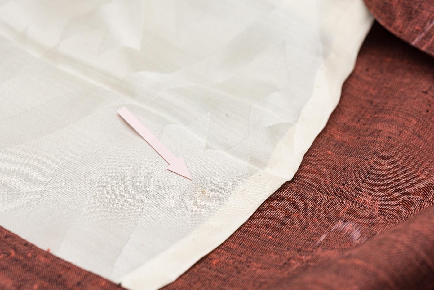 裏地全体が淡く黄変しています。