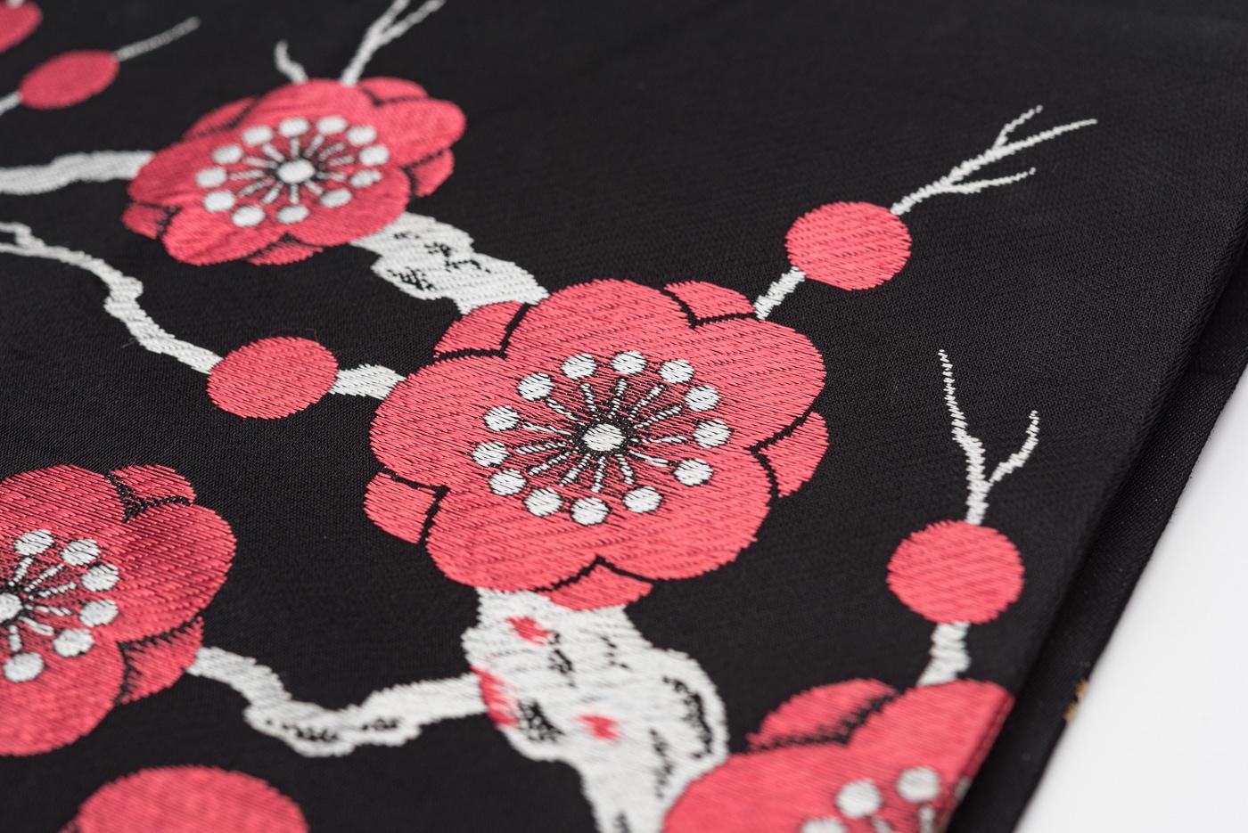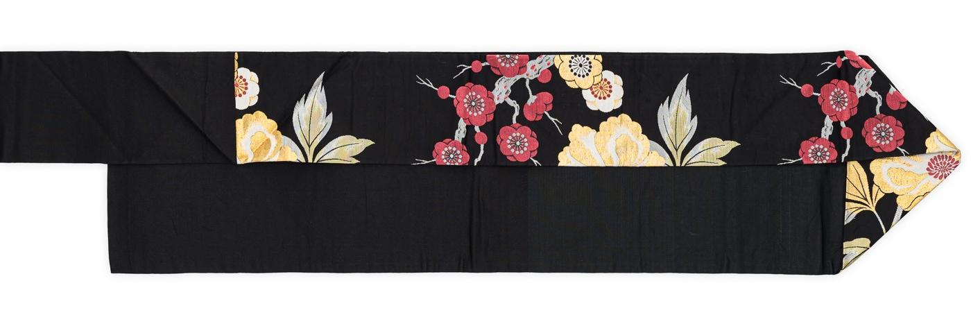 黒地に大きな牡丹と可憐な梅を織り出したアンティークの九寸名古屋帯です。