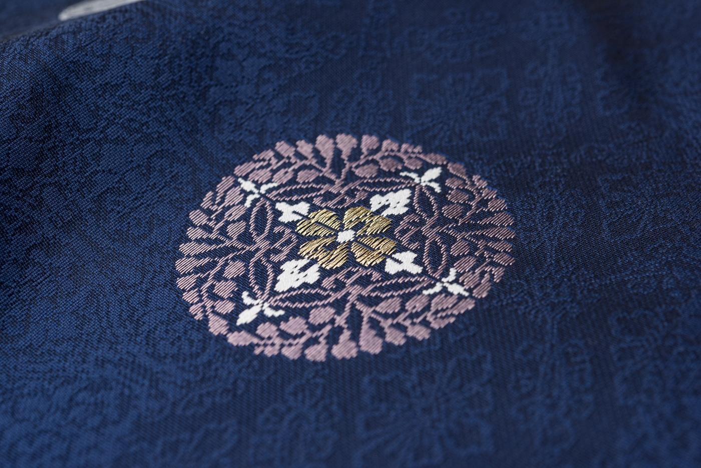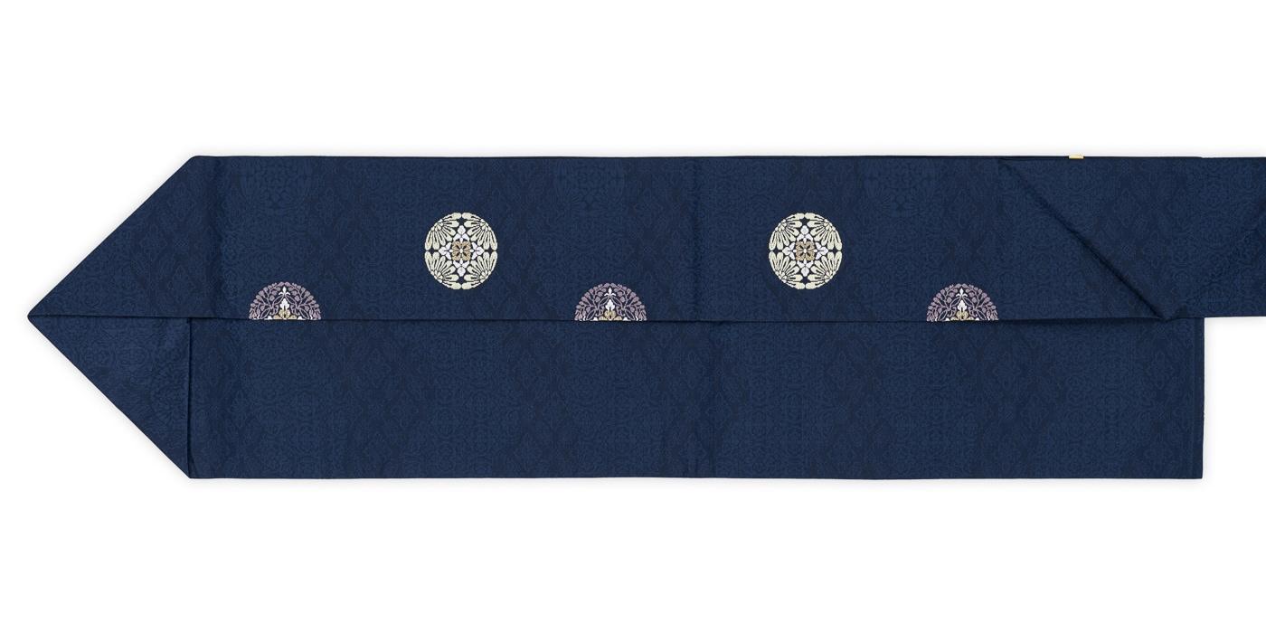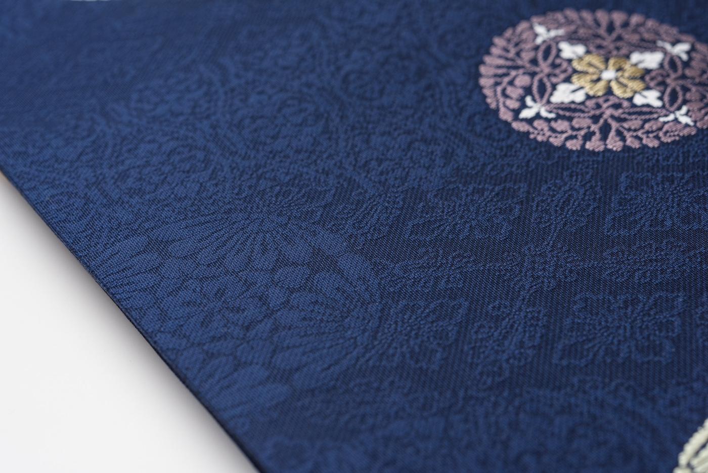 濃紺地に華丸紋を織り出した九寸名古屋帯です。