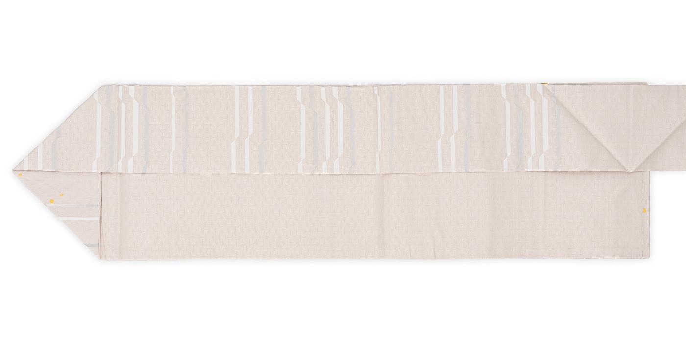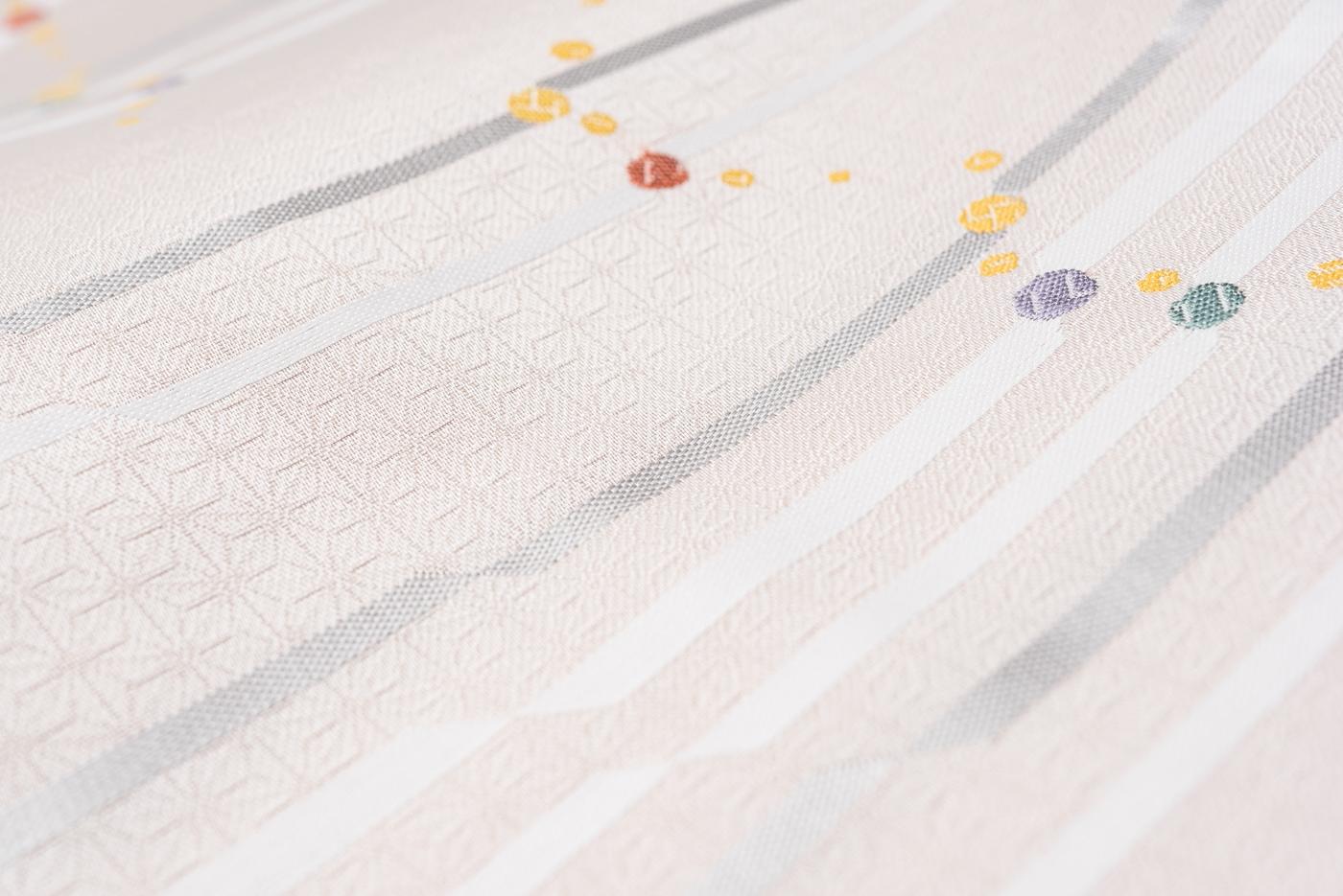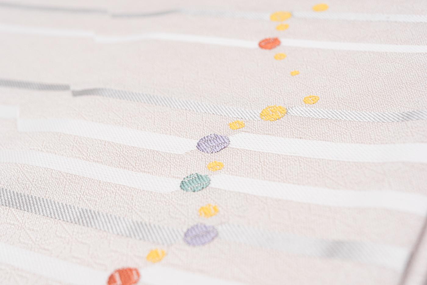 リボンのようなラインの上にカラフルなドット模様を重ねた九寸名古屋帯です。