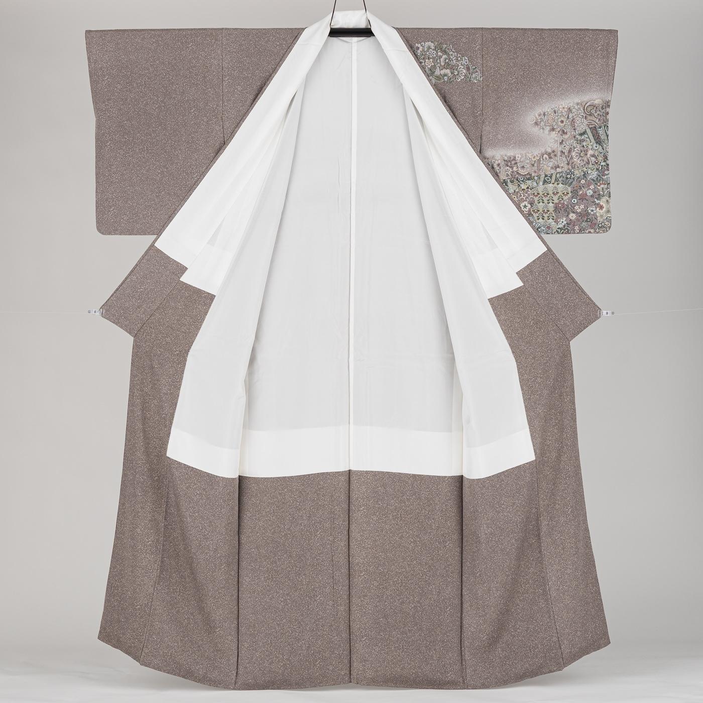 ゆったりと広がる霞取りに花更紗模様を描いた一つ紋入りの訪問着です。