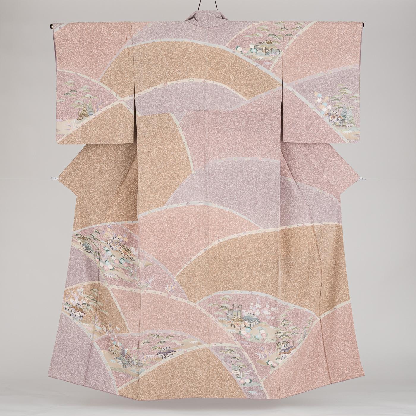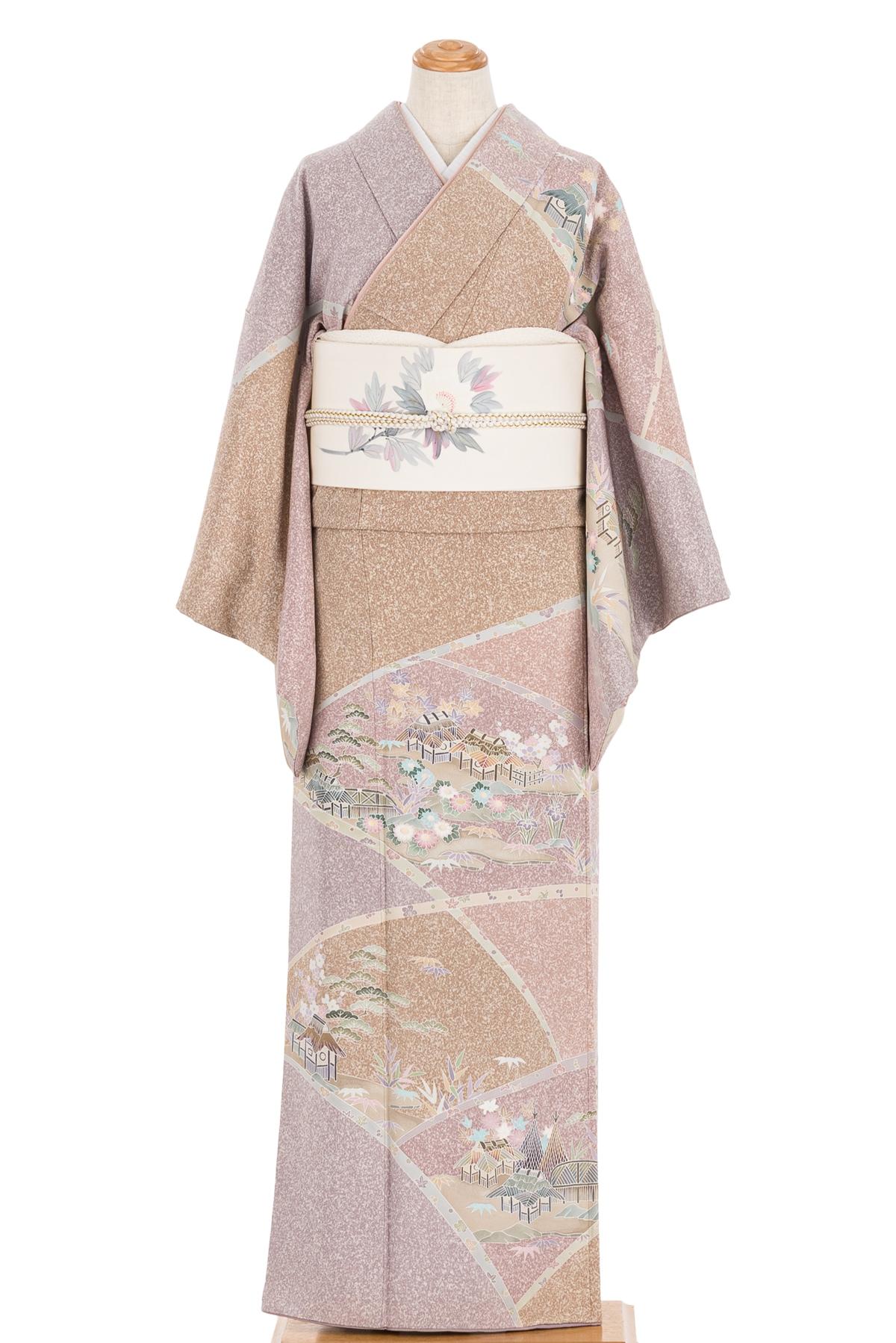 落ち着いたピンクやベージュの地に茶屋辻模様を描いた訪問着です。