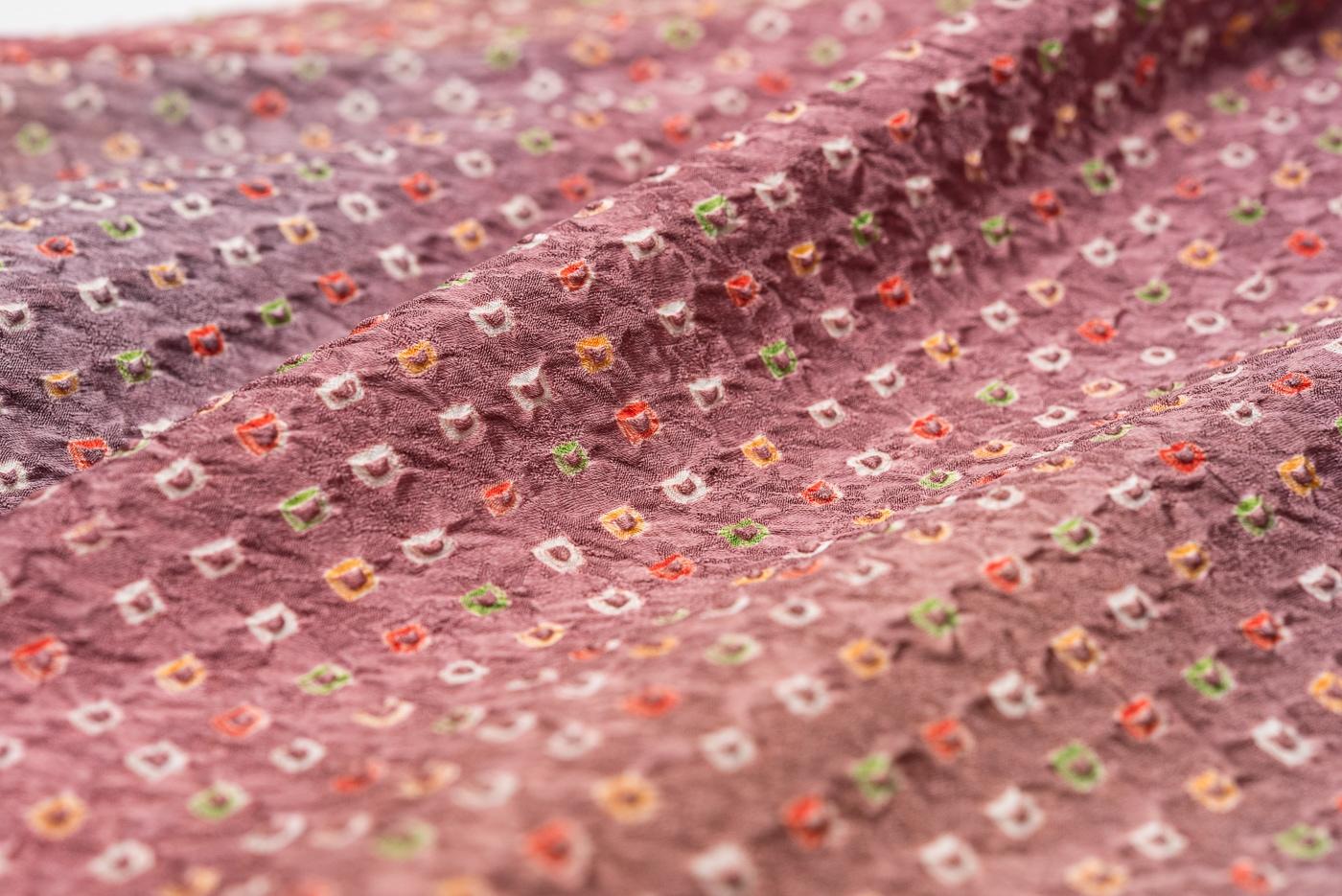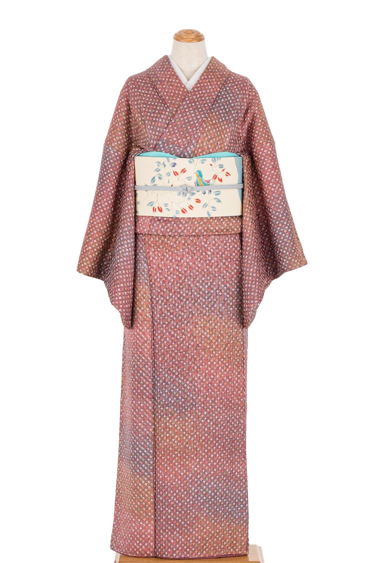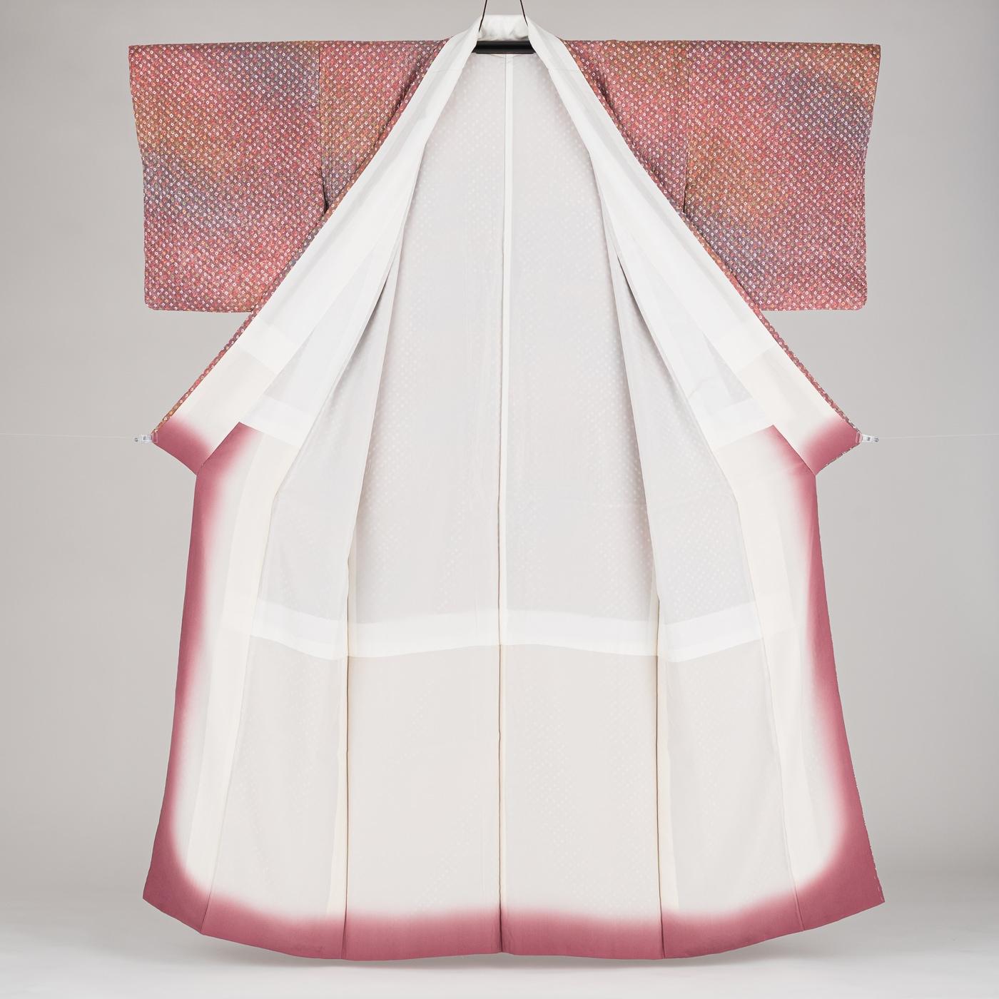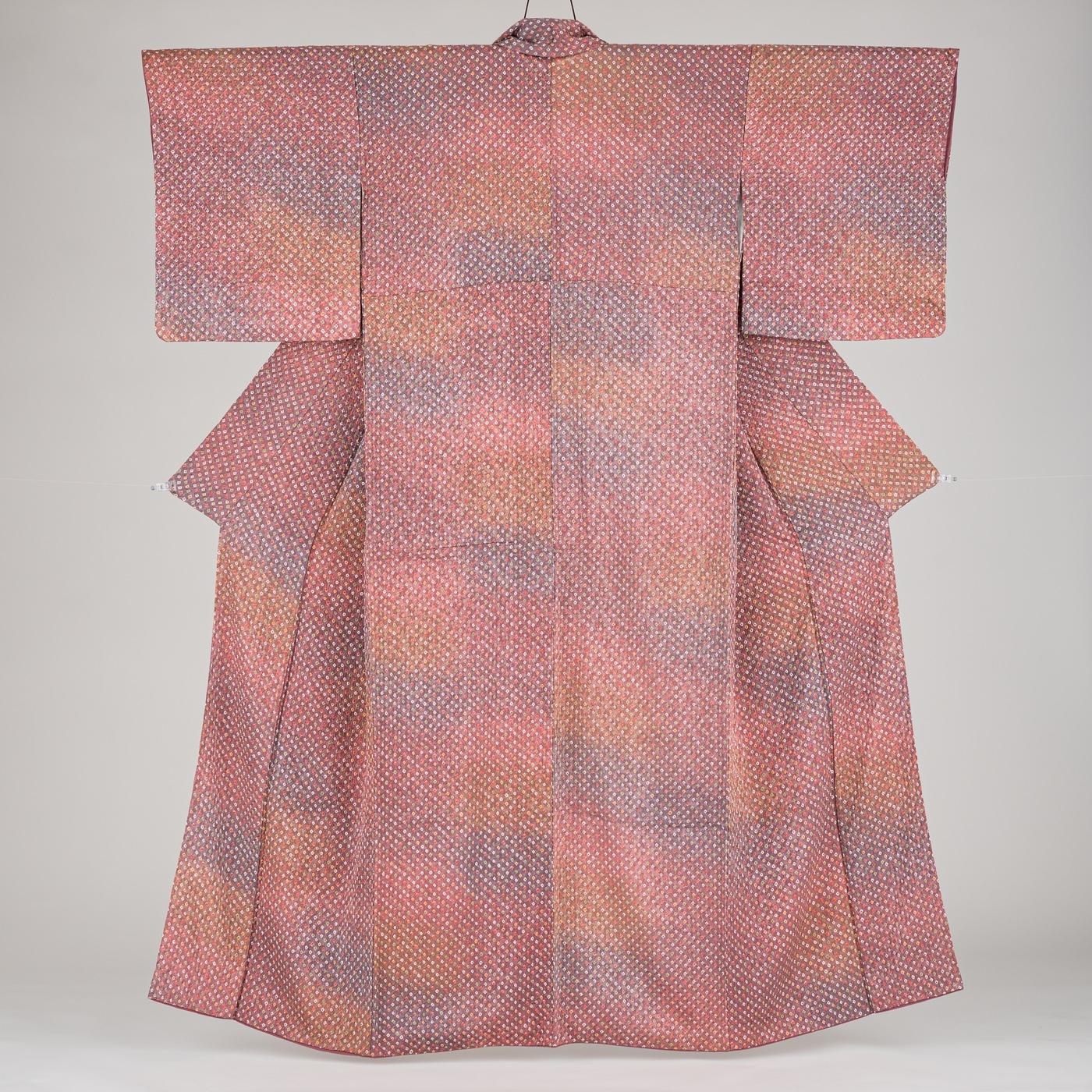 ピンクを基調とした暈し地に絞りのドット柄が広がる着物です。