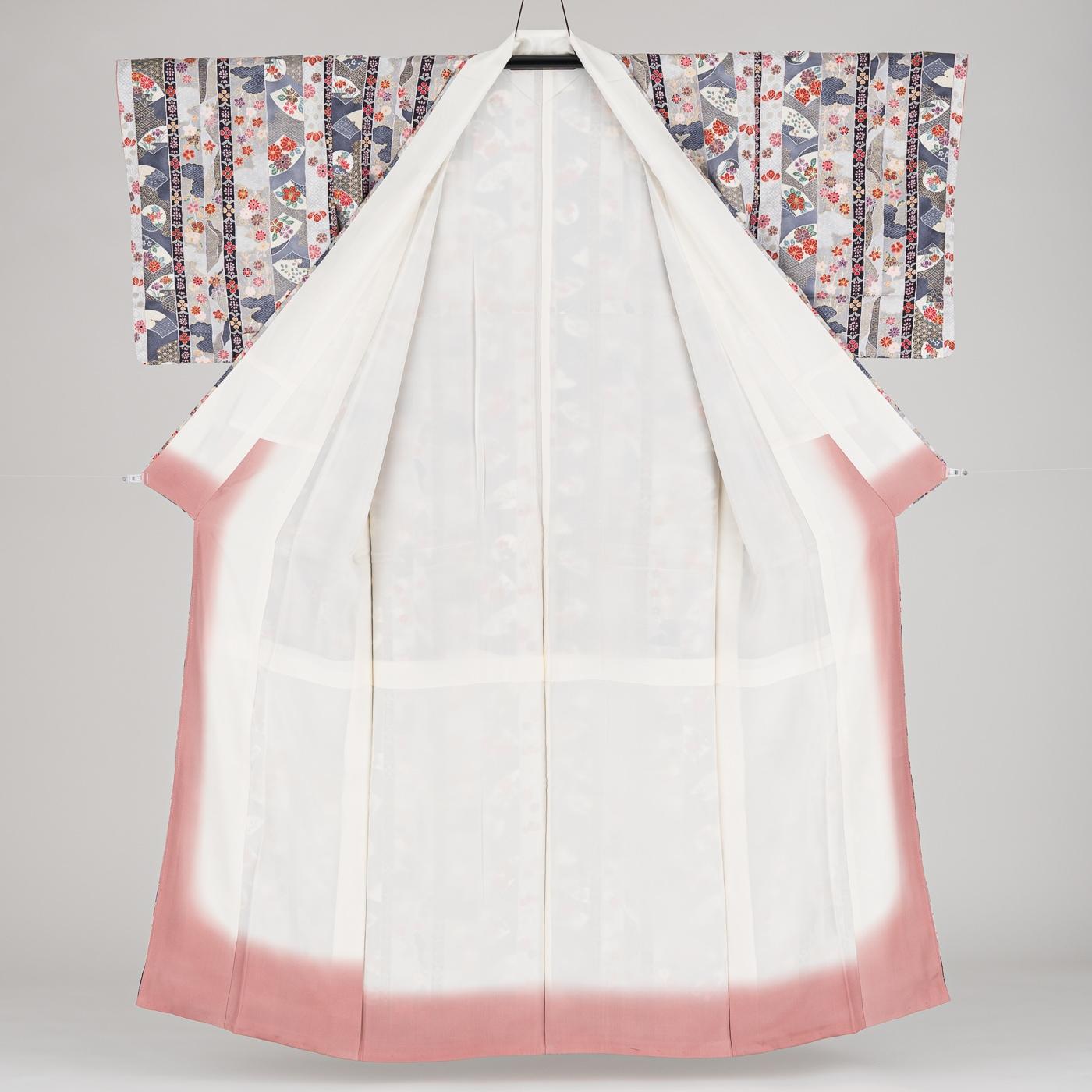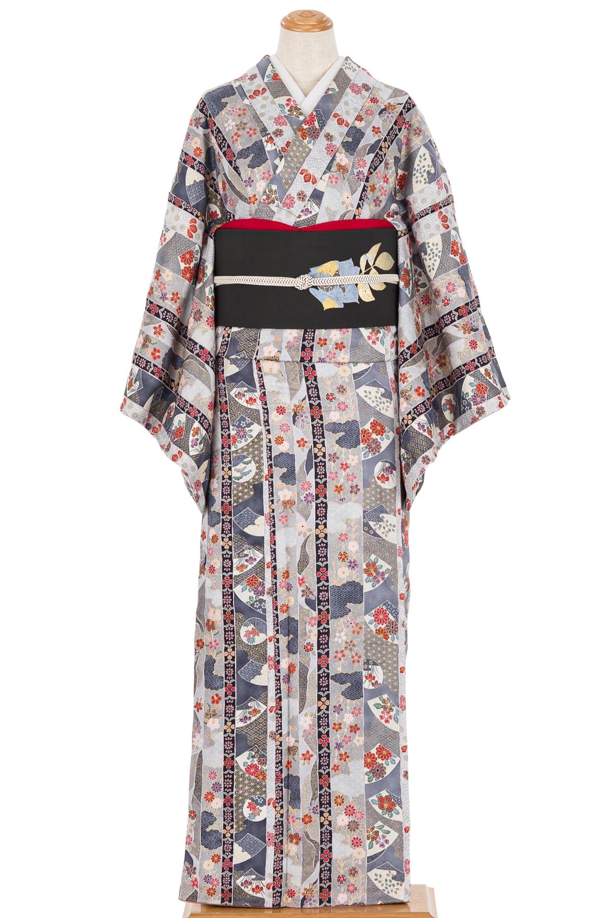 縞に地紙や花などの模様を添えた小紋の着物です。