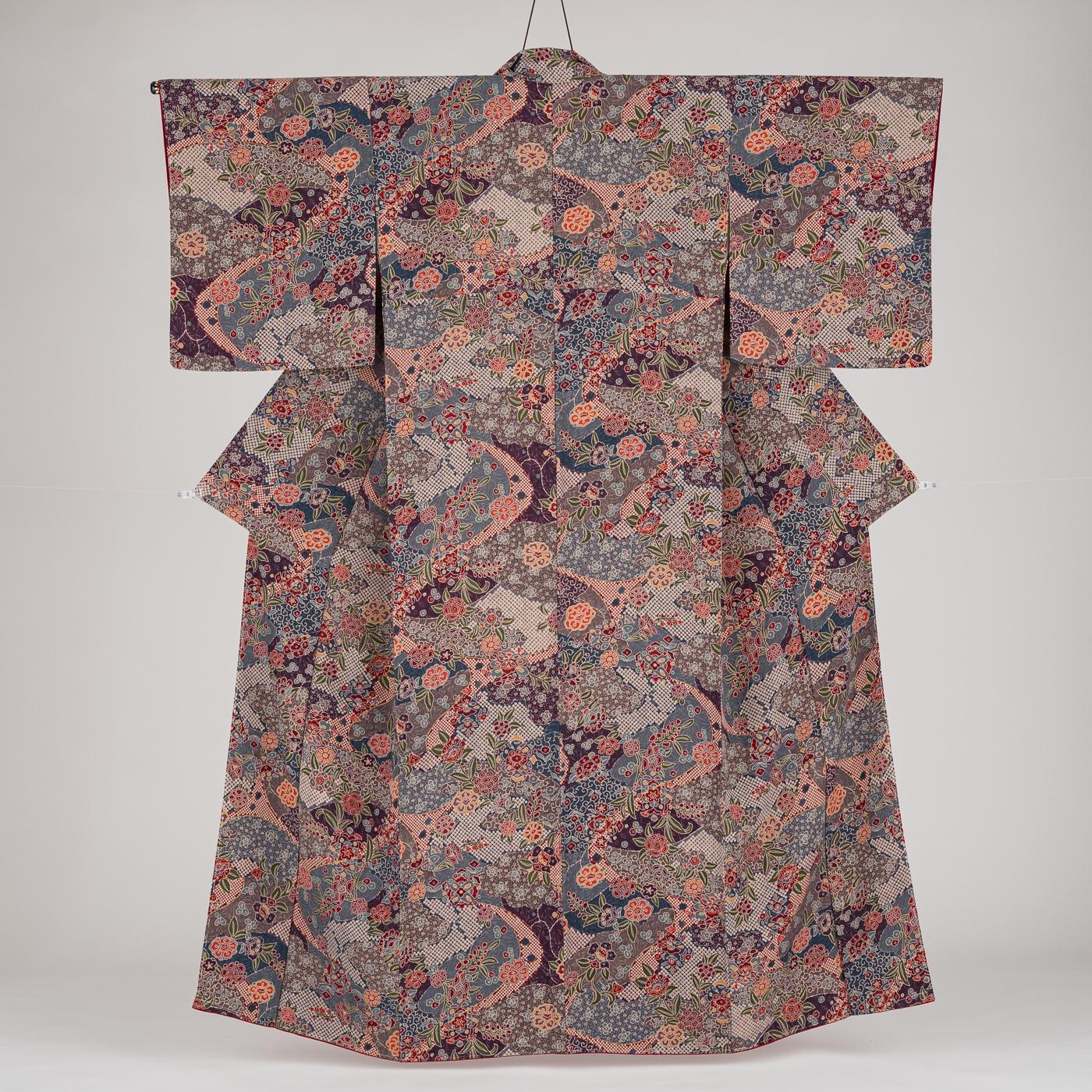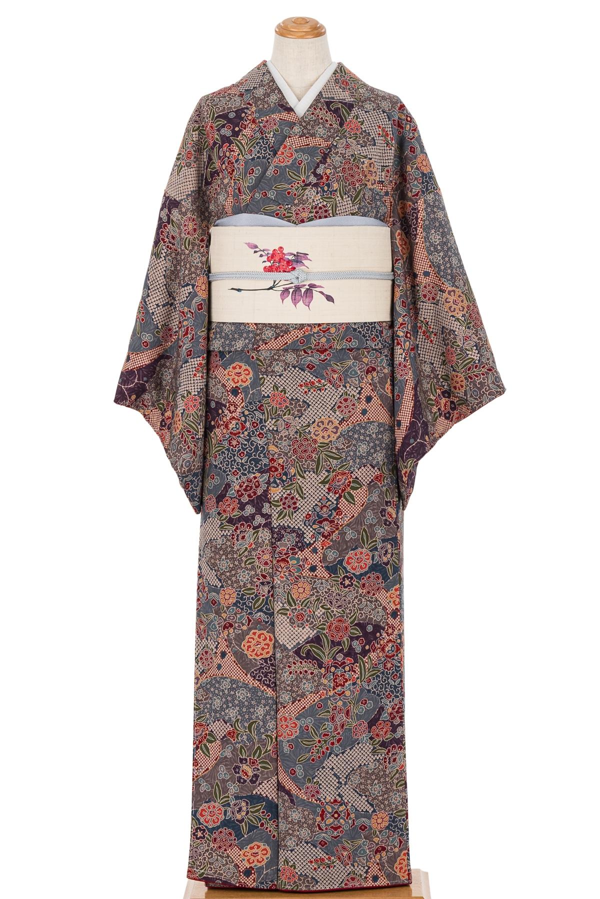 更紗や鹿の子の文様を染めた小紋の着物です。
