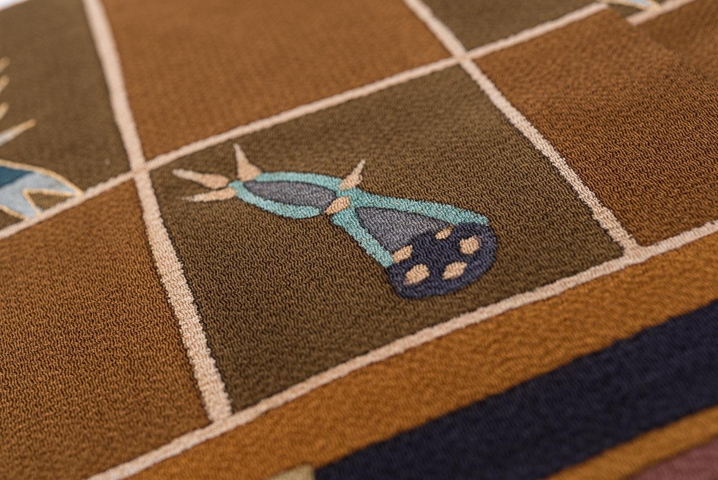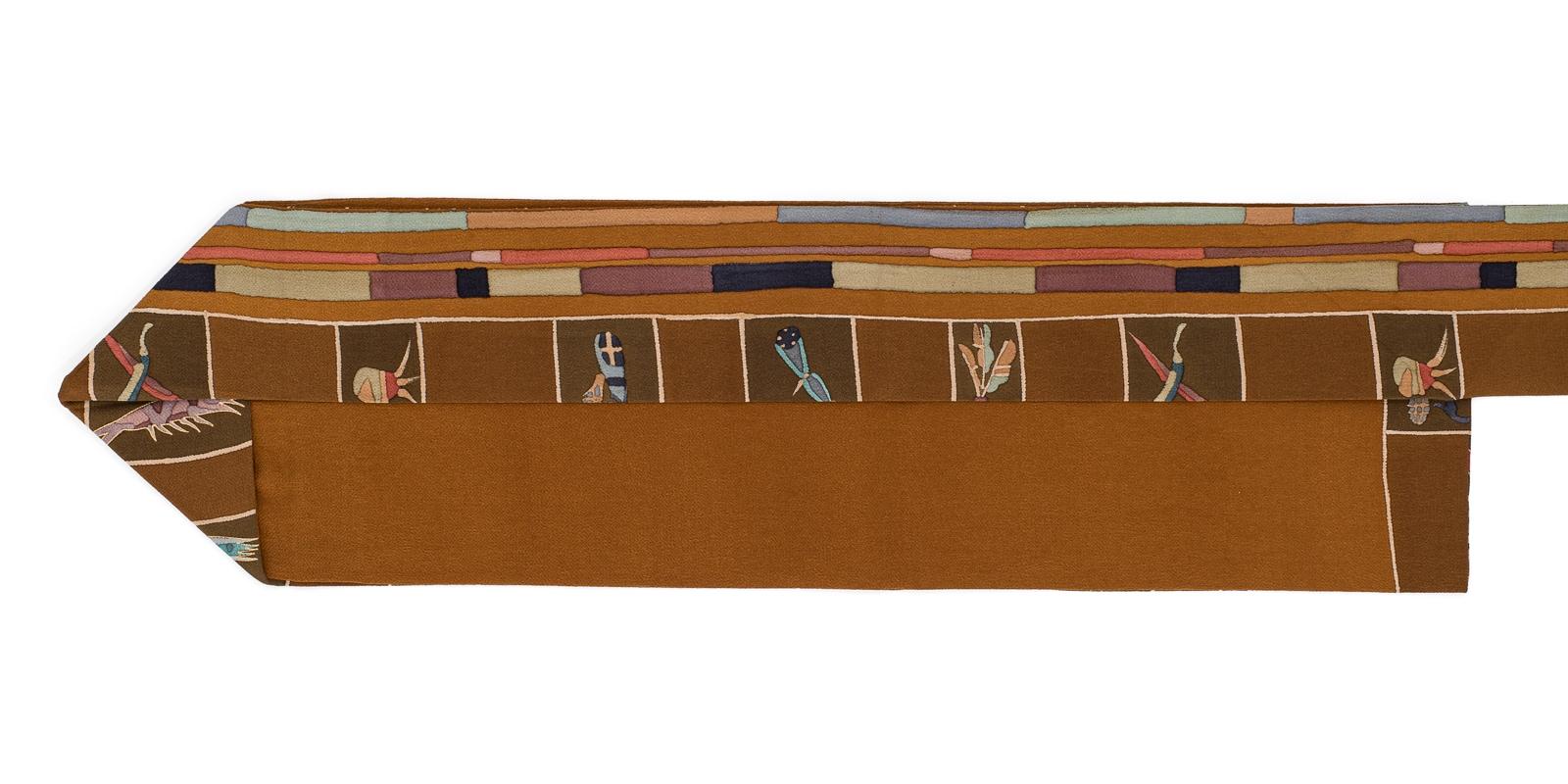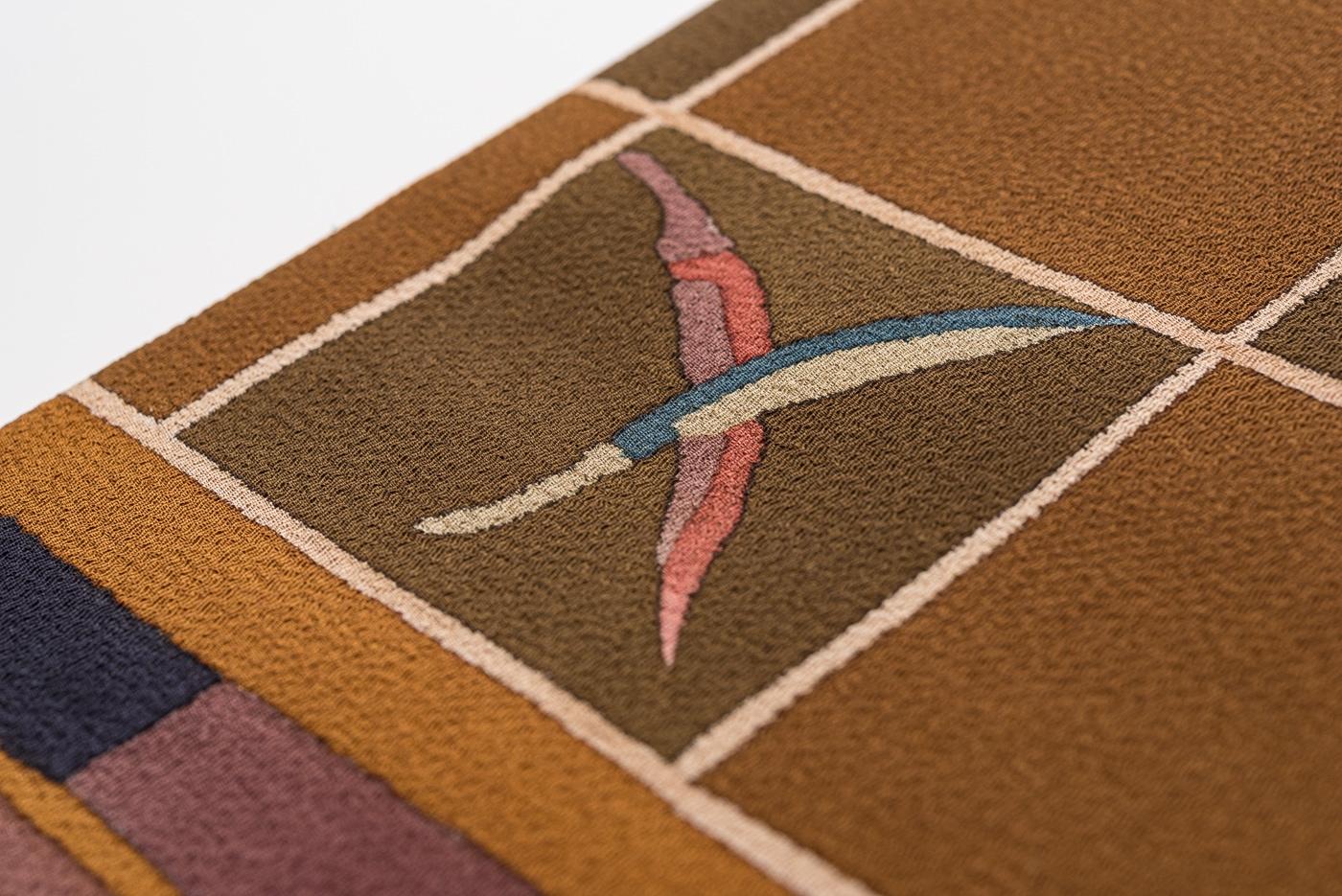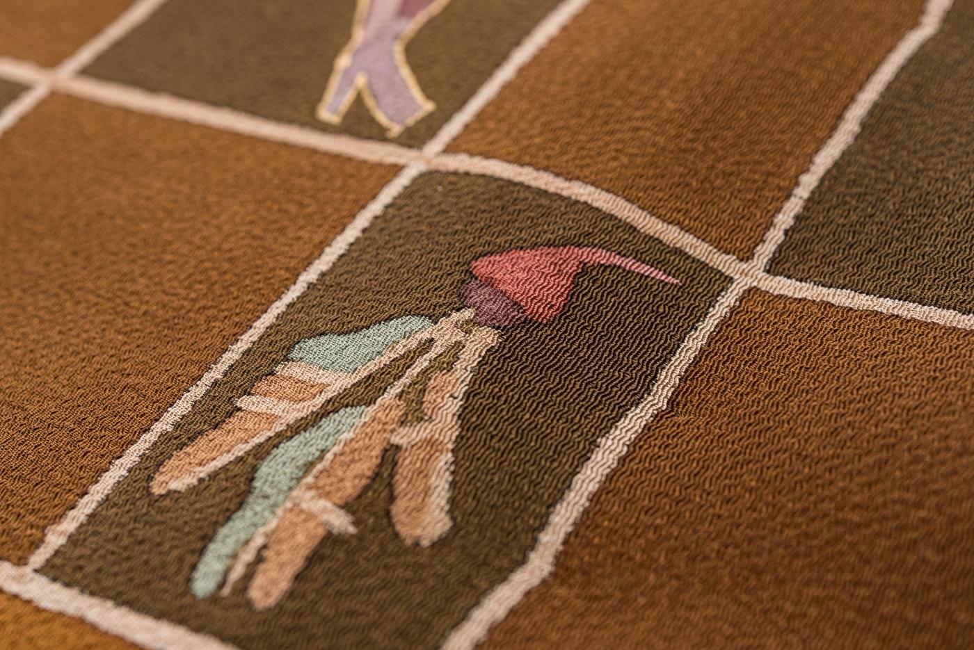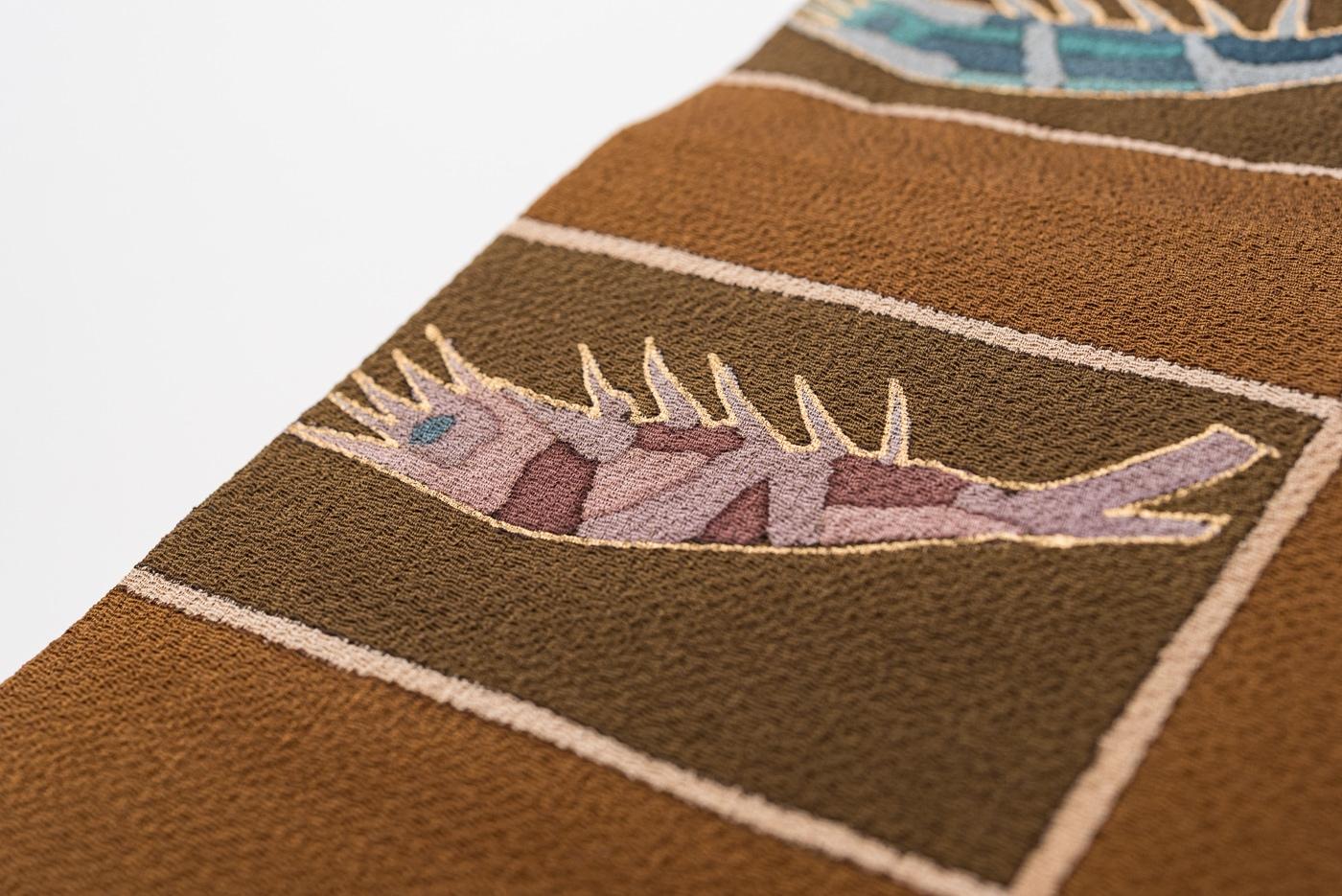 茶の市松に海老と野菜を染めた縮緬地の九寸名古屋帯です。