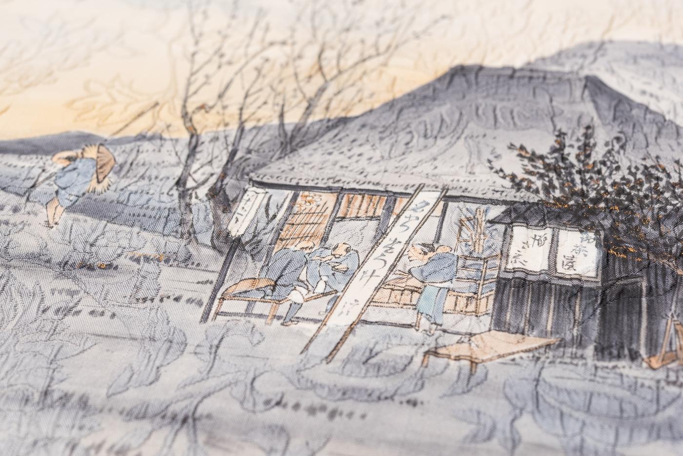洒落袋帯●膨れ織り 東海道五十三次 丸子宿