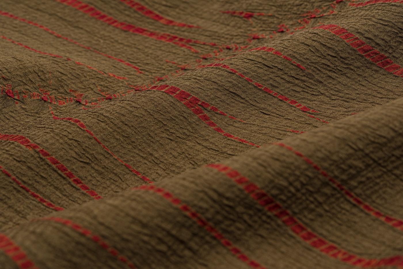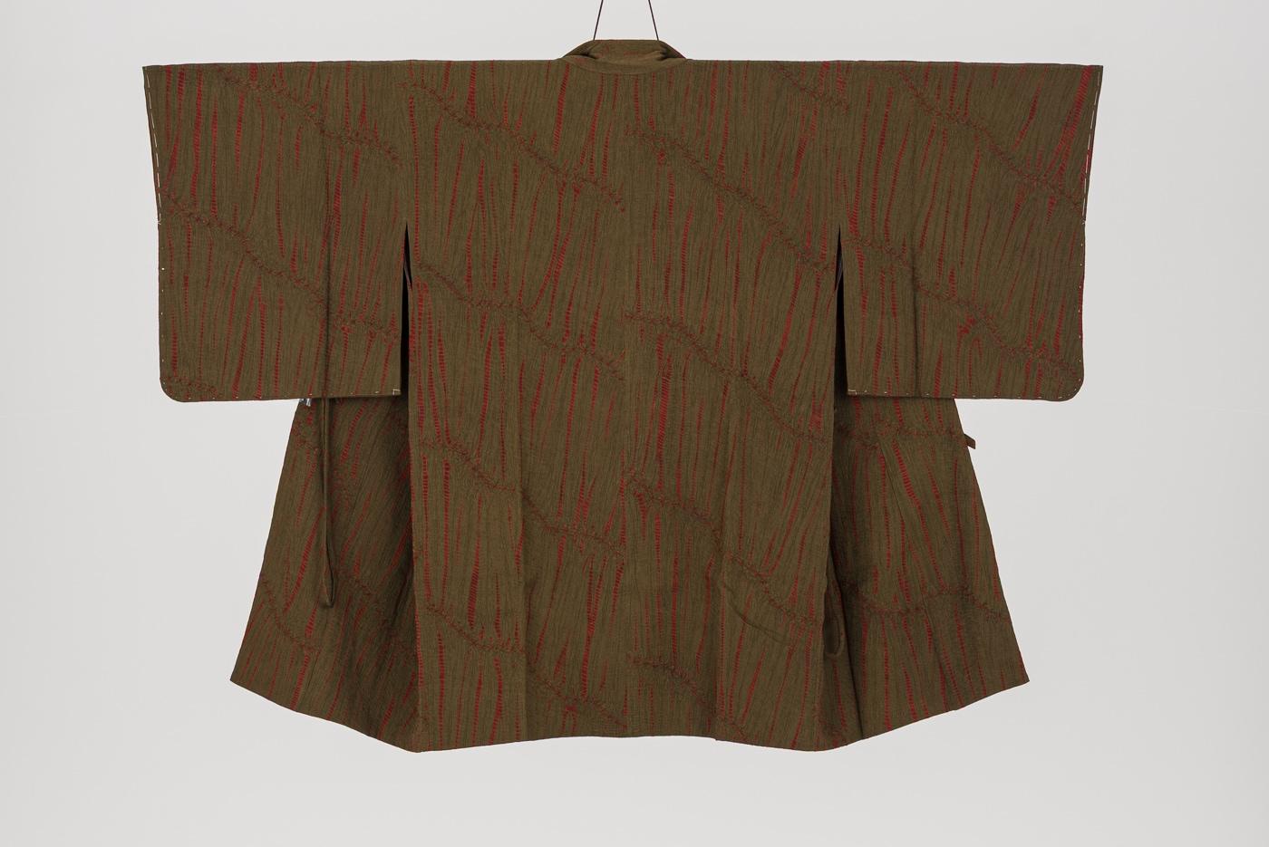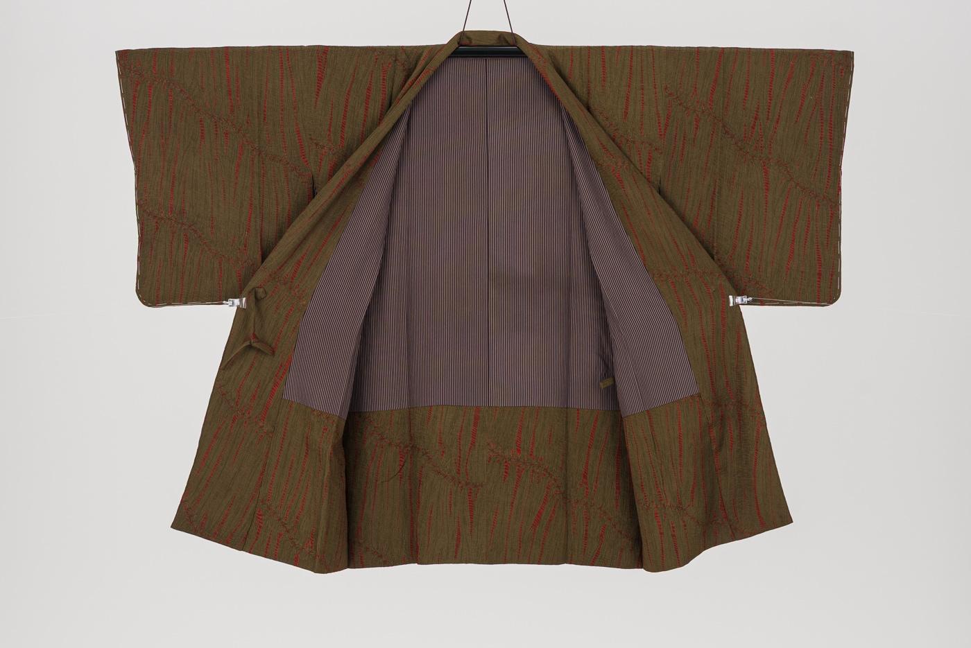 茶の地に竜巻絞りのランダムな赤い縞模様が浮かぶロング丈の道中着です。
