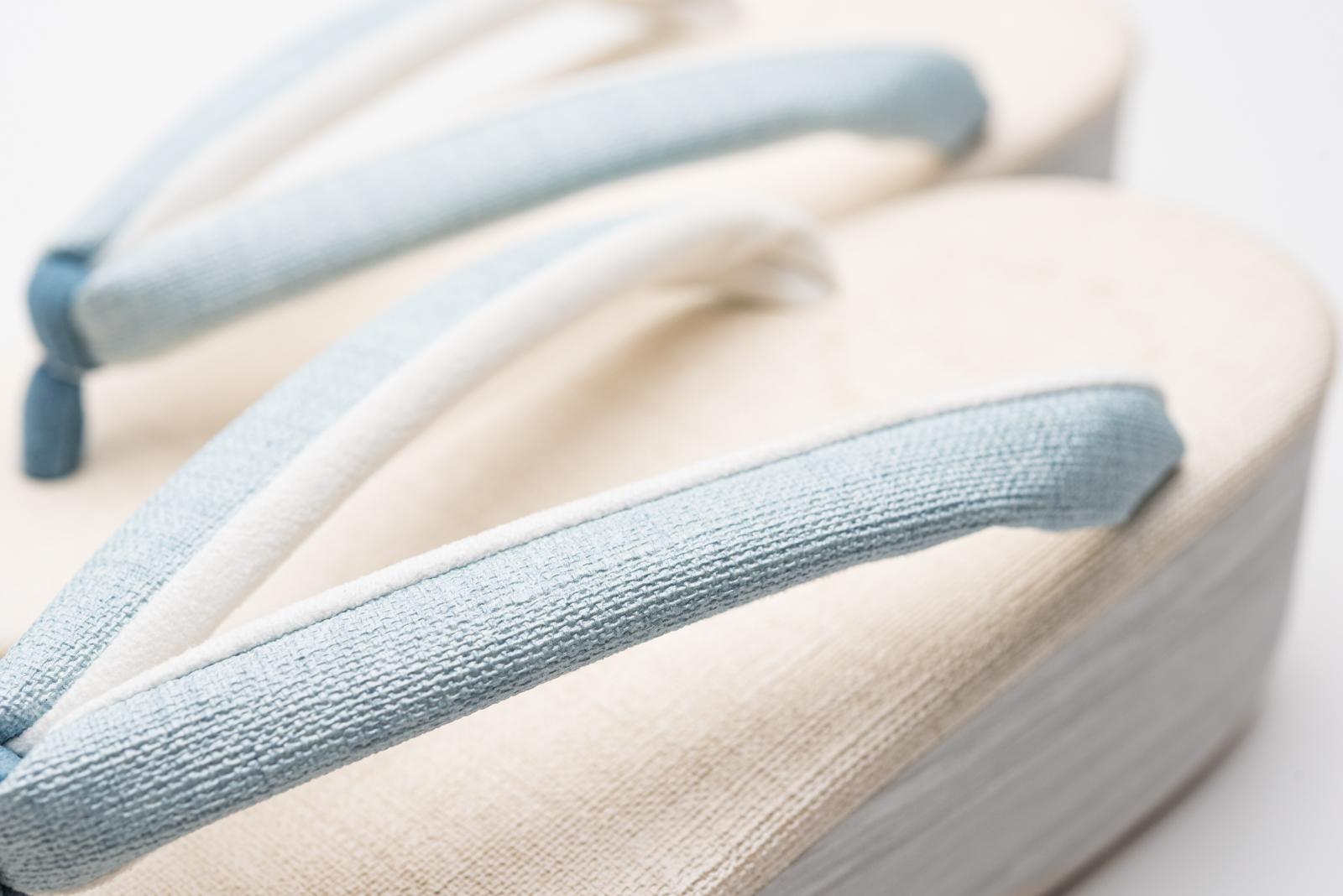生成りの台に水色の鼻緒を合わせたカフェ草履です。