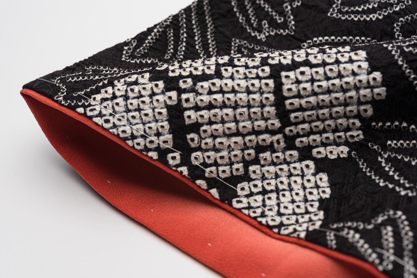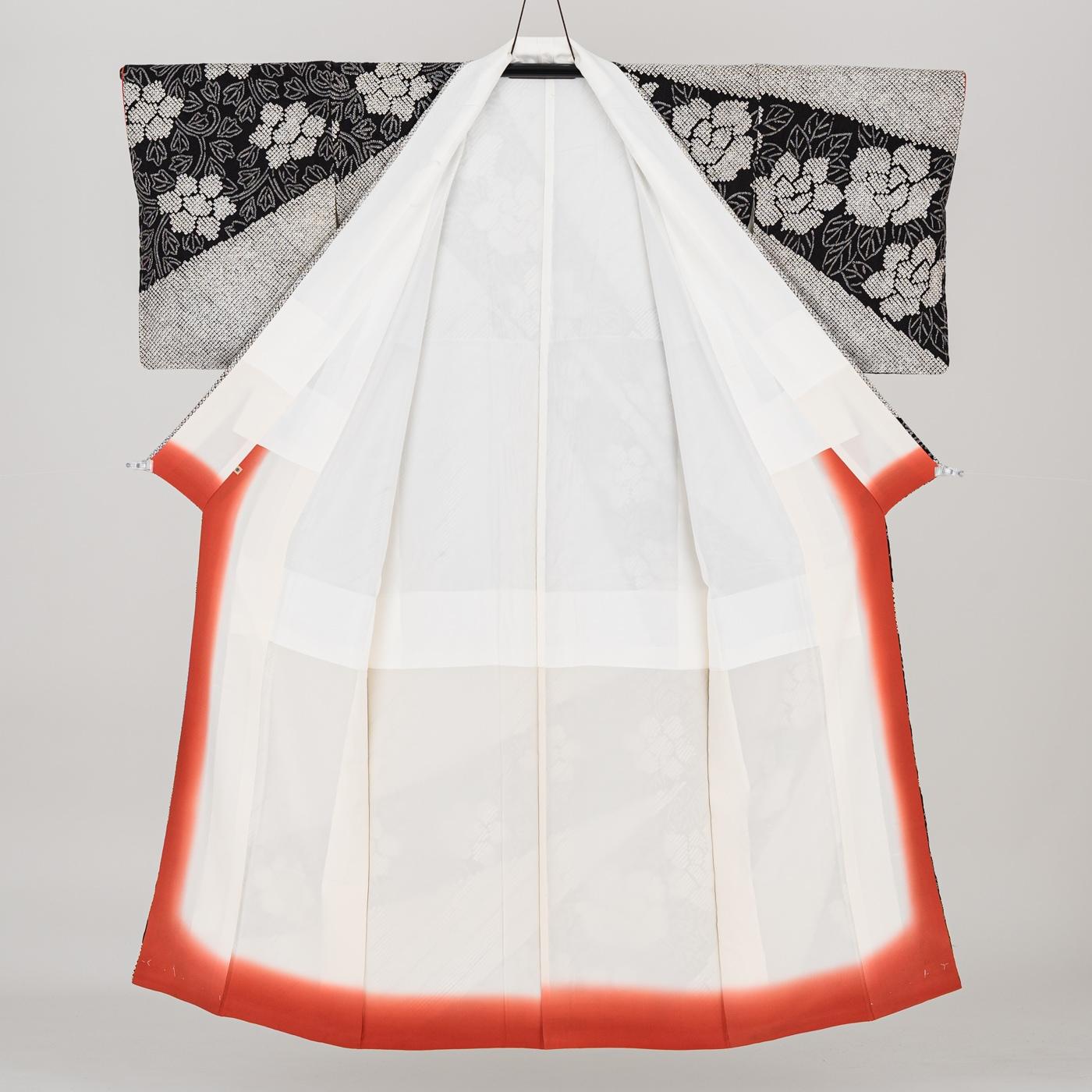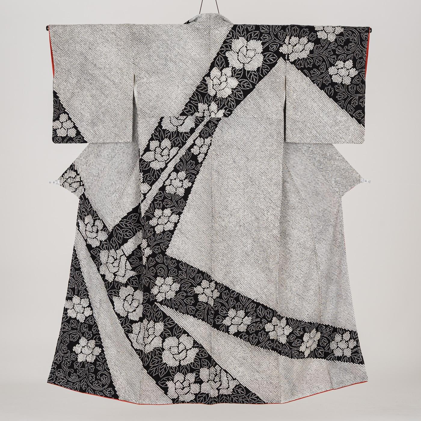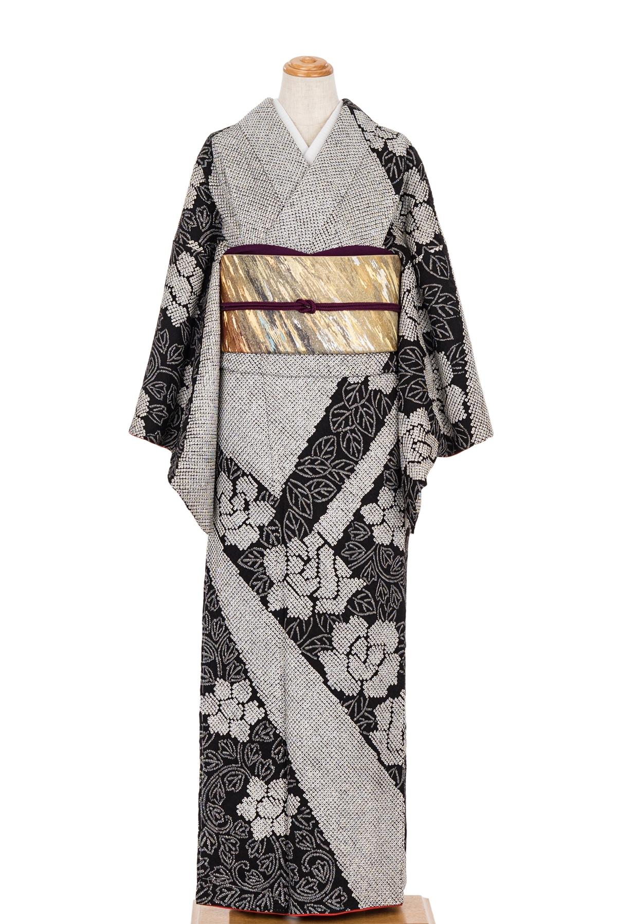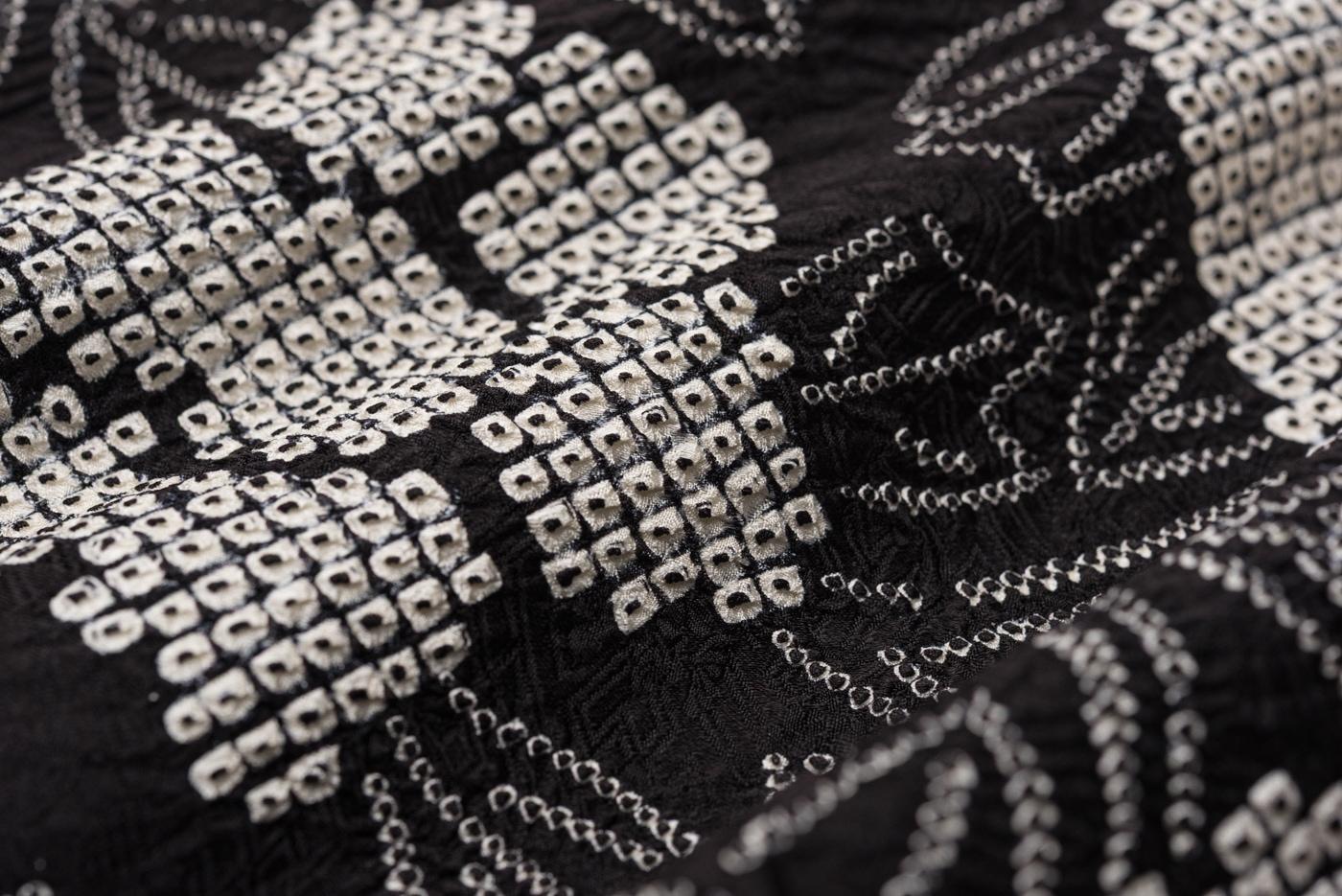 広がるリボンのような斜めのラインに牡丹唐草の文様が浮かぶ総絞りの訪問着です。