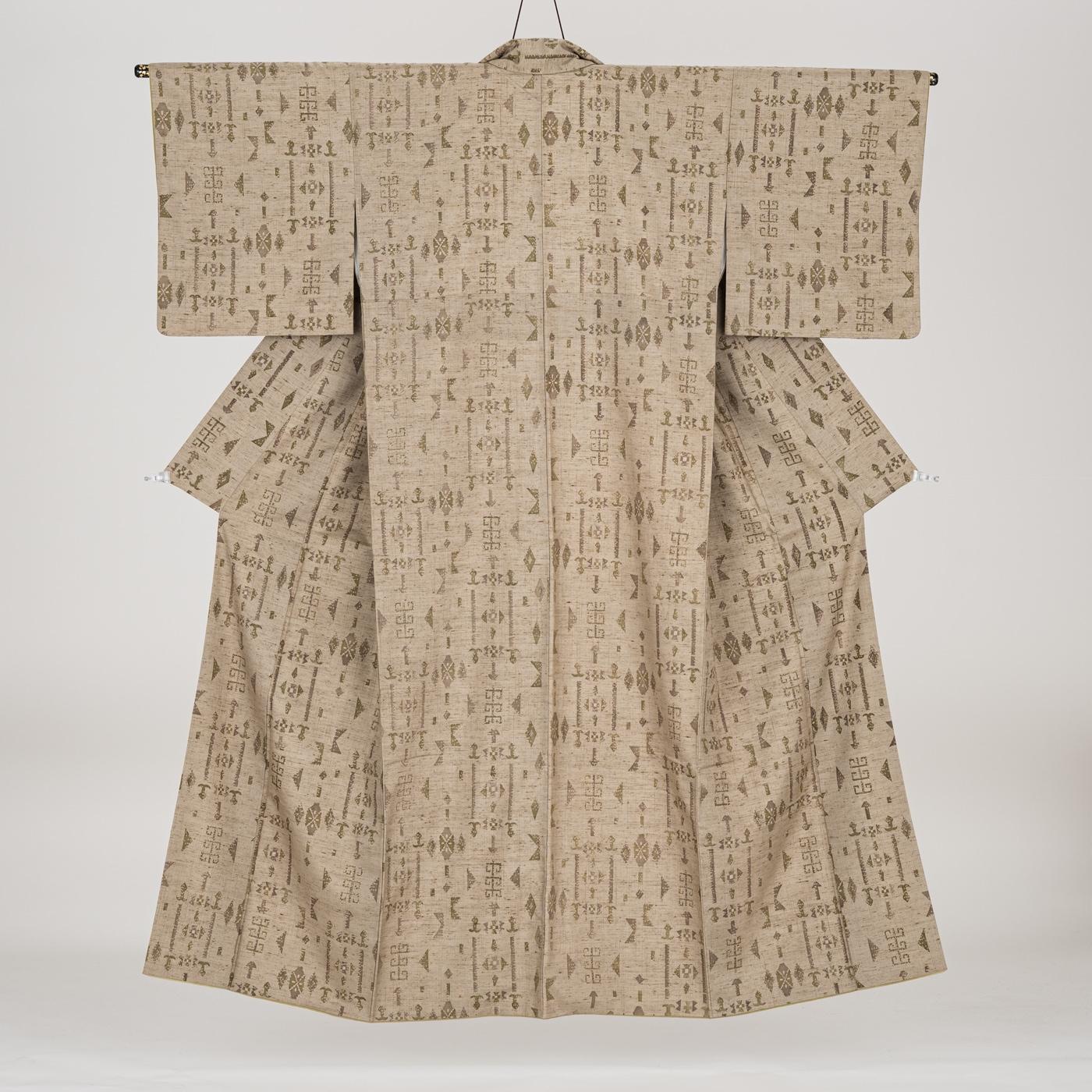 茶ベージュの地に抽象模様を染めた米沢ぜんまい紬の着物です。