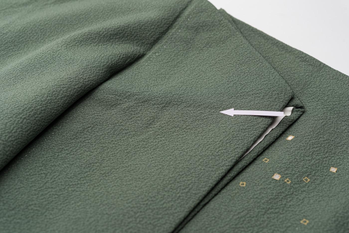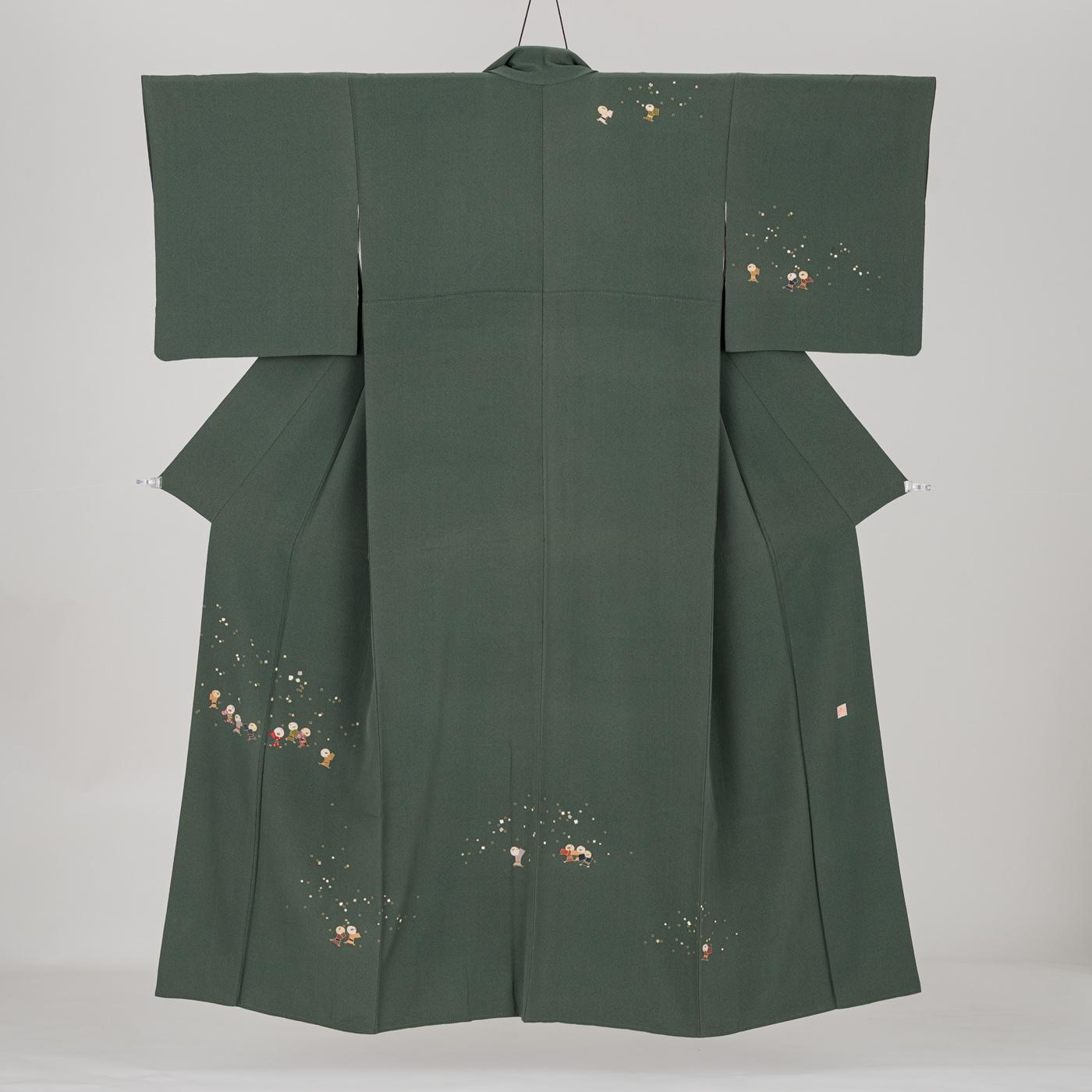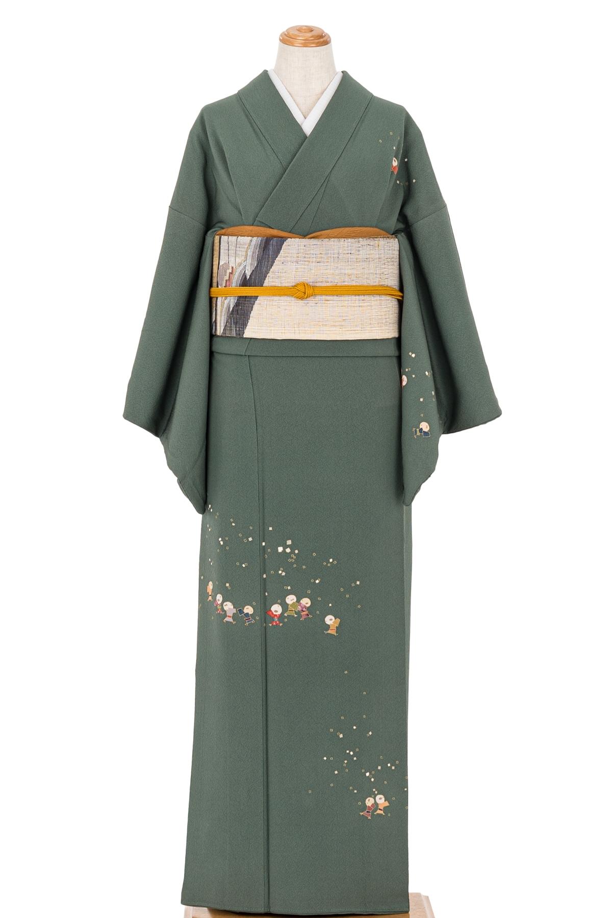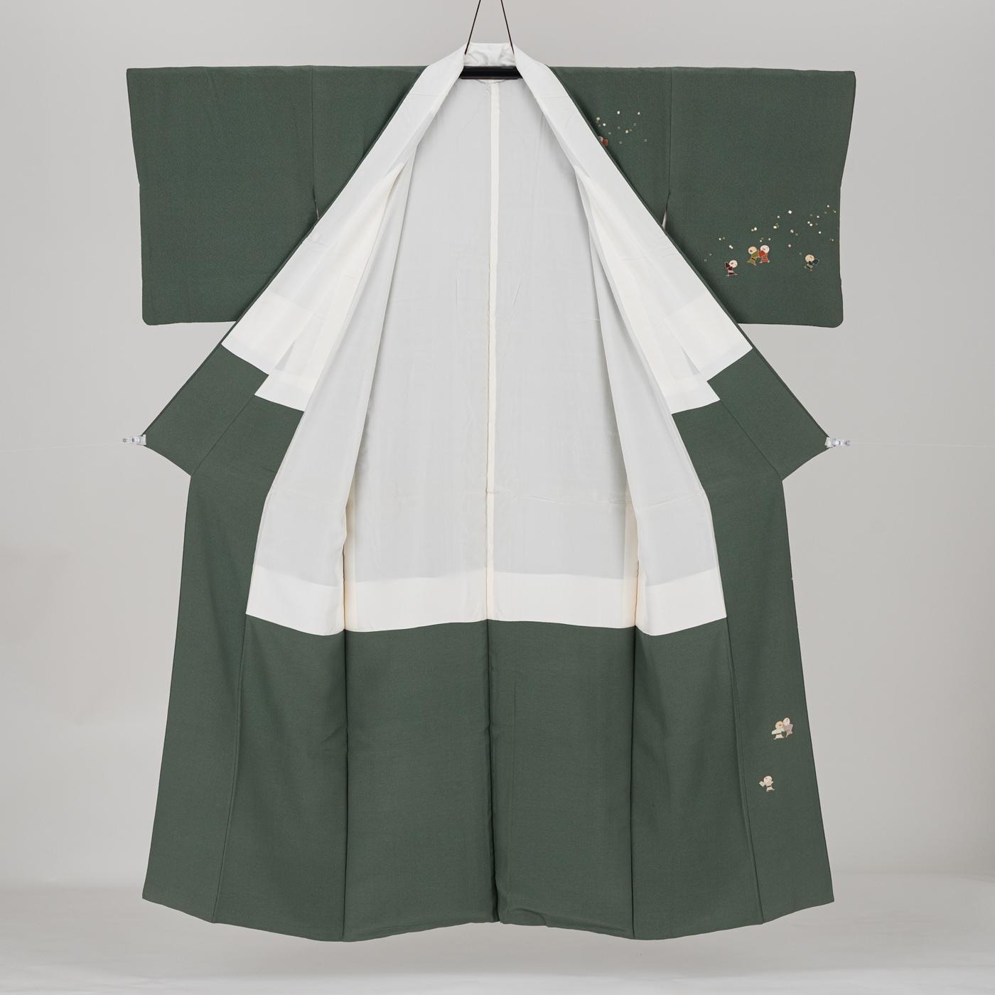 落ち着いた緑色の地に愛らしい童子の姿を描いた付け下げ訪問着です。