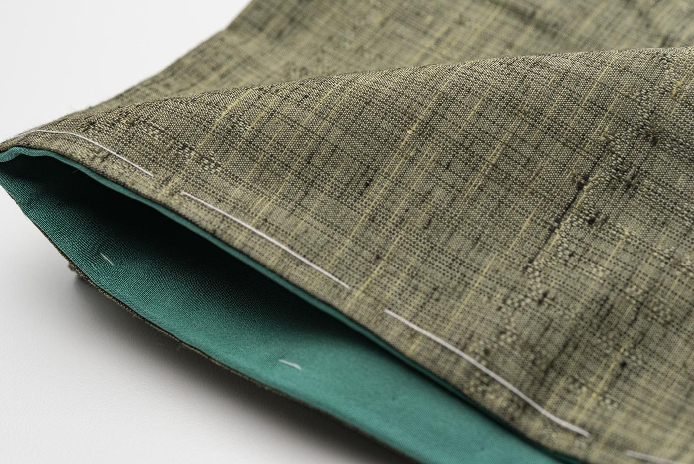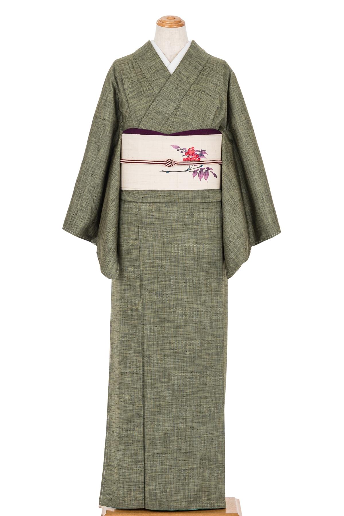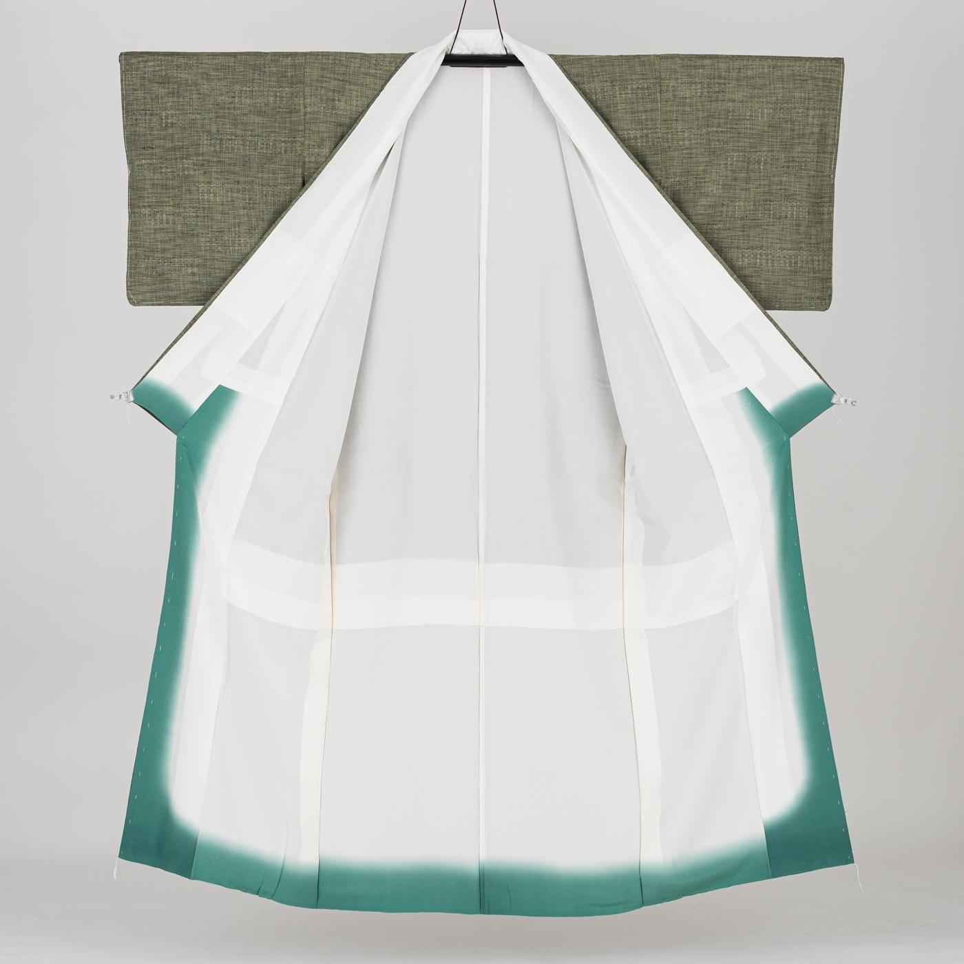 落ち着いた緑色の紬です。