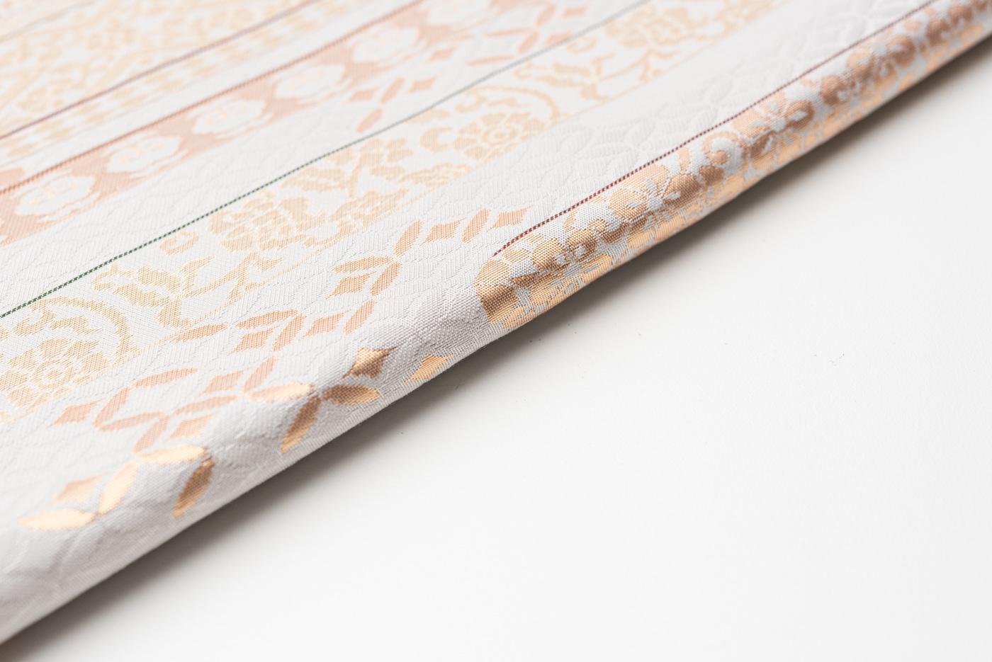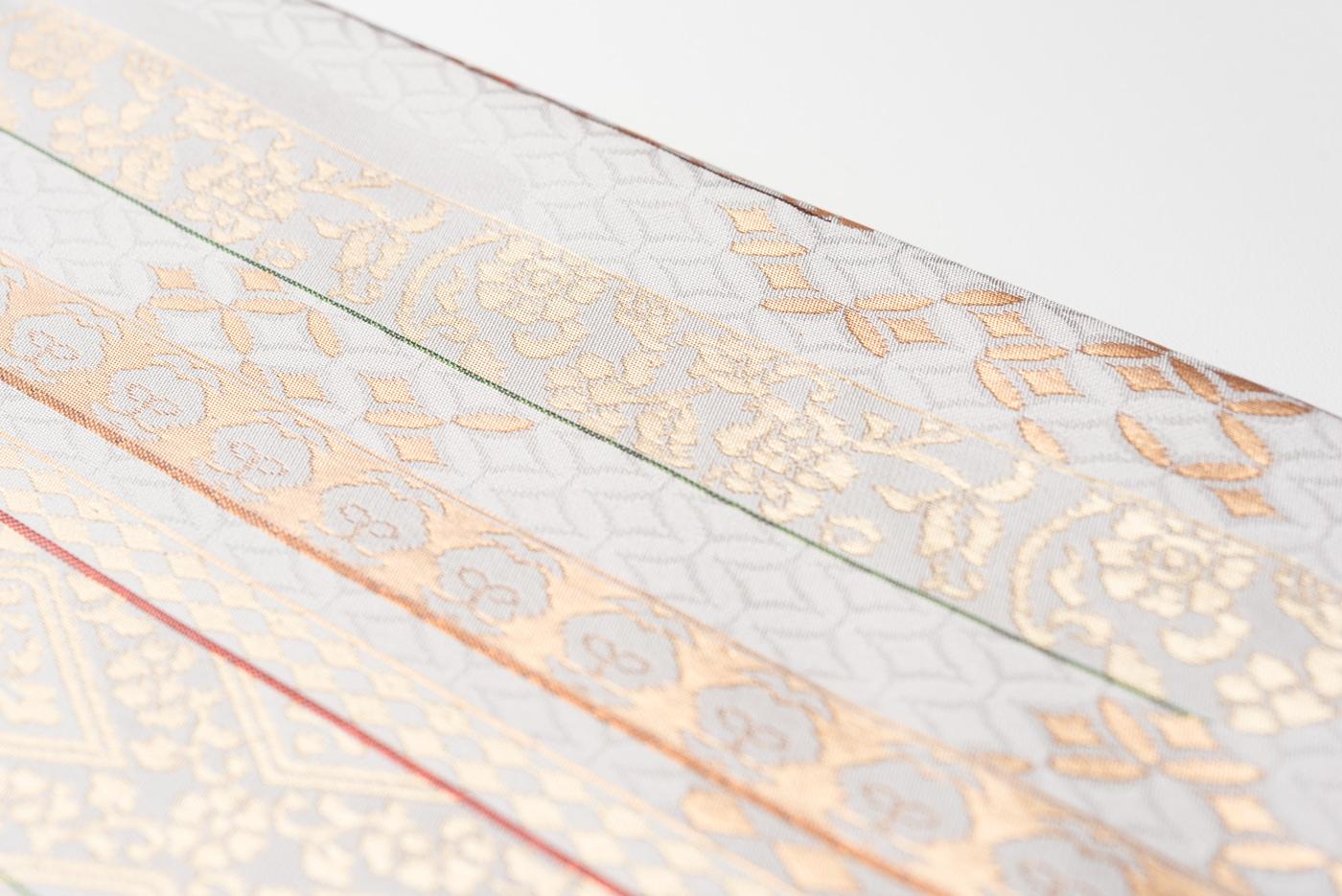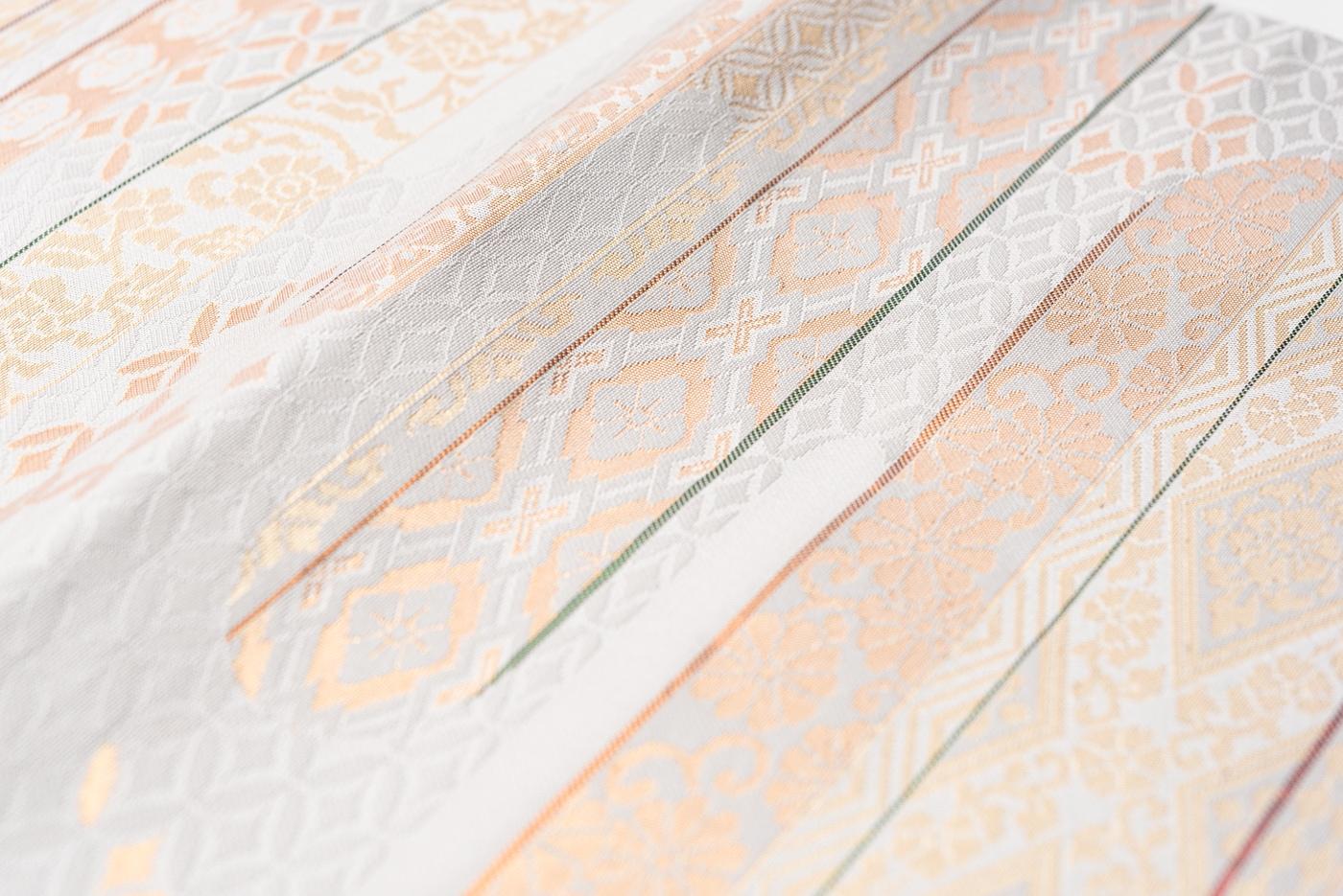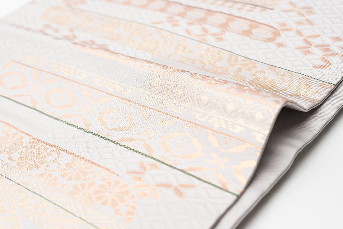 横段に菱、菊唐草、七宝、唐花などを織り出した九寸名古屋帯です。