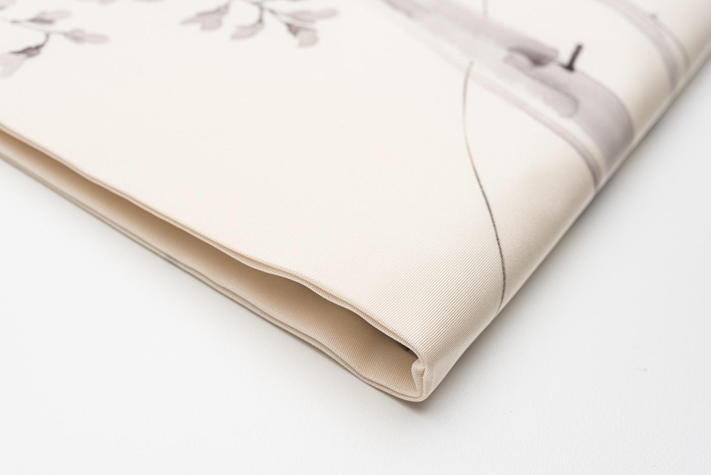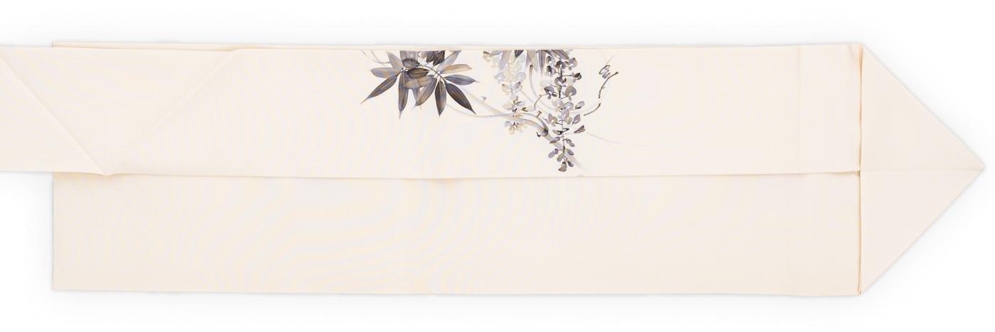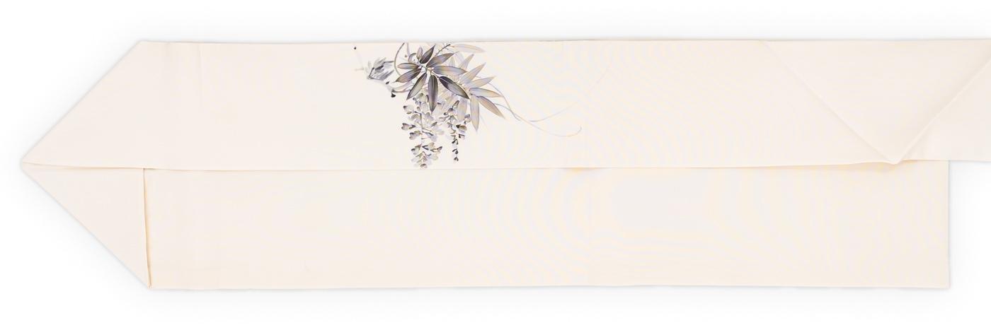 白の地に墨色で藤を描いた塩瀬の九寸名古屋帯です。