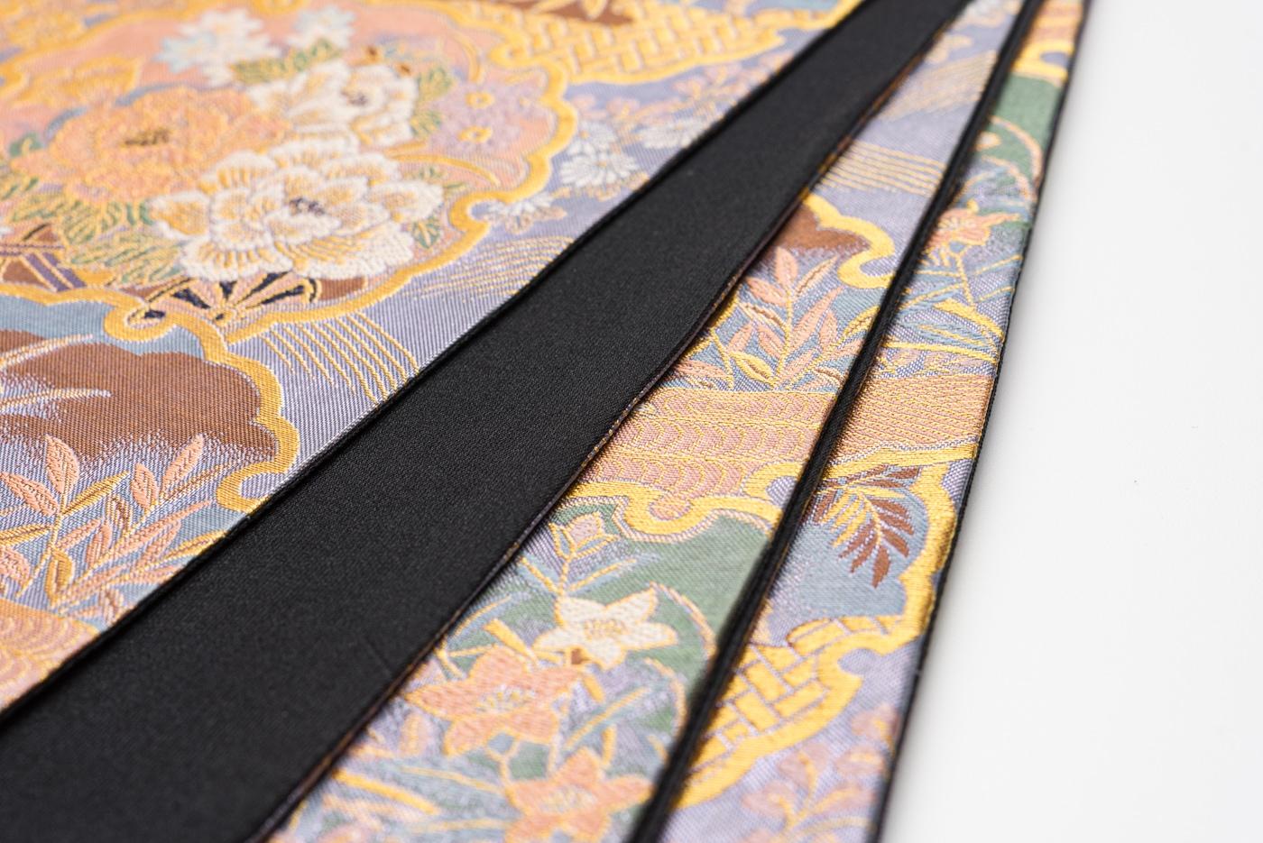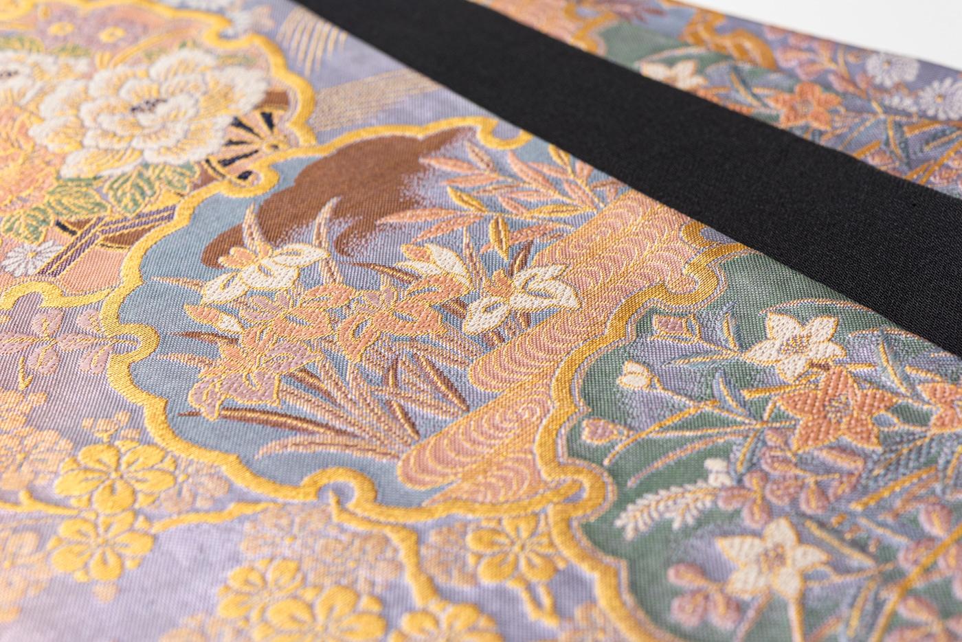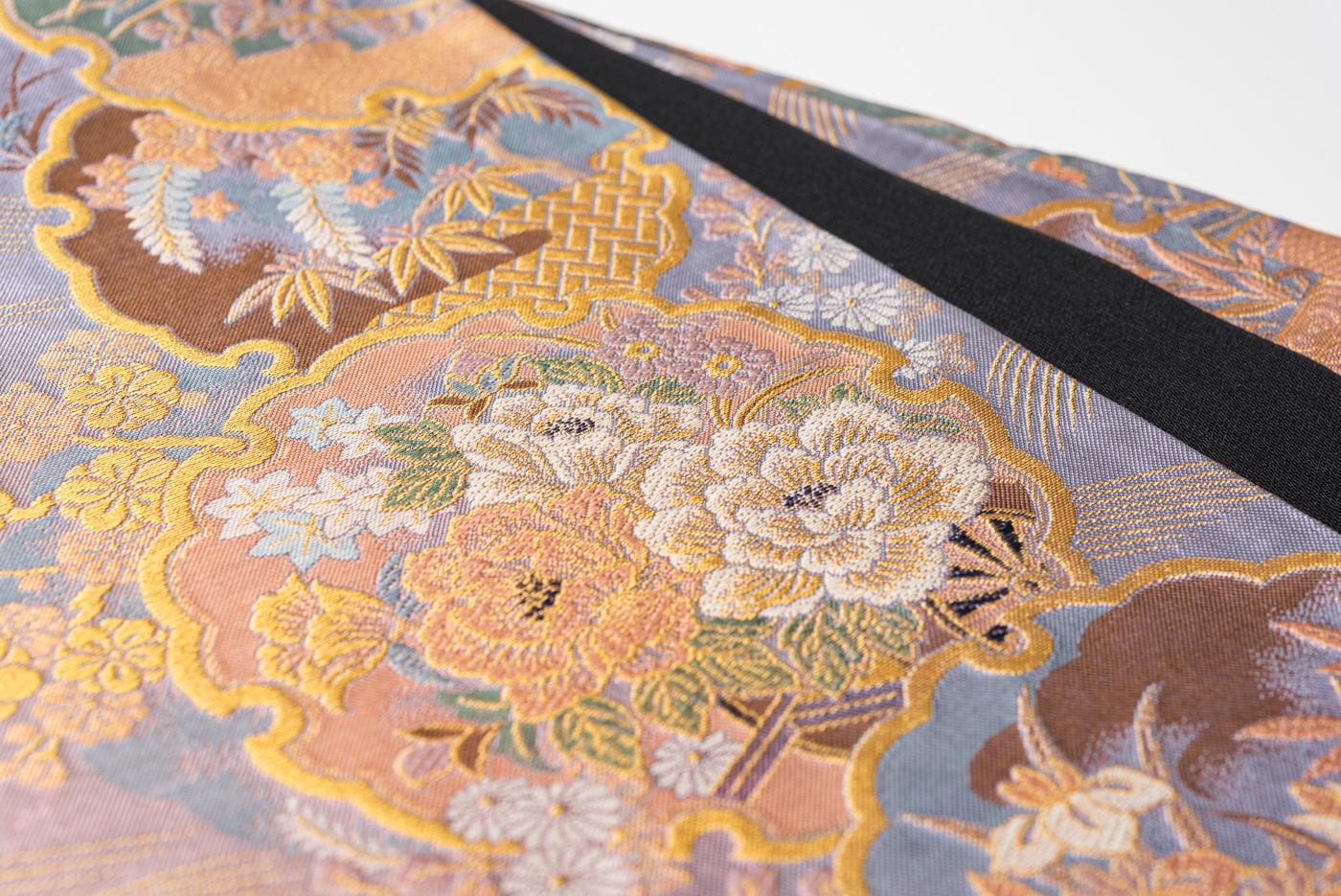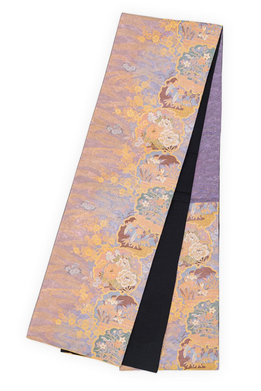 雪輪に牡丹、藤、桔梗などの花を添えた袋帯です。