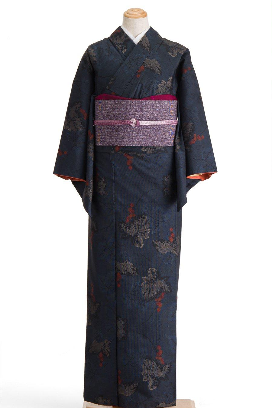 紺地に葡萄模様を織り出した紬の着物です。