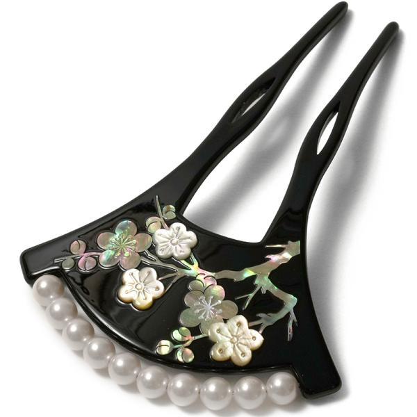 かんざし 螺鈿 梅 枝 パール 蒔絵風 黒 バチ型 花 フォーマル 髪飾り ヘアアクセサリー 和装 振袖 浴衣